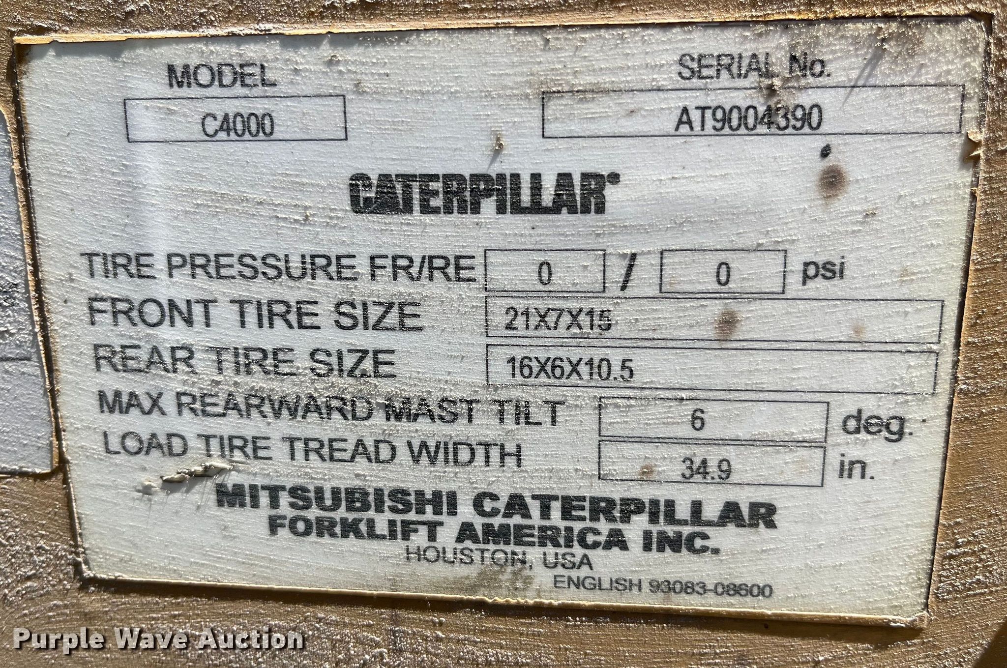 Purple Wave is selling a used Warehouse Forklift in Missouri. This item is a Caterpillar C4000 forklift with the following: Hours: 8,481 on meter, Serial: AT9004390