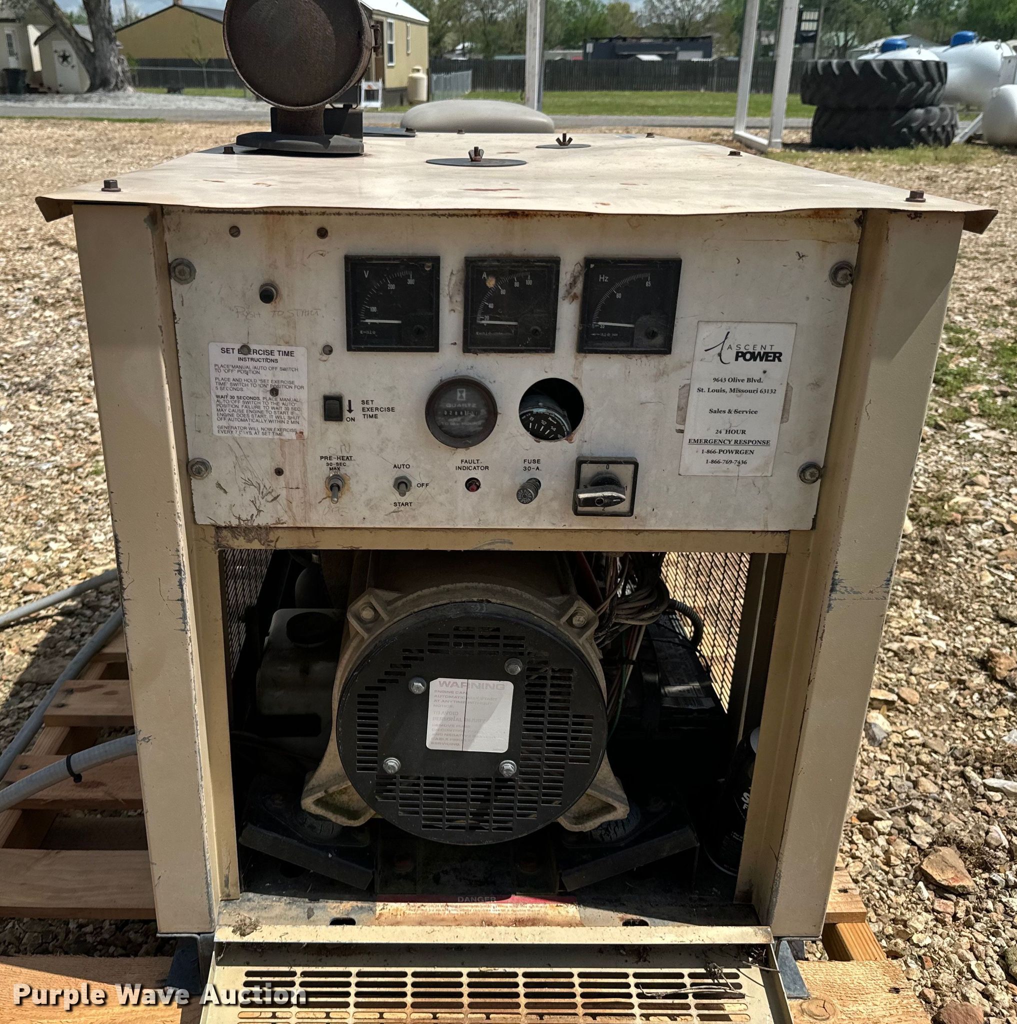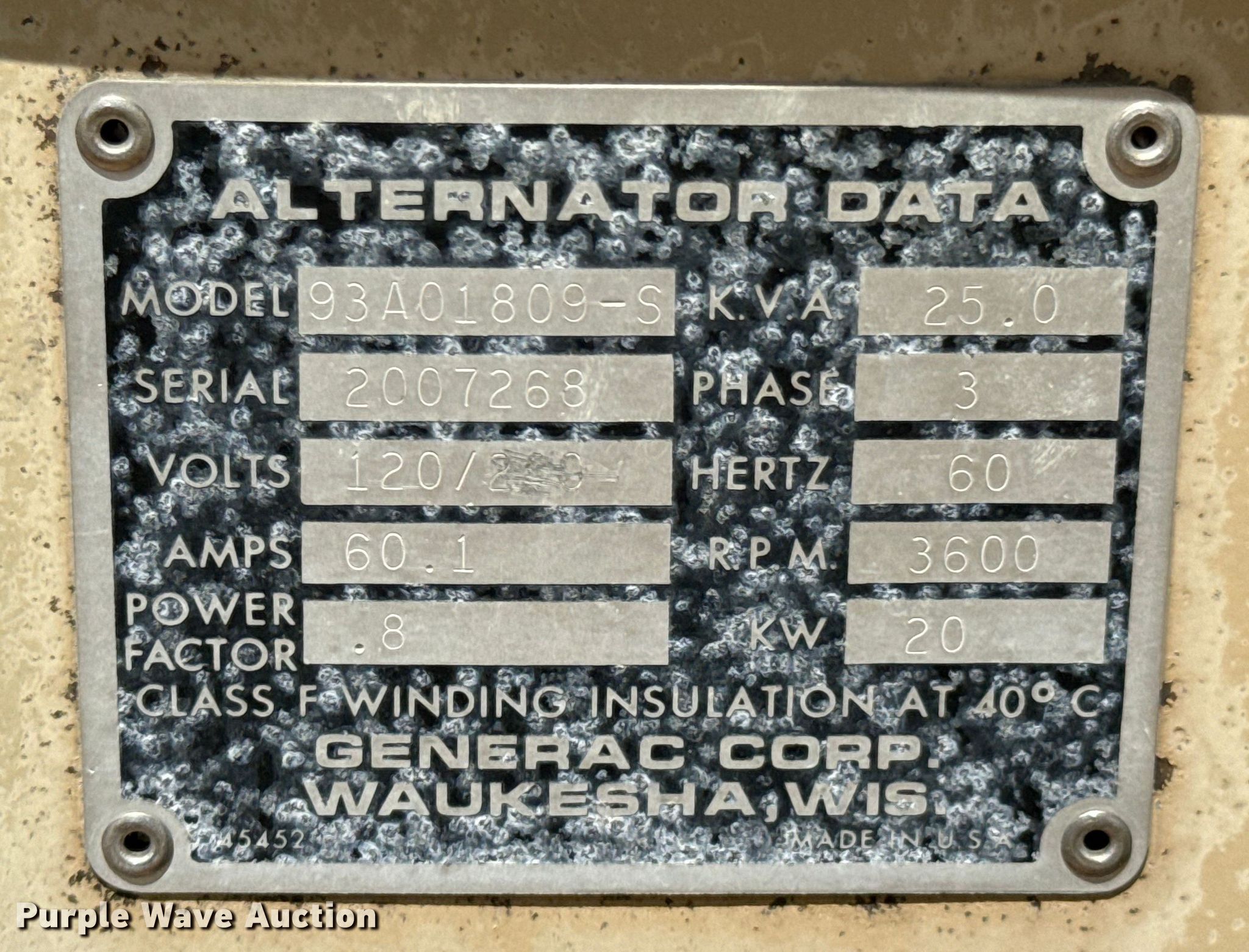 1993 Generac 93A01809-S generator. Hours: 289 on meter, Serial: 2007268. Engine Cylinders: 4, Fuel type: LPG. Electric Motor Volts: 120/240. Features Generator Generac, kVA: 25, kW: 20, Phase: Three, Backup start, Electric start, Skid mounted. Title distribution may be delayed up to 14 days from verification of funds. Jay, OK 74346