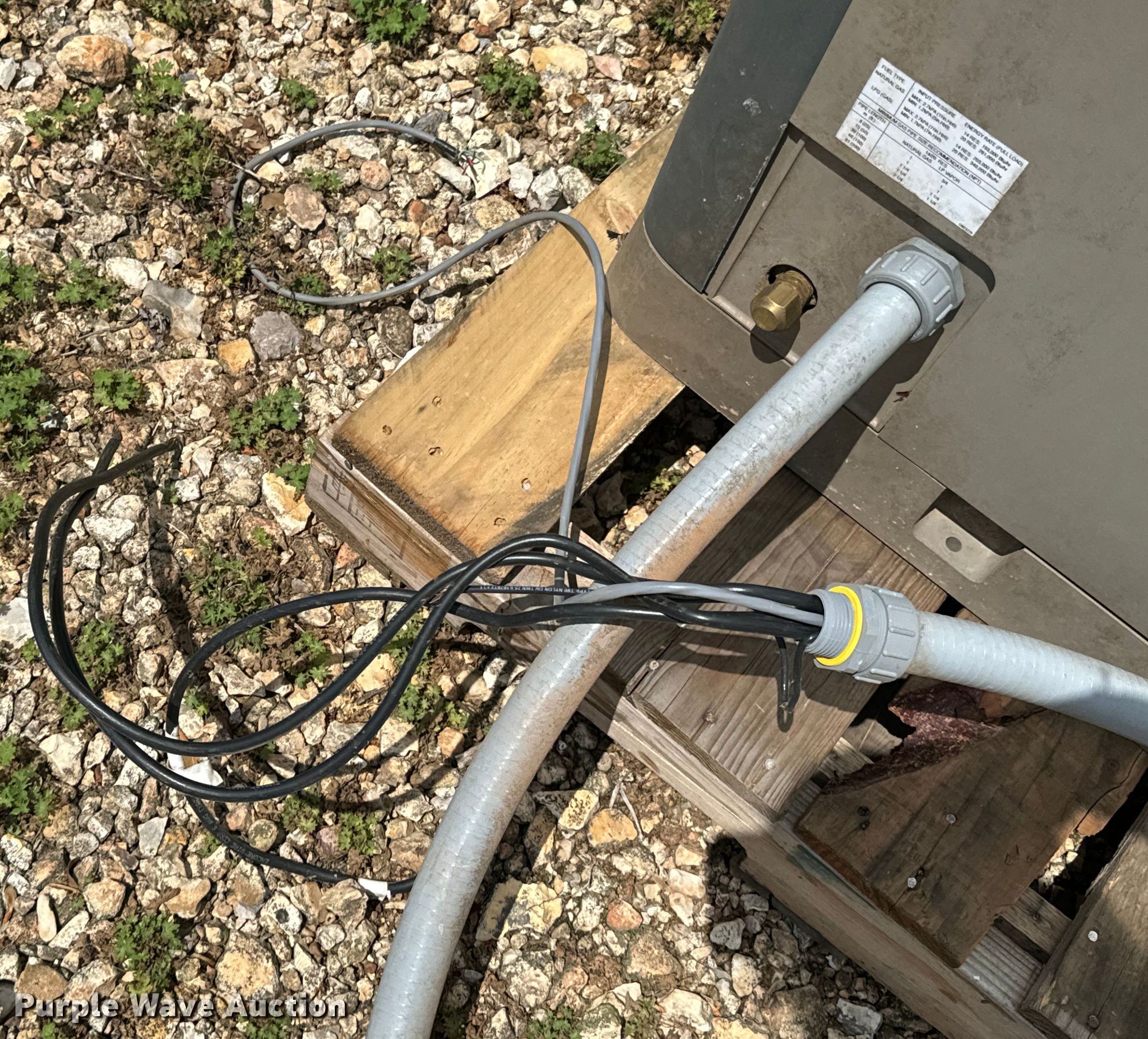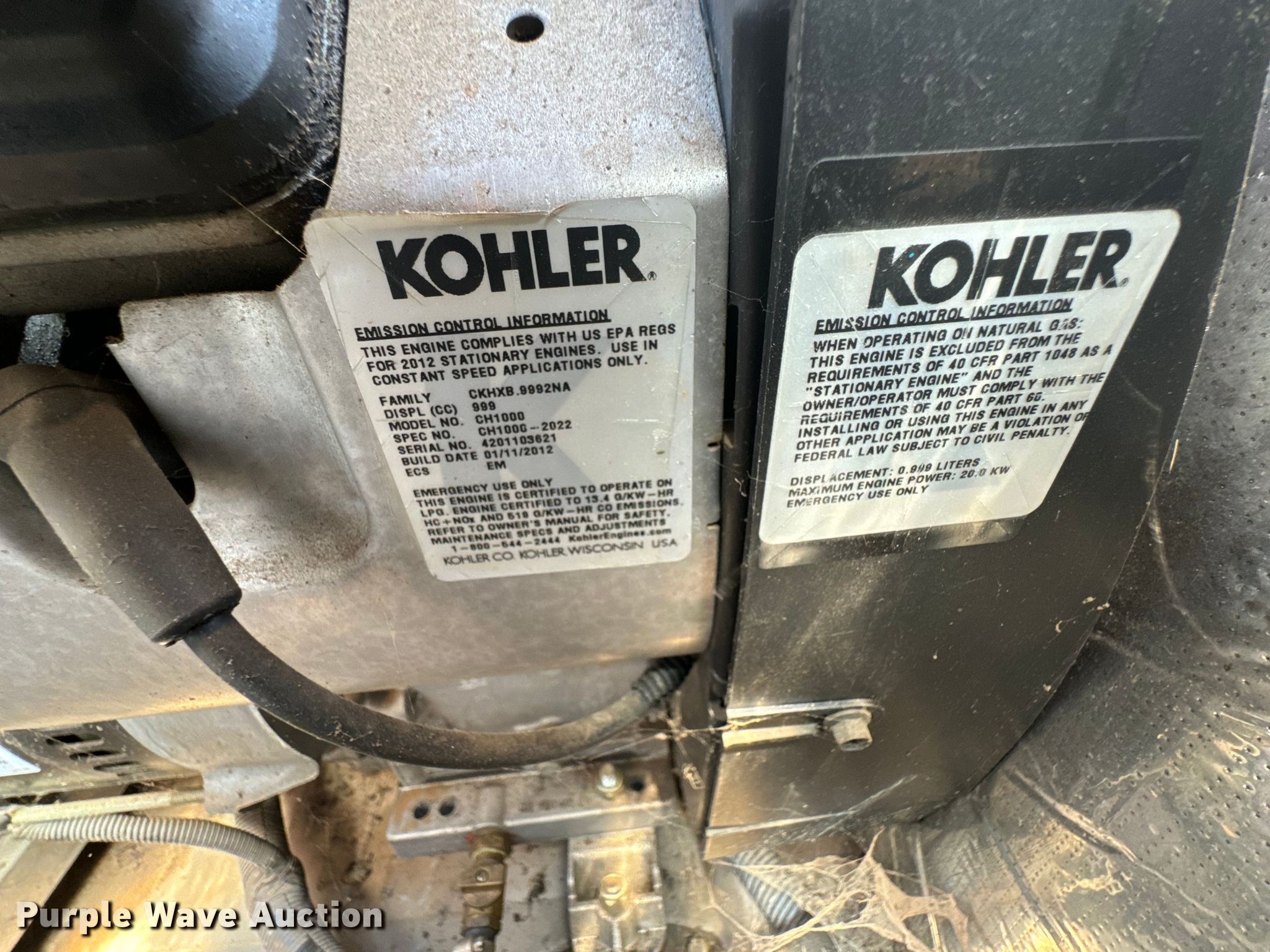2012 Kohler 20RESAL generator. Hours: Unknown, Serial: 3037546. Engine Kohler CH1000, Serial: 4201103621, Displacement: 999cc, Cylinders: 2, Fuel type: LPG, Natural gas. Electric Motor Volts: 120/240. Features Generator Kohler 2F7, kVA: 18, kW: 18, Phase: Single, Backup start, Electric start, Skid mounted. Notes Battery missing. Jay, OK 74346