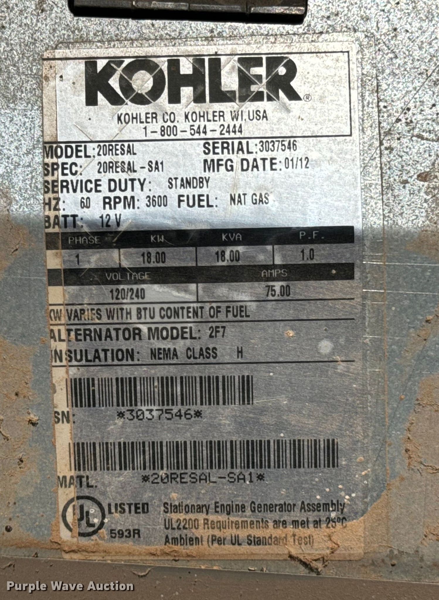 Purple Wave is selling a used Generator Set in Oklahoma. This item is a 2012 Kohler 20RESAL generator with the following: Hours: Unknown, Serial: 3037546