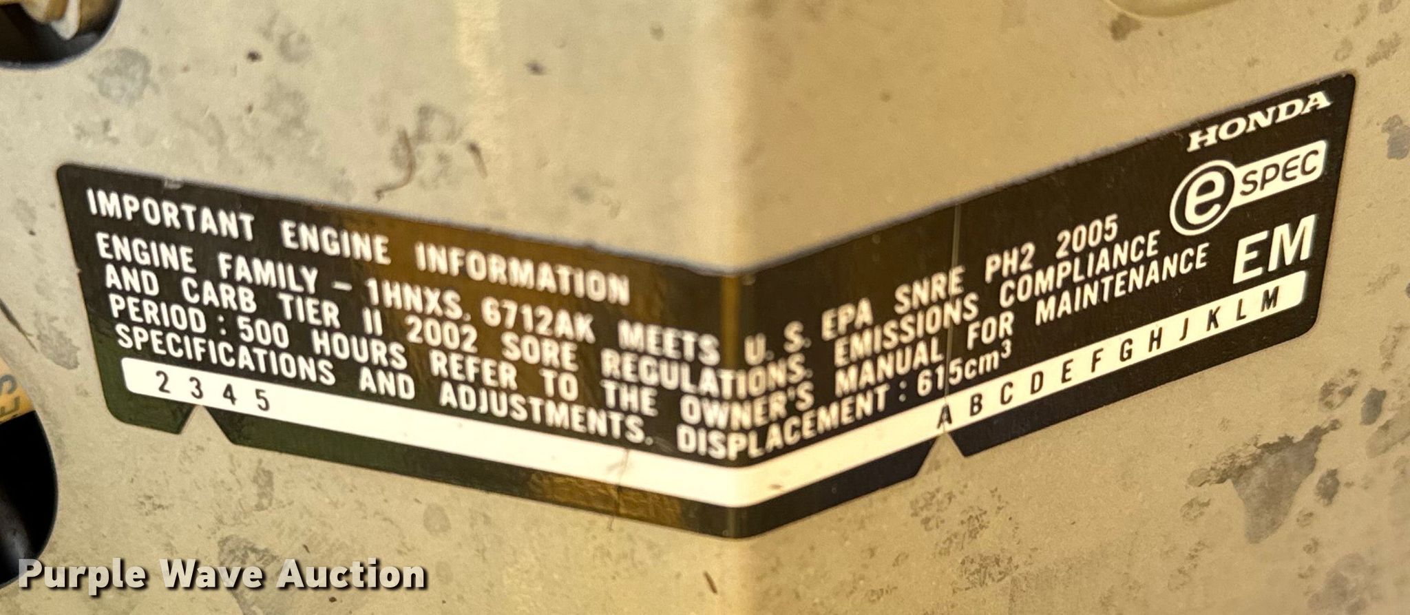 Hustler Fastrak 926592 ZTR lawn mower. Cutting width: 52", Serial: 03047191. Engine Honda, Displacement: 615 cc, Cylinders: 2, Fuel type: Gas, HP: 18. Transmission Hydrostatic. Tires Front: 11x4.00-5, Rear: 18x9.50-8. Notes No hour meter. Sedgwick, KS 67135