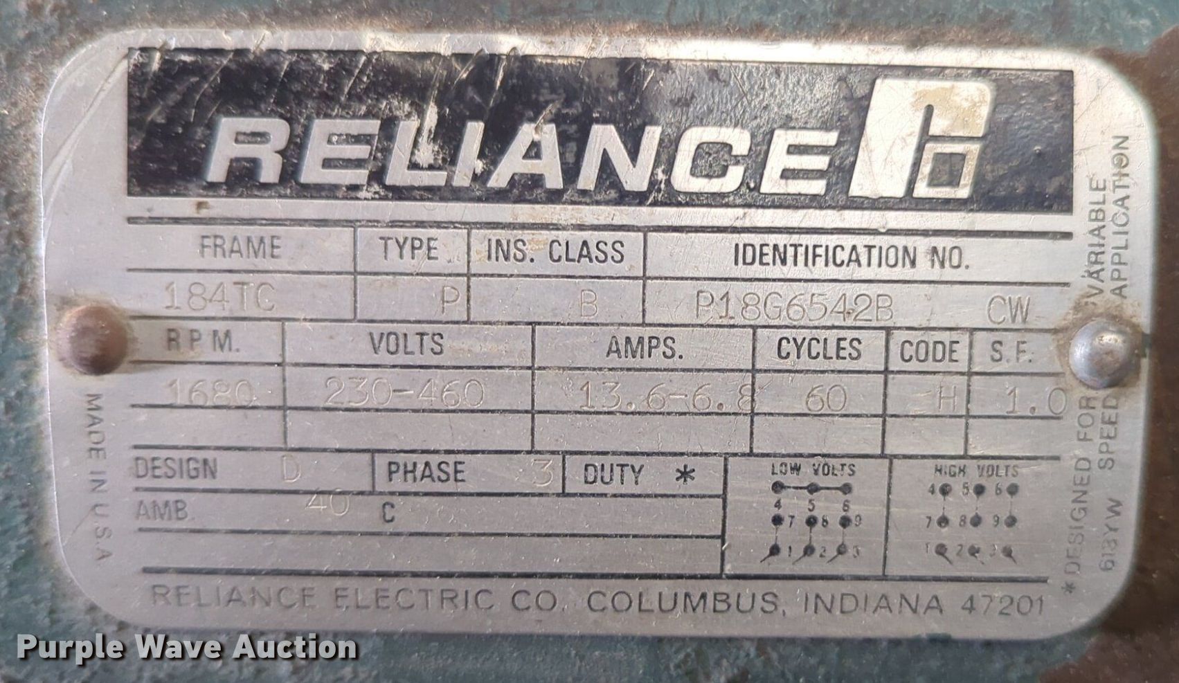 Purple Wave is selling a used Electric Motor in Oklahoma. This item is a Reliance 184TC electric motor with the following: Serial: P18G6542B, Volts: 230/460, Phase: Three