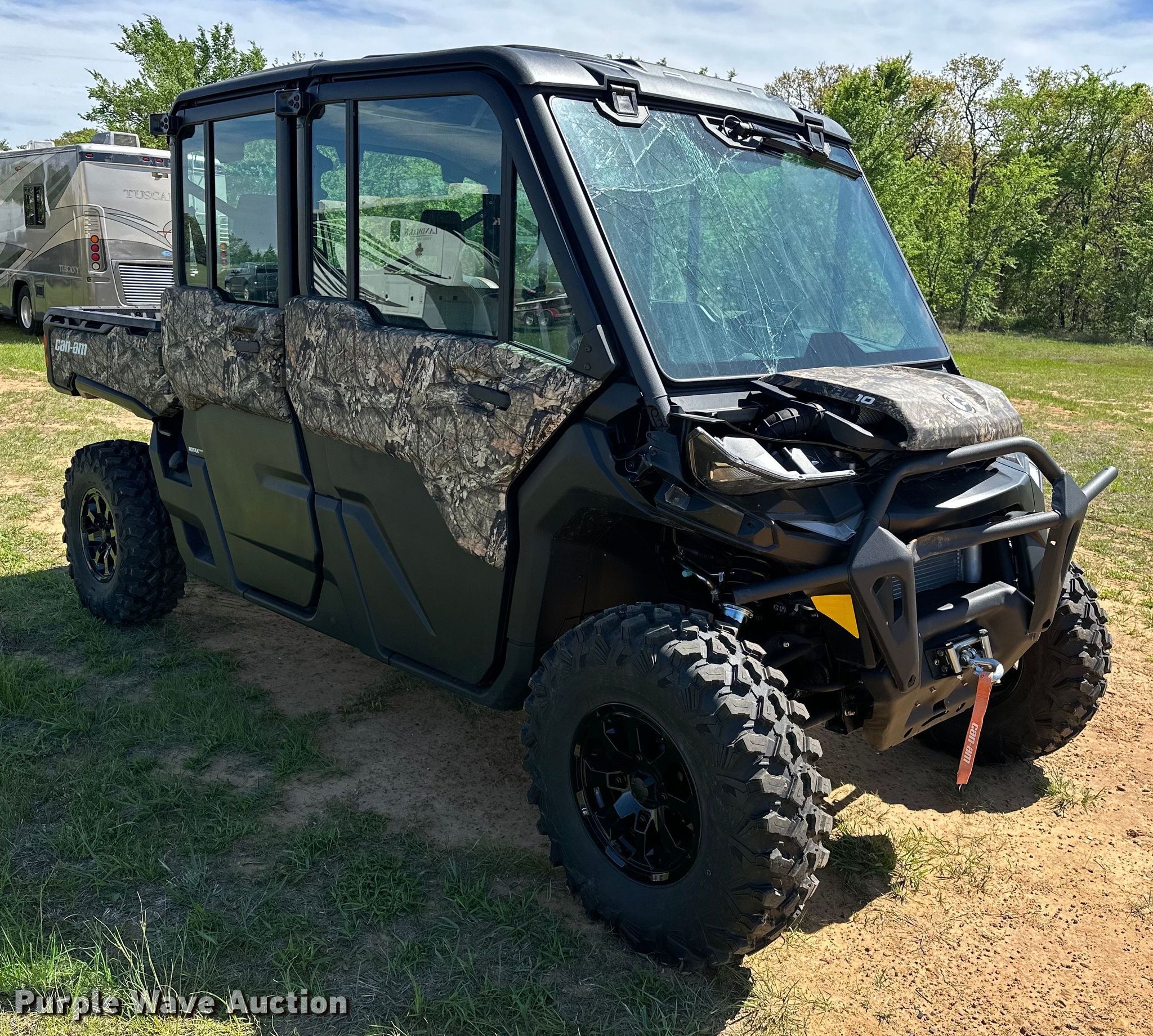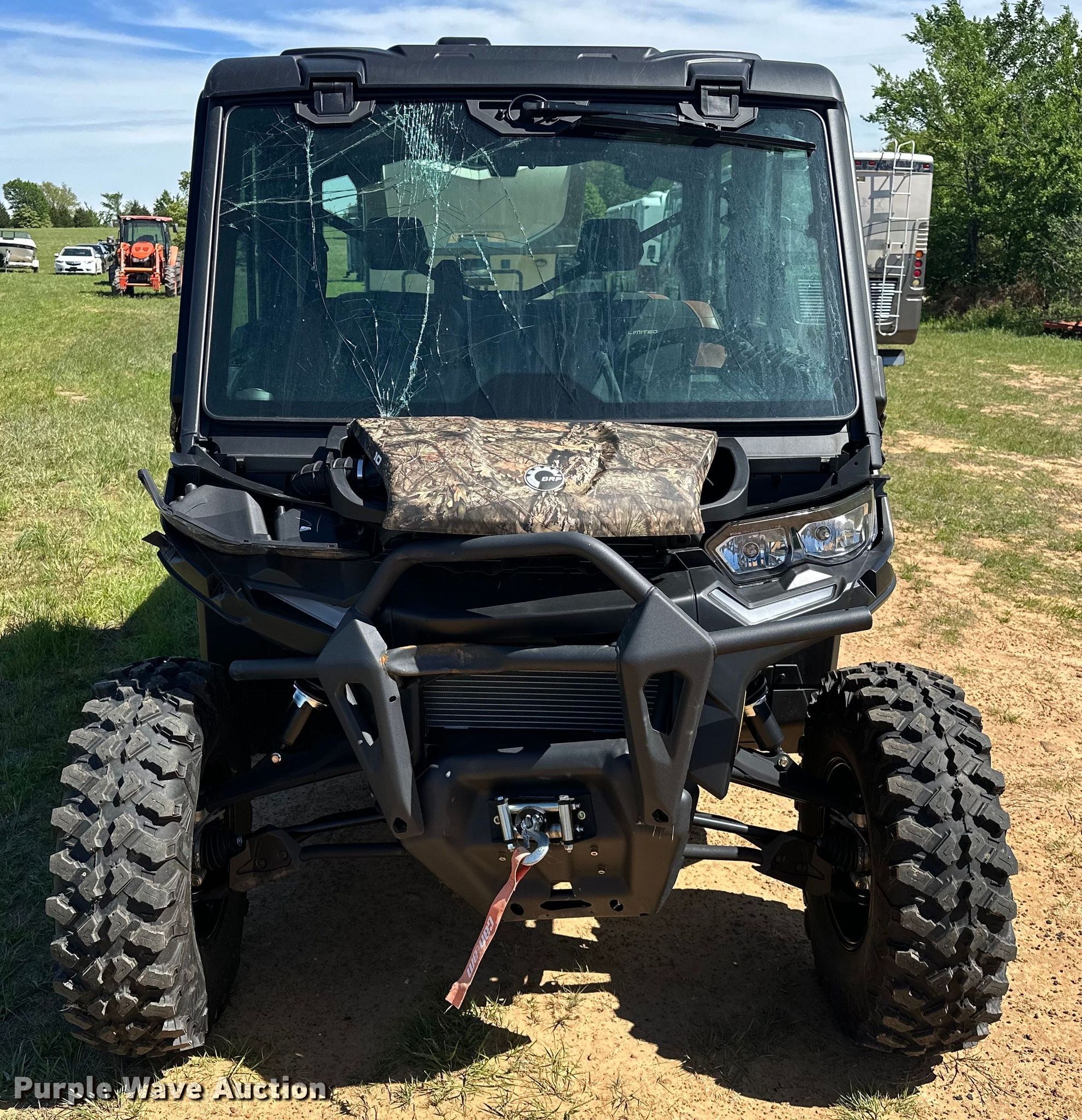 2023 Can-Am Defender Max Limited utility vehicle. Miles: 90 on odometer, Hours: 25 on meter, VIN: 3JBUUAX41PK008697, Insurance salvage unit claim #: 3-820943. Engine Cylinders: 2, Fuel type: Gas, Electric start. Transmission Automatic. Chassis Four wheel drive/ All wheel drive. Operators station Enclosed cab, AC, Heat. Features Winch, Grille guard, Receiver hitch, Dump bed 37.5" L x 56" W, Dump bed type: Manual. Tires Front: 30x9.00R14, Rear: 30x10.00R14. Notes Collision damage, Front bumper damaged, Windshield cracked, Transmission issues, non-operational reverse. Oklahoma title. Oklahoma Farm Bureau Insurance. Seminole, OK 74868
