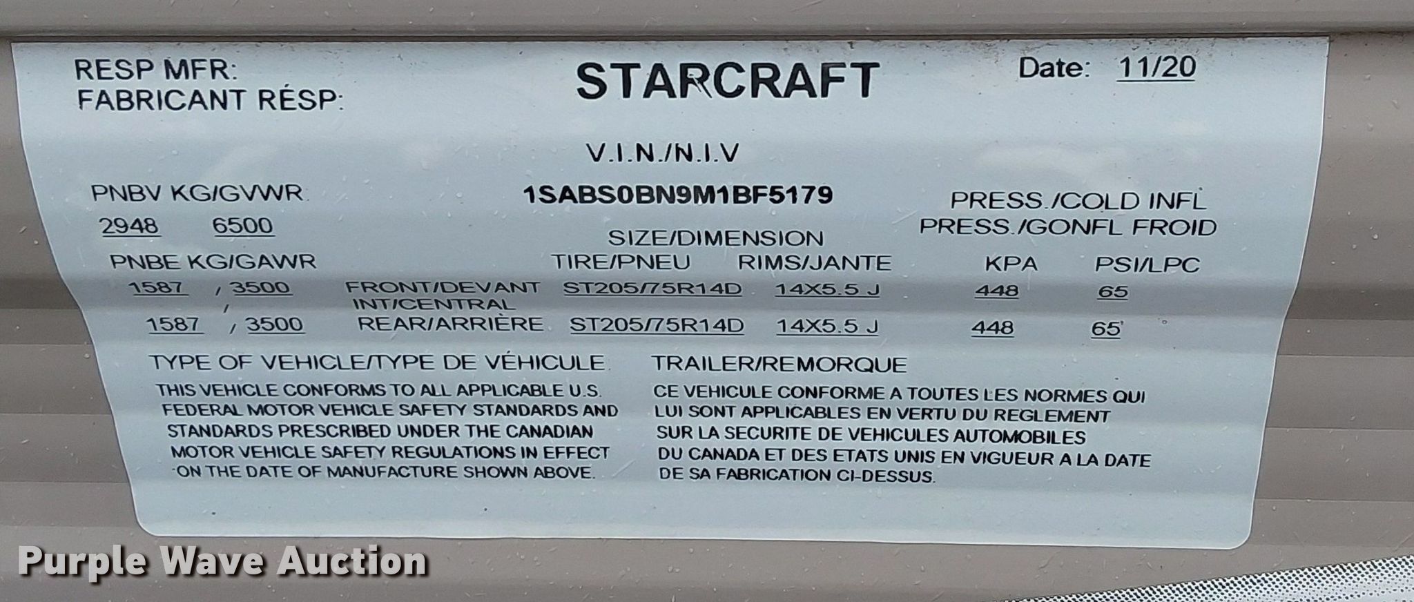 2021 Starcraft Autumn Ridge camper. Camper length: 29', VIN: 1SABS0BN9M1BF5179. Chassis Axles: Tandem, Suspension: Spring, Brakes: Electric, GVWR: 6,500 lbs, GAWR: 3,500 lbs. Interior Kitchen: Sink, Refrigerator, Freezer, Microwave, Oven, Stove: Propane, Living room: Table, Couch, Pull out couch, Bathroom, Beds: 3 Bed type: King, Double, TVs: 1, Heater, AC units: 1. Features Awnings: 1 Awning type: Electric, Ball hitch: 2 5/16". Tires Size: ST205/75R14. Notes Dead battery. Oklahoma title. Title has a lien that will be released following the close of the auction. Title distribution may be delayed up to 30 days from verification of funds. SWH Construction. 18935 Selah Way. Norman, OK 73072
