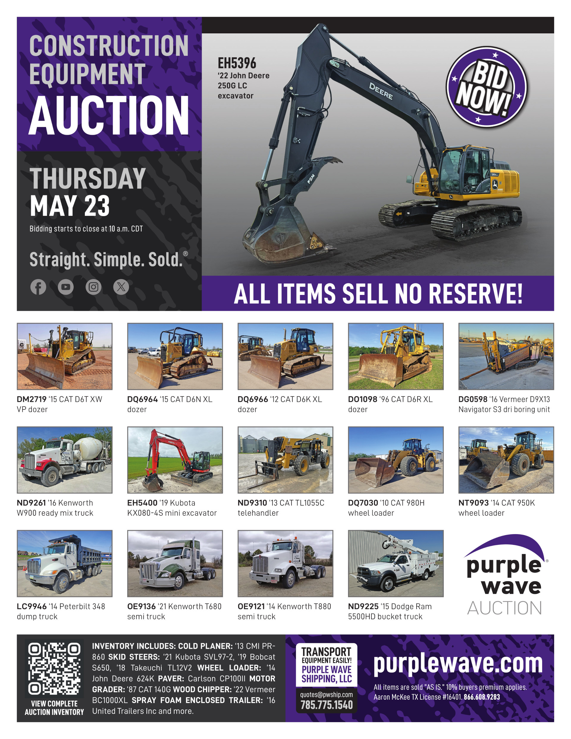 Purple Wave attempts to give its customers an industry leading experience by providing detailed equipment listings. Listings include written descriptions, photographs, location, and consignor information. Equipment descriptions are based on our direct observation and information provided by our selling customer. All information is intended to be as accurate as possible. However, we recommend customers inspect prior to bidding. Purple Wave listings are not intended to be substitutions for inspection. The details provided may differ on equipment based on information provided by the consignor. An error or omission in the listing will not change the results of the bid. It is the responsibility of the buyer to conduct any inspection and examination necessary to satisfy the buyer of all material facts before placing a bid.