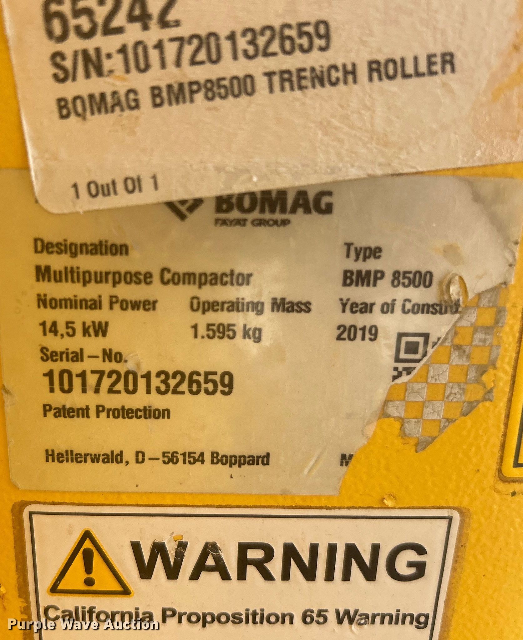 Purple Wave is selling a used Walk Behind Compactor in Oklahoma. This item is a 2019 Bomag BMP8500 trench compactor with the following: Hours: Unknown, Serial: 101720132659