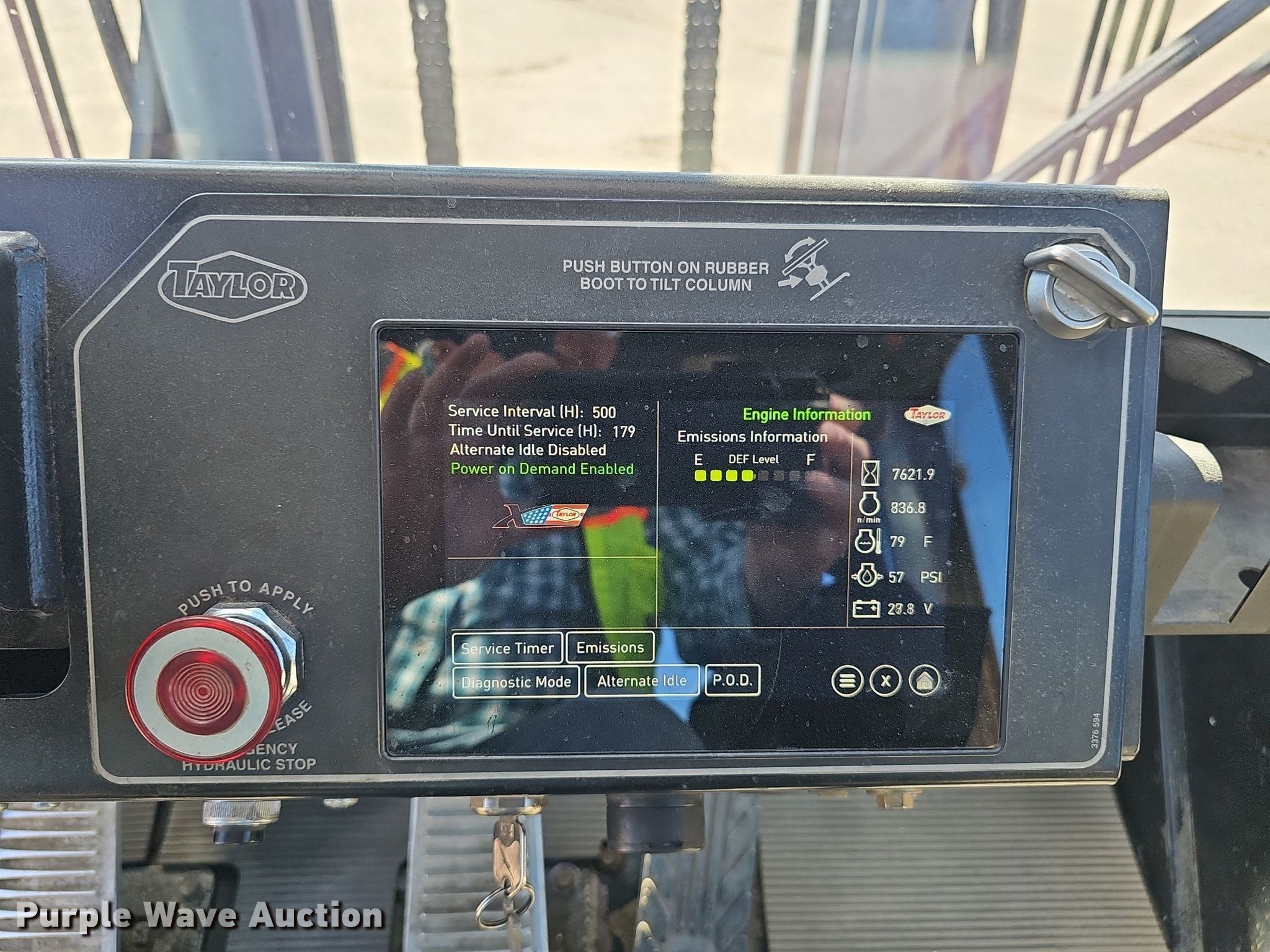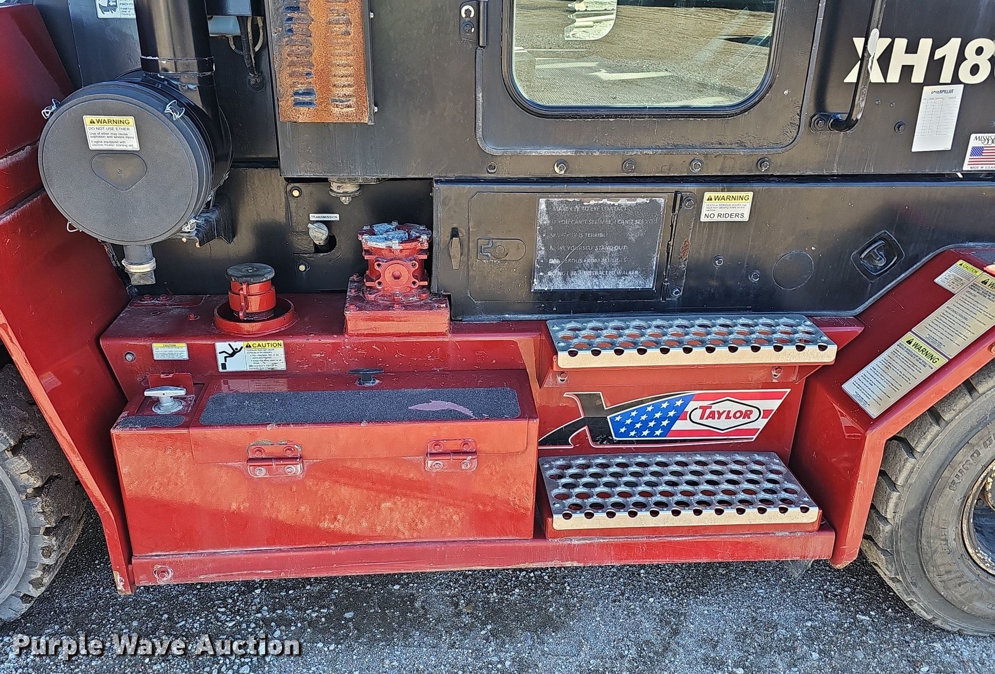 2015 Taylor XH180 forklift. Hours: 7,622 on meter, Serial: S PA 40017. Engine Cylinders: 4, Fuel type: Diesel. Transmission Powershift. Operators station Enclosed cab, AC, Heat. Features Maximum lift capacity: 18,300 lbs, Maximum lift height: 216", Mast stages: 2, Side shift, Mast tilt, Fork length: 96". Tires Front: 8.25x15NHS, Rear: 8.25-15. Rion Equipment. Omaha, NE 68136