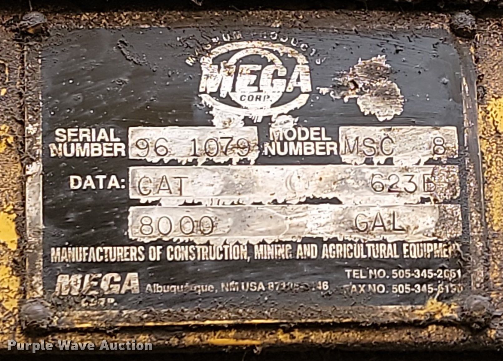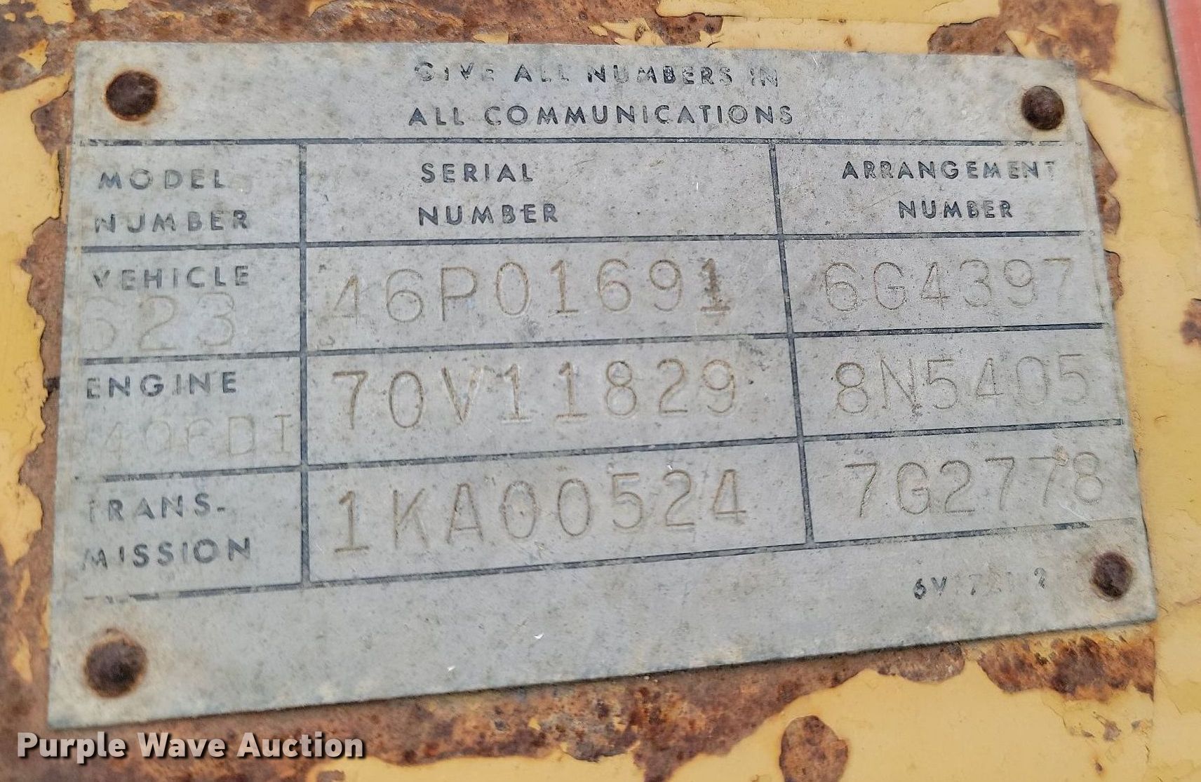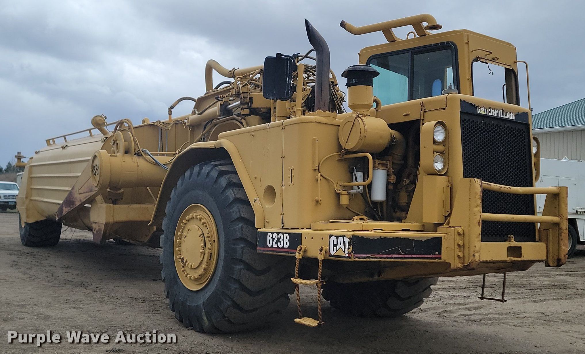1981 Caterpillar 623B water wagon. Hours: 20,834 on meter, Serial: 46P01691. Engine Caterpillar 3406DI, Cylinders: 6, Fuel type: Diesel. Transmission Powershift, 8F - 1R. Features Water tank Capacity: 8,000 gallons, Spray bar: Rear, In-cab spray controls. Tires Size: 29.5-29. View repairs. Guthmiller and Son Dirtworks. Bismarck, ND 58504