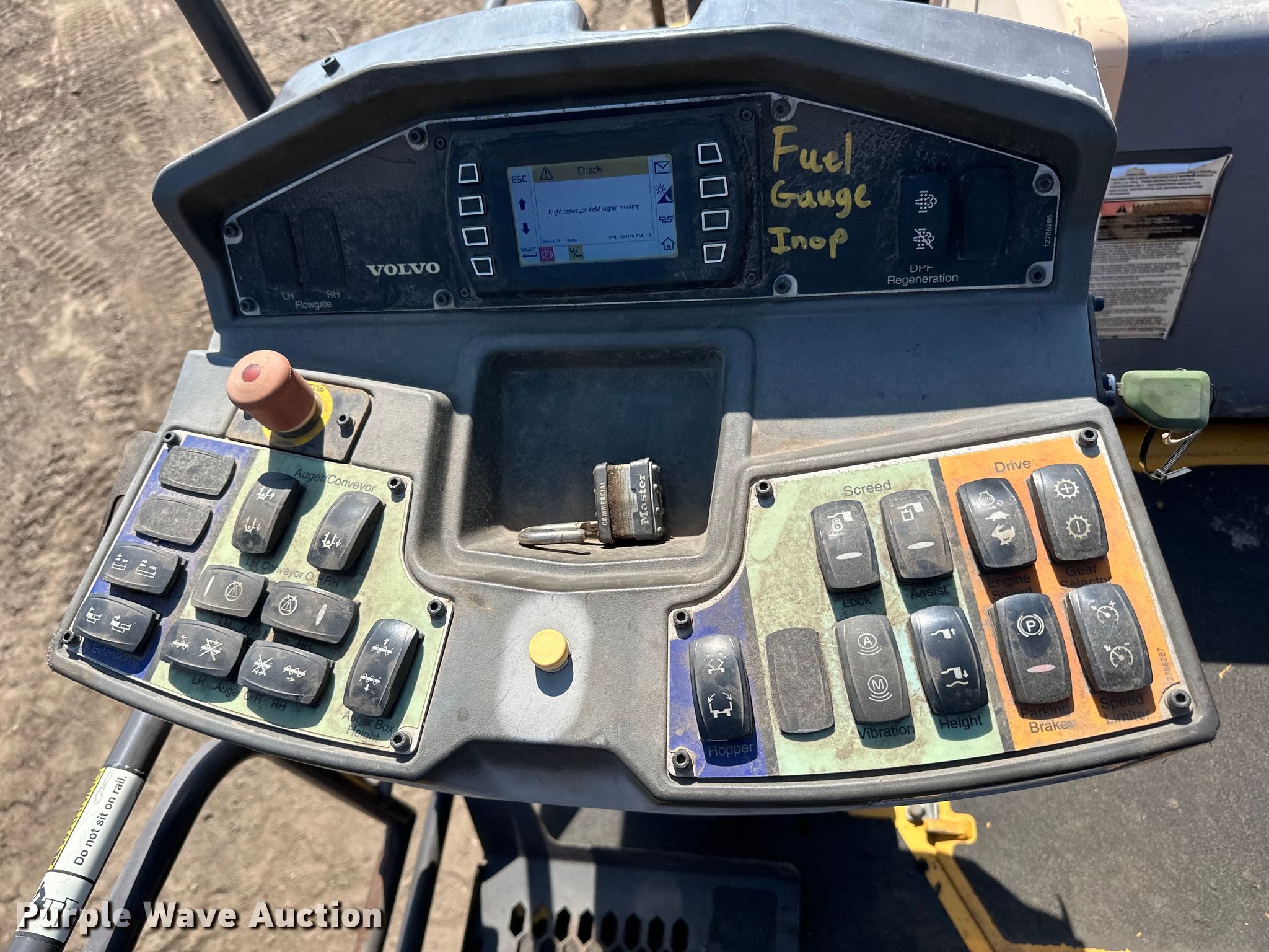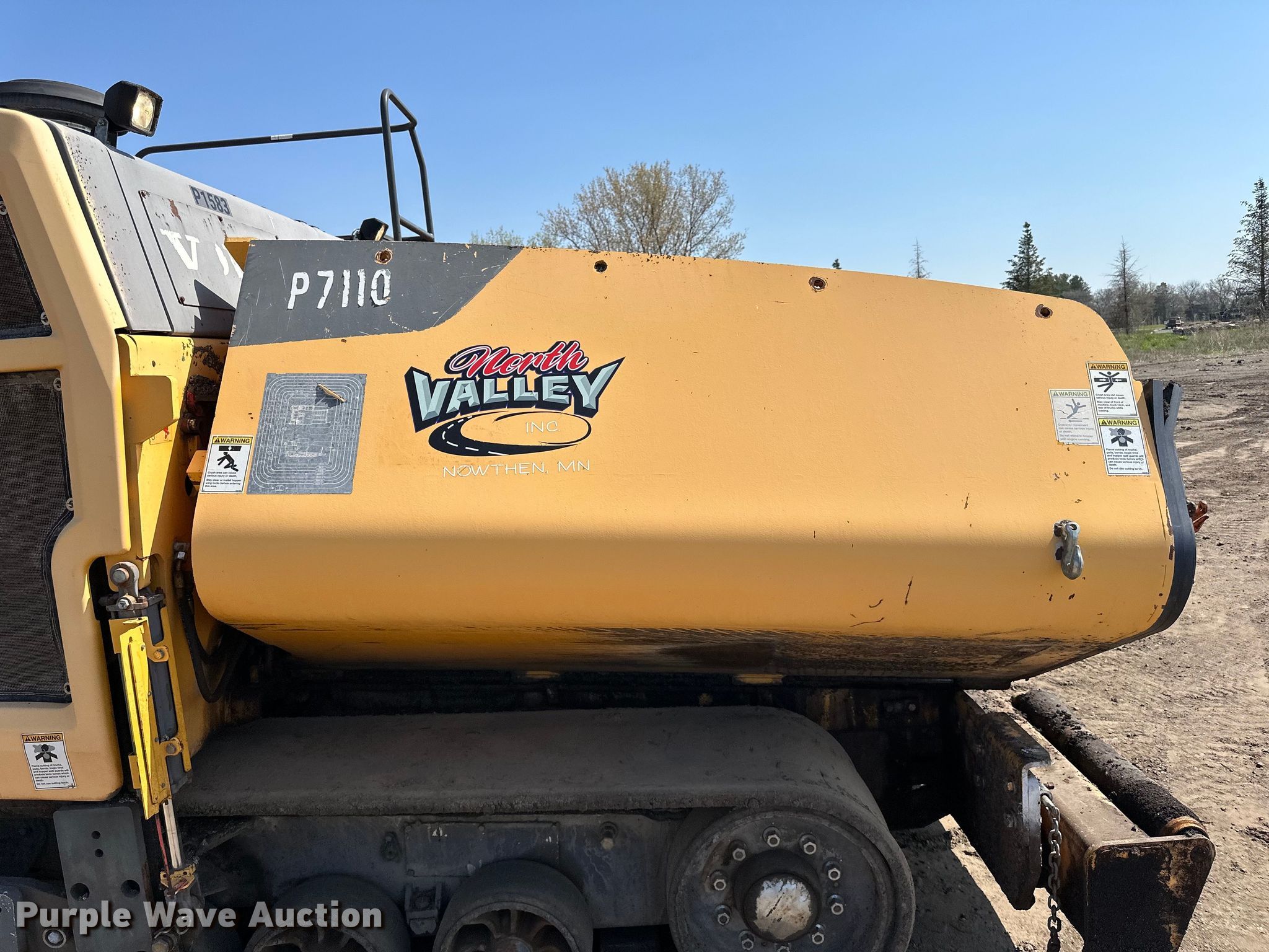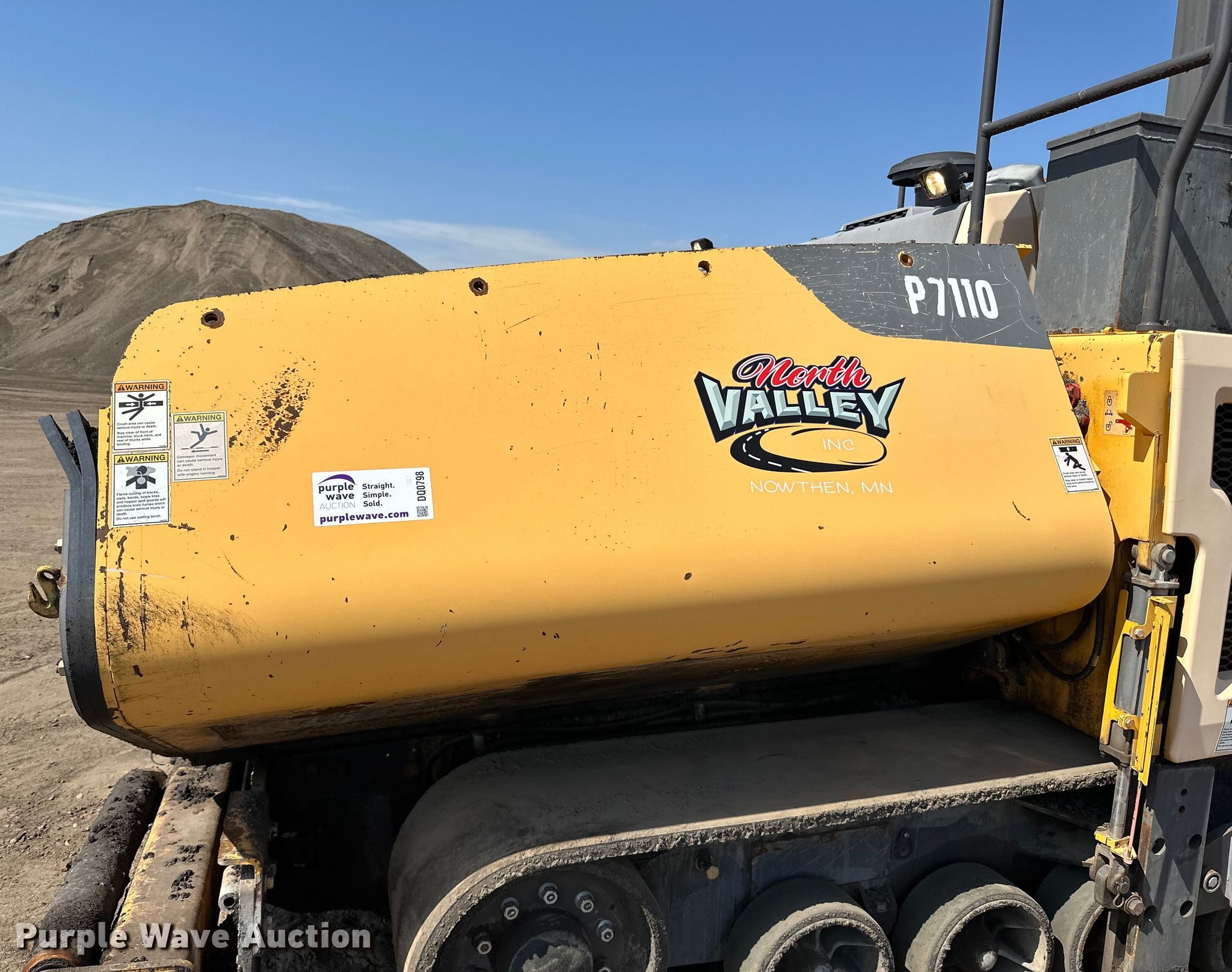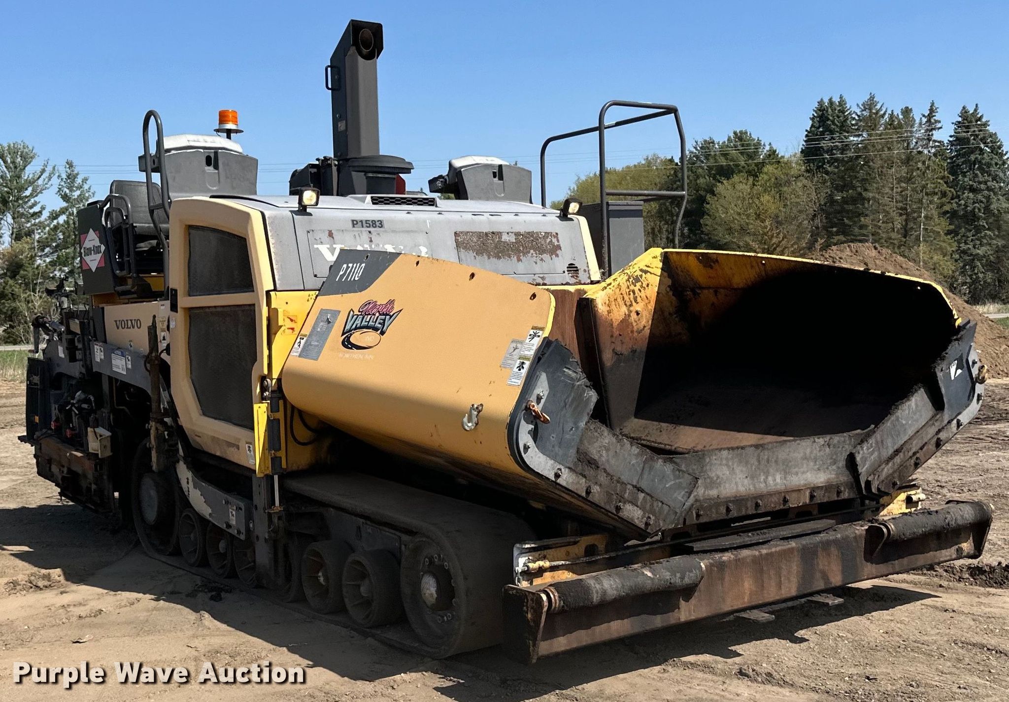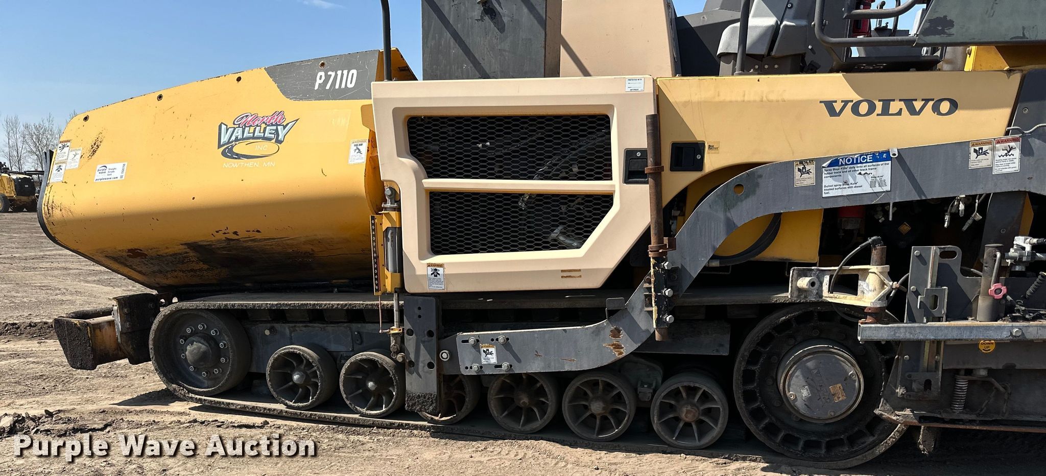 2014 Volvo P7110 paver. Hours: 3,143 on meter, Serial: VCEP7110C0S385017. Engine Volvo D8H, Serial: 11410156, Displacement: 7.75L, Fuel type: Diesel, HP: 235, kW: 175. Transmission Hydrostatic. Features Screed Volvo Omni 318, Serial: 3184100592, Paving width: 10' to 18', Extensions Quantity: 2, Screed heater: Electric, Sonic Moba Sonic III, Serial: 12609-077-077, Front spread hopper width: 10.5', Material conveyor Width: 60", Wash down system, Ground level remote, Grade and slope controls. Tracks Width: 19", Rubber. North Valley Inc. Elk River, MN 55330