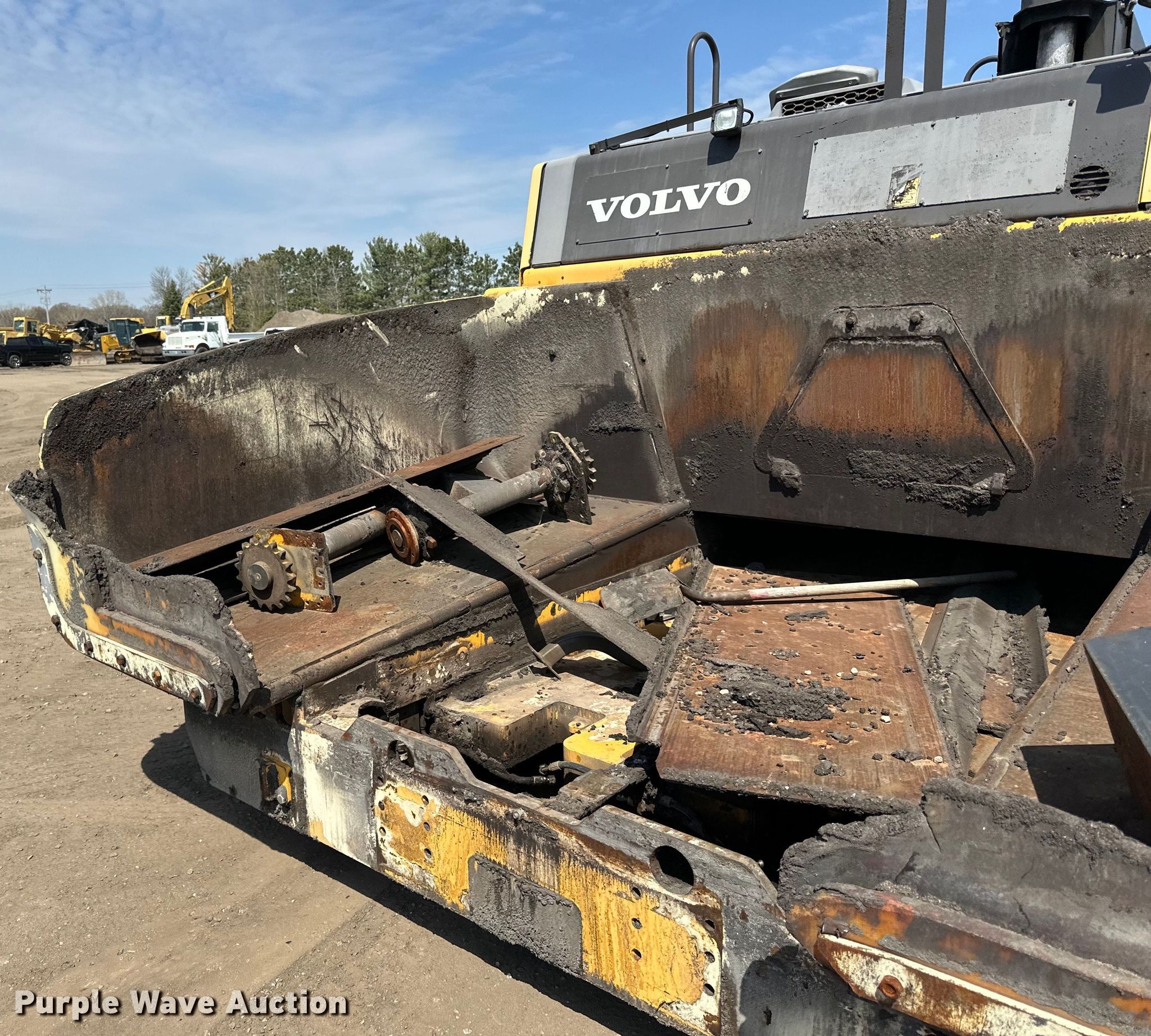 2016 Volvo P7110 paver. Hours: 5,069 on meter, Serial: VCEP7110H05385069. Engine Volvo D8H, Serial: 11696155, Displacement: 7.75L, Cylinders: 6, Fuel type: Diesel, HP: 235, kW: 175. Transmission Hydrostatic. Features Screed Volvo Omni 318, Serial: 3184100403, Paving width: 10' to 18', Extensions Quantity: 2, Screed heater: Electric, Sonic Moba Sonic III, Front spread hopper width: 10.5', Width: 60", Wash down system, Ground level remote. Tracks Width: 19", Rubber. Notes Screed disconnected Parts missing, Material conveyor missing, Parts only. North Valley Inc. Elk River, MN 55330
