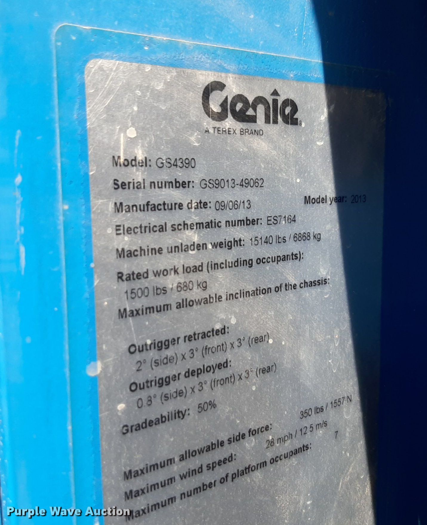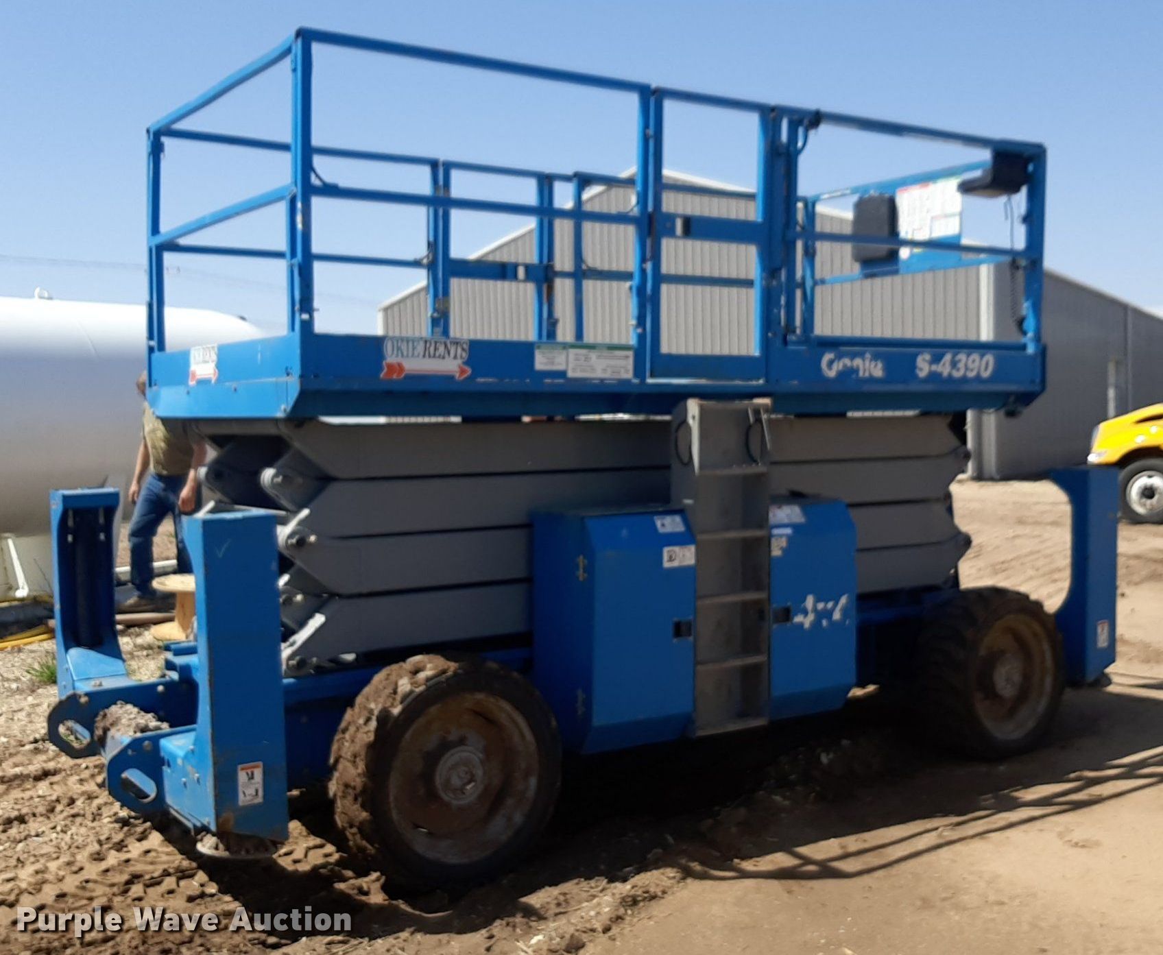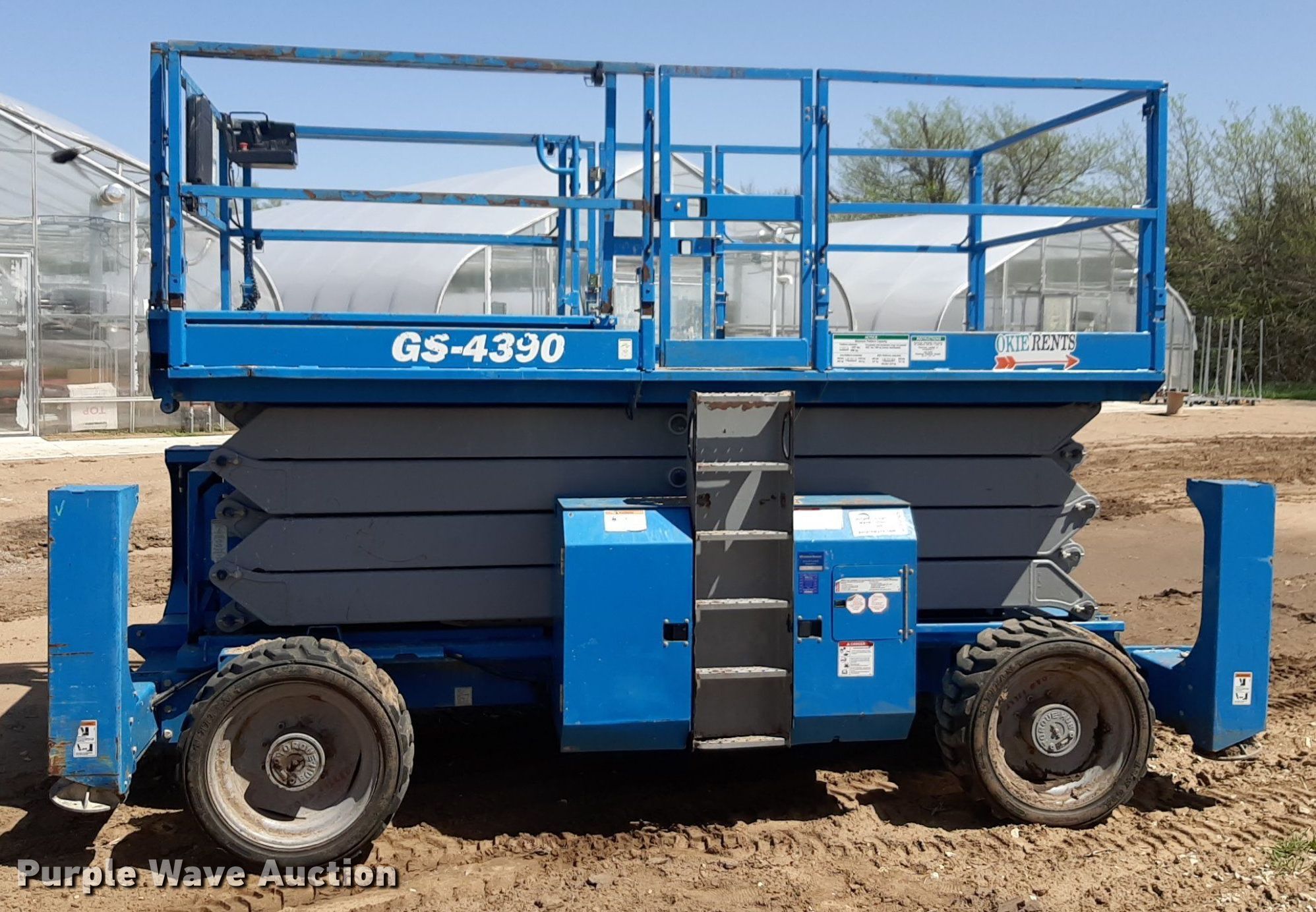 Purple Wave is selling a used Scissor or Vertical Lift in Kansas. This item is a 2013 Genie GS-4390 RT scissor lift with the following: Hours: 3,055 on meter, Serial: GS9013-49062