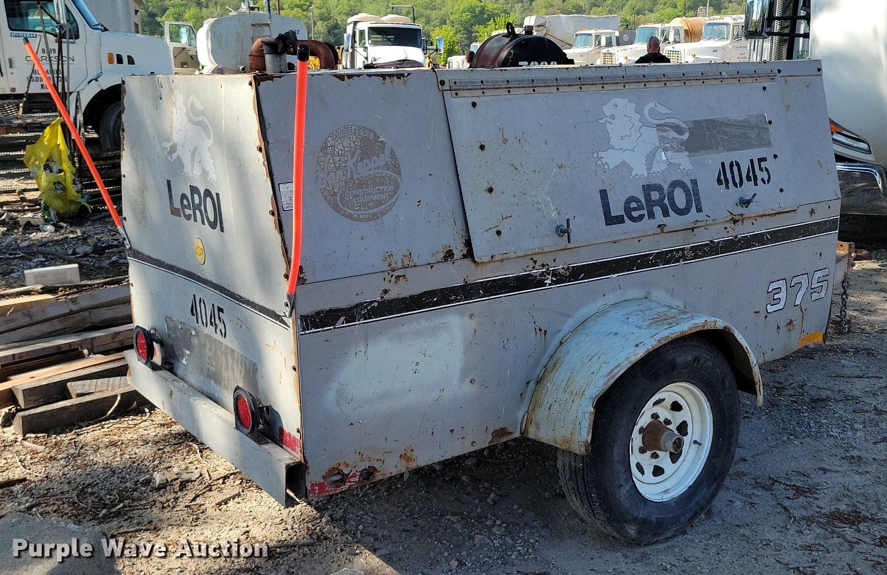1996 LeRoi 375 air compressor. Hours: 4,417 on meter, Serial: 3304X205. Engine Cummins, Cylinders: 4, Fuel type: Diesel. Trailer Dimensions: 12' L x 72" W, Suspension: Spring, Axles: Single, Tire size: ST225/75R15. This is worksite support equipment and will not come with a title. Transfer of ownership documentation will be a bill of sale. Clarkson Construction Co.. Kansas City, MO 64120