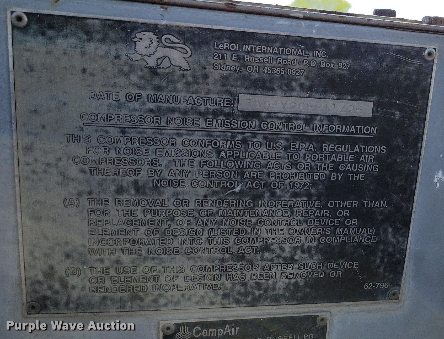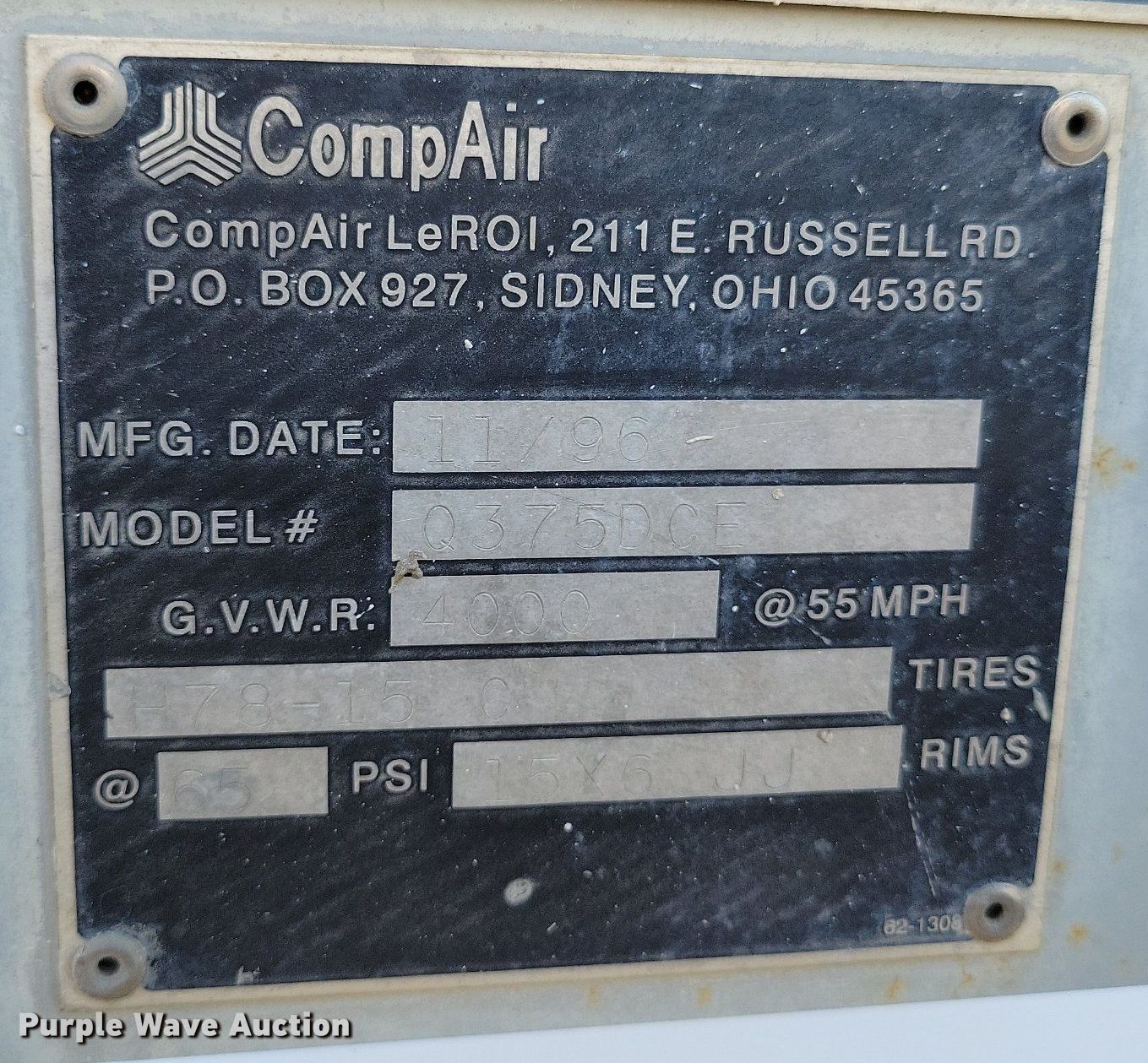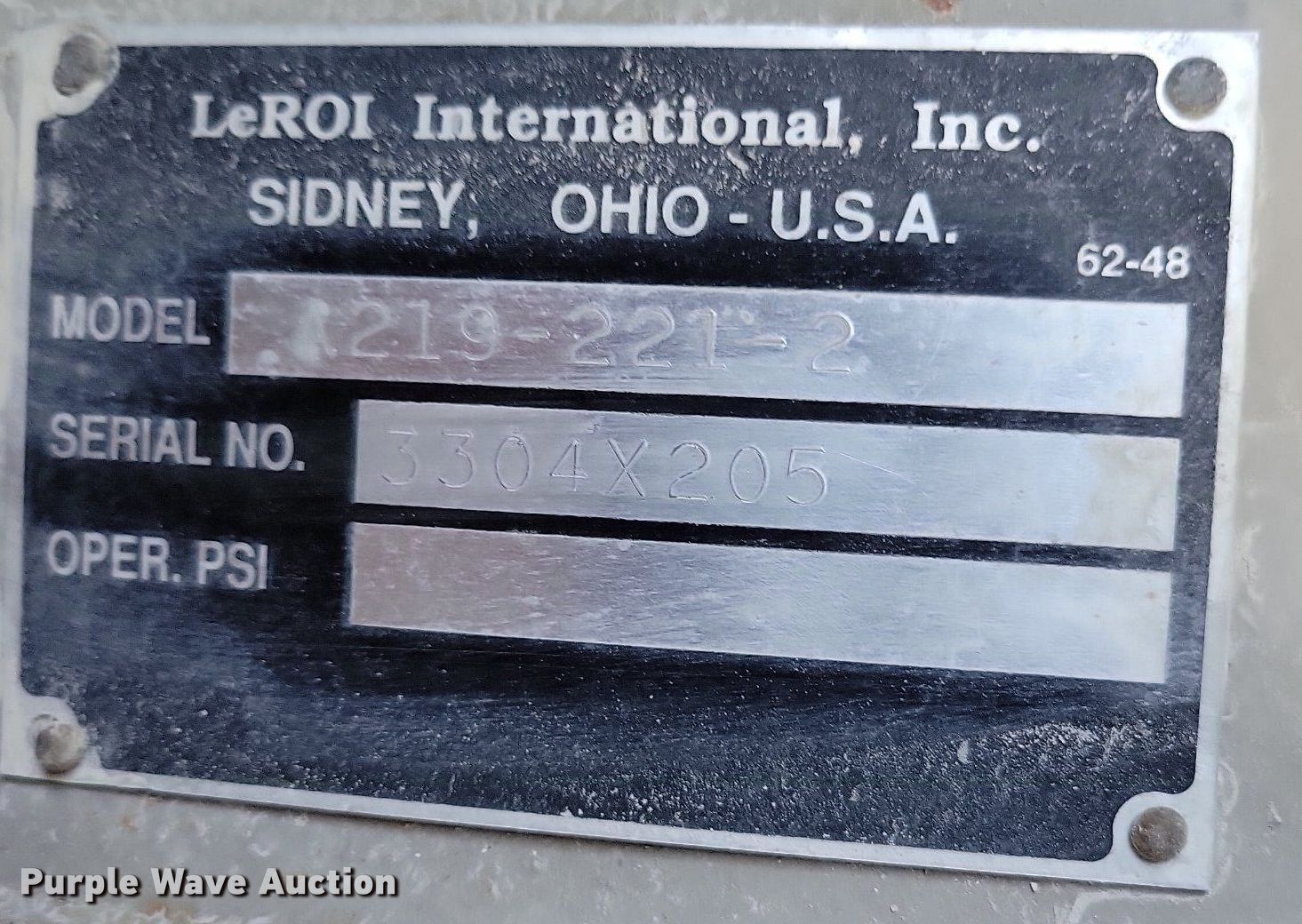 Purple Wave is selling a used Air Compressor in Missouri. This item is a 1996 LeRoi 375 air compressor with the following: Hours: 4,417 on meter, Serial: 3304X205