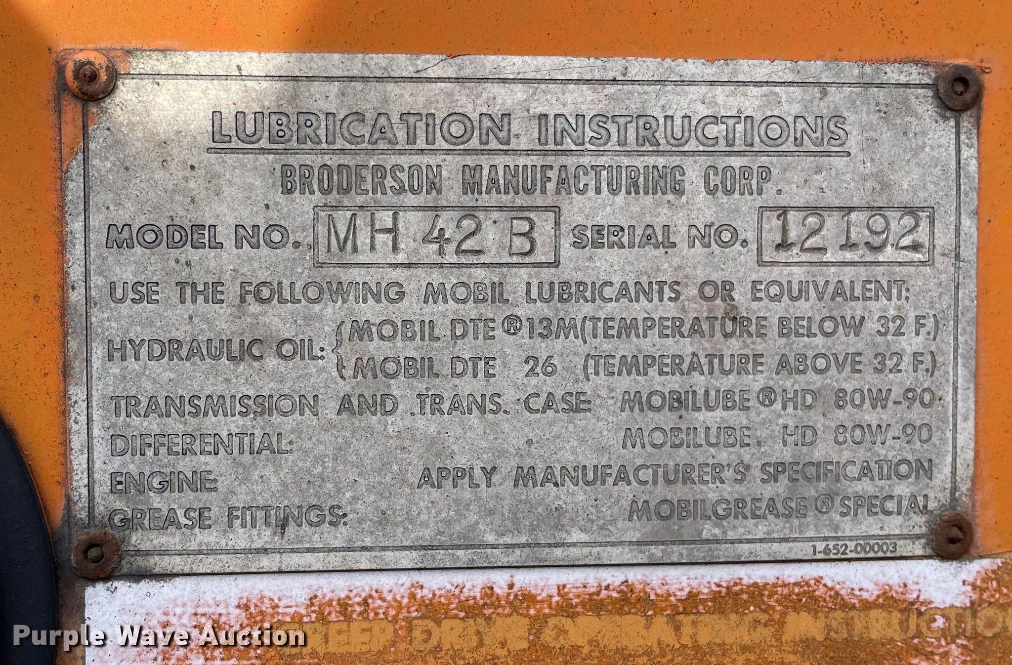 Broderson MH42B drop hammer. Hours: 2,121 on meter, Serial: 12192, Unit #: 0983. Engine John Deere, Cylinders: 4, Fuel type: Diesel. Transmission Manual. Tires Front: 8.00-16, Rear: 7.50-16. Notes Clutch issues, will not go into gear , Unknown operating condition. S.S.P. - Open Inspection May 16. Hillside, IL 60162