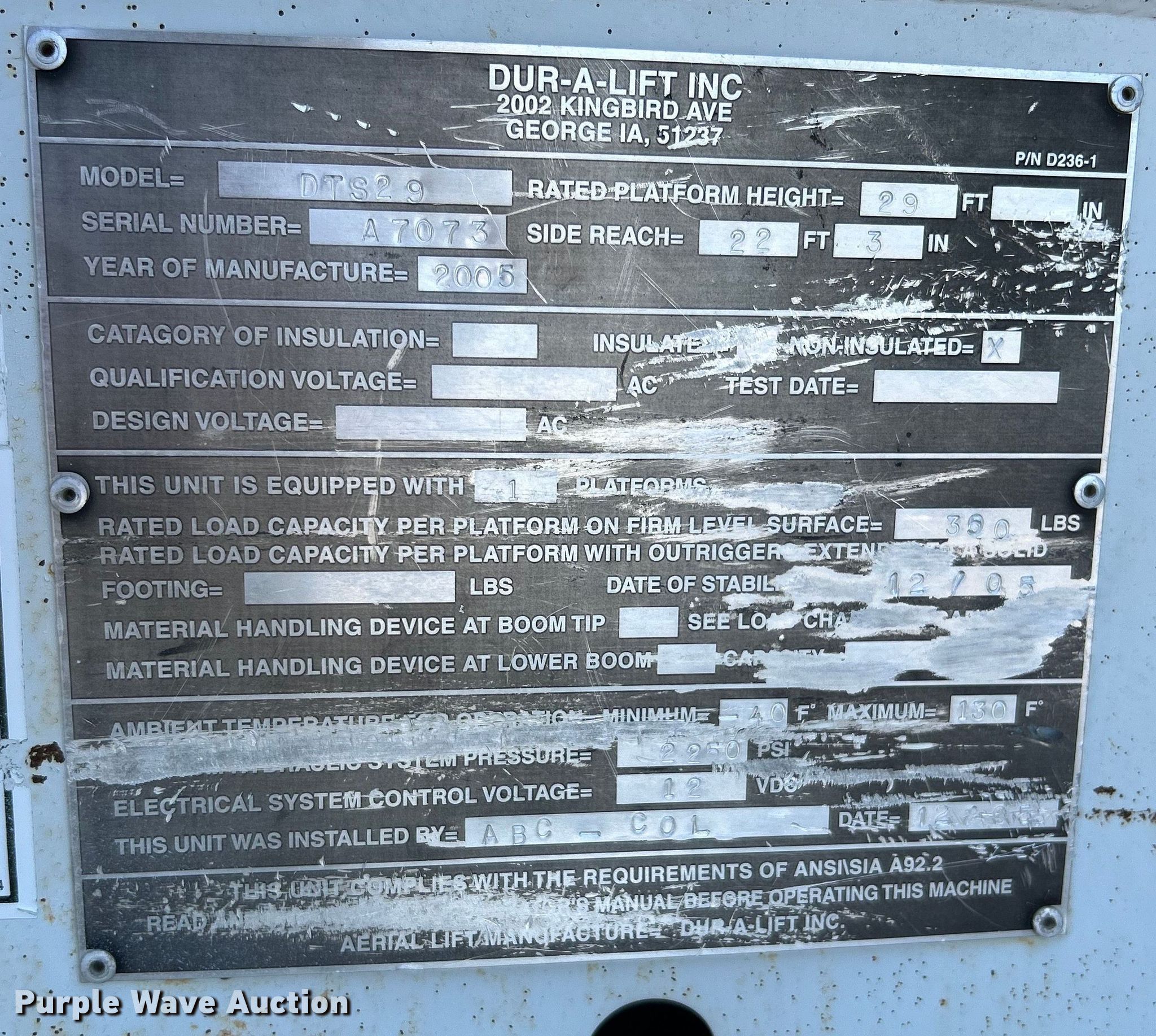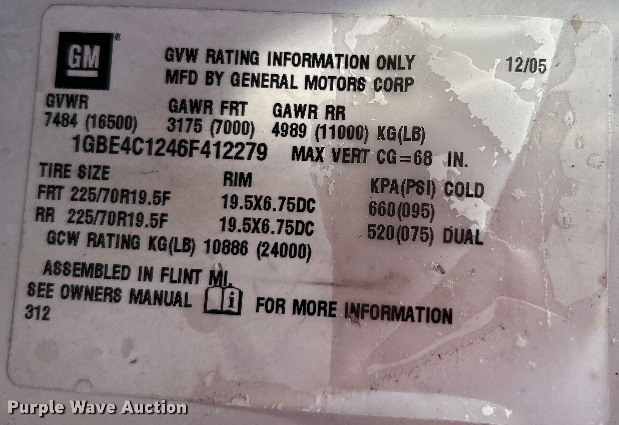 2006 Chevrolet C4500 bucket truck. Miles: 110,916 on odometer, VIN: 1GBE4C1246F412279. Engine Displacement: 6.6L, Cylinders: 8, Fuel type: Diesel. Transmission Automatic. Chassis Axles: Single, Suspension: Spring, Brakes: Hydraulic, GVWR: 16,500 lbs. Interior AC, Heat, Cruise control, Brake controller. Features Bed Brand FX, 10' 11" L x 90" W, Boom Dura Lift, Inc. DTS29, Serial: A7073, Maximum lift capacity: 300 lbs, Maximum lift height: 29', Boom type: Articulating, Insulated, Telescopic, Man basket, Boom controls Platform/ basket.. Tires Size: 225/70R19.5. Notes Dash warning indicator: ABS, Windshield chipped or cracked. Oklahoma title. Title distribution may be delayed up to 14 days from verification of funds. Collinsville, OK 74021