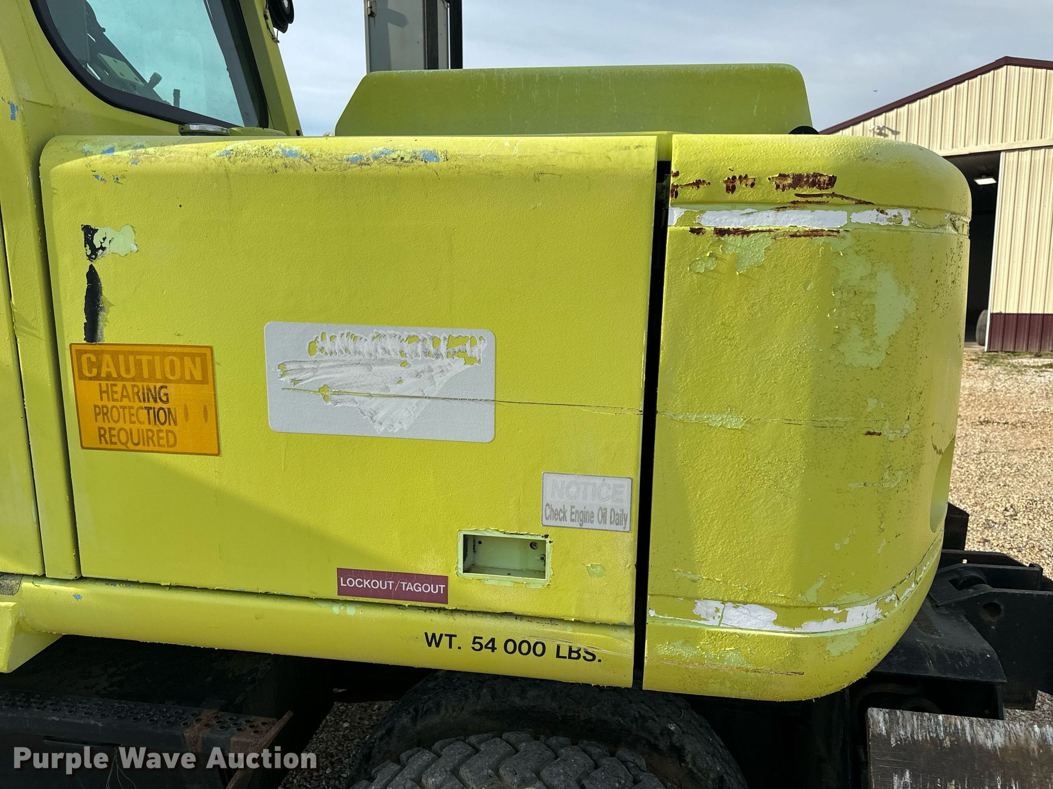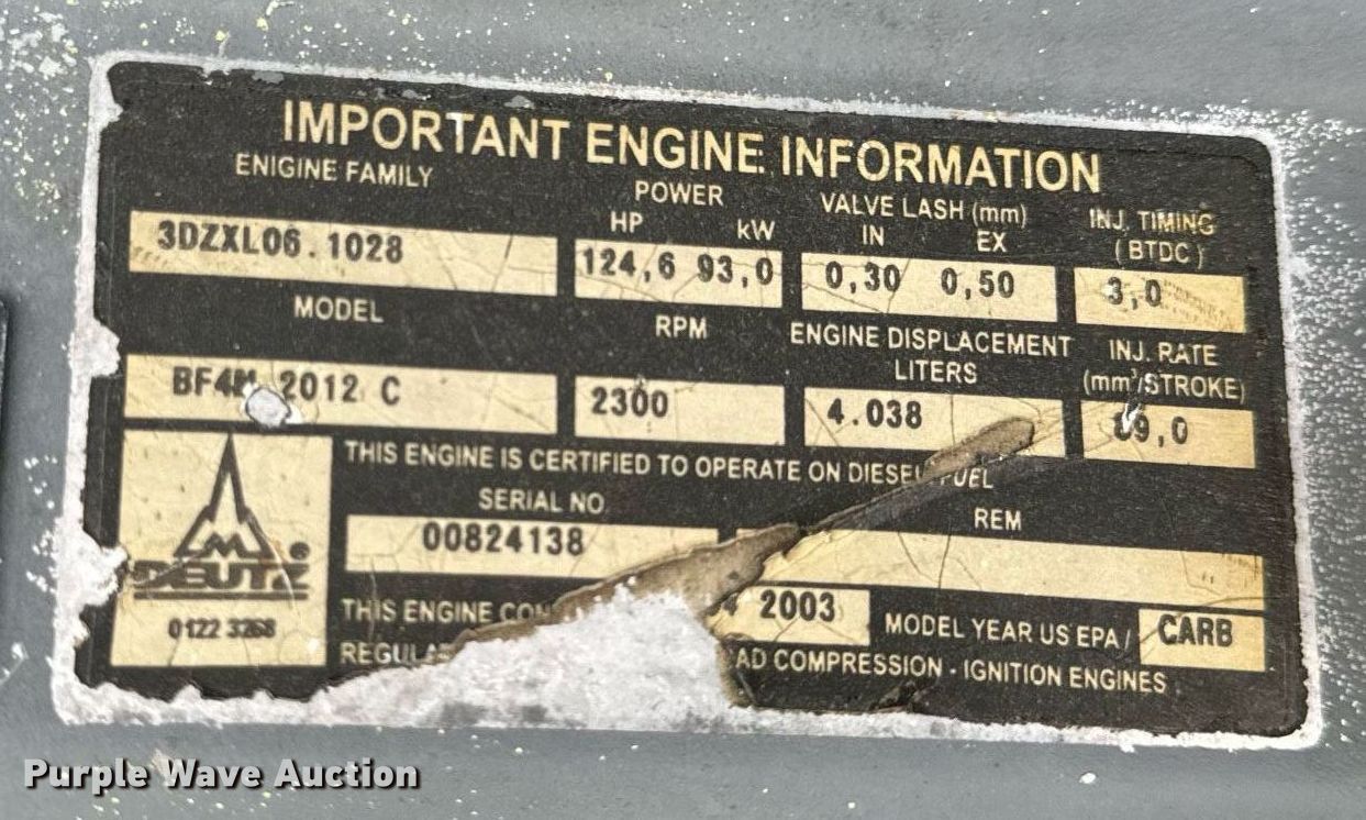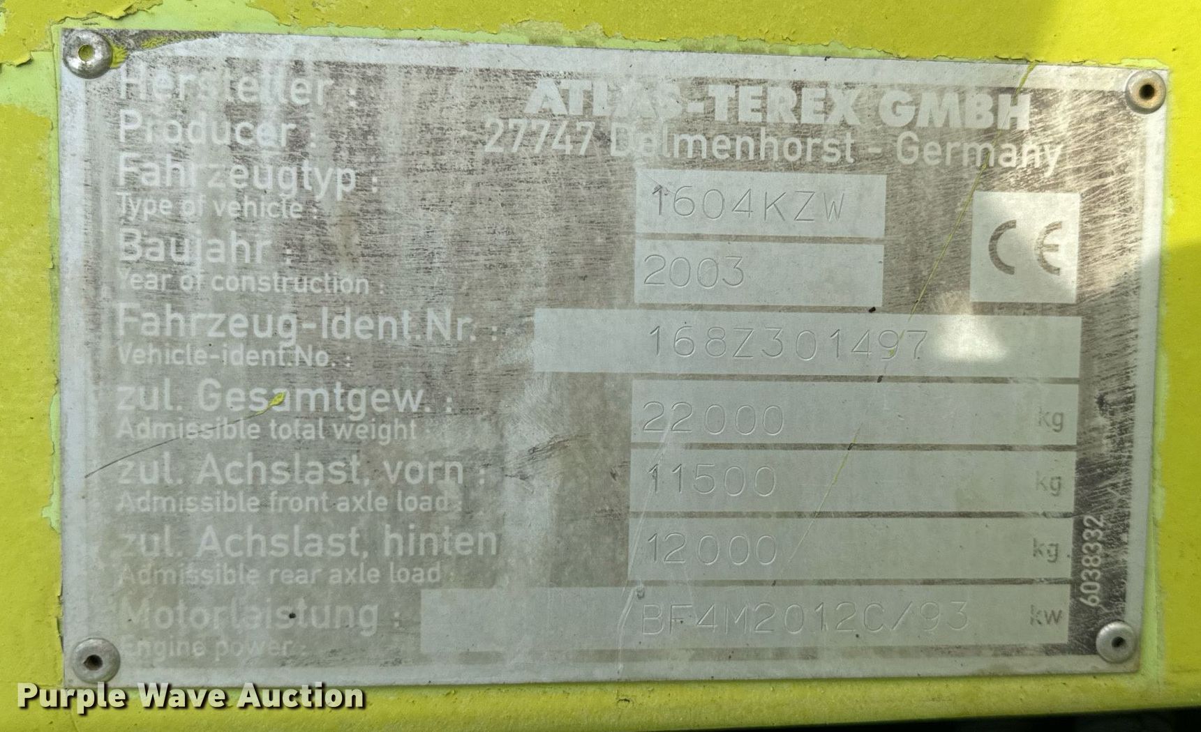 2003 Atlas 1604KZW wheeled excavator. Hours: 3,492 on meter, Serial: 168Z301497. Engine Deutz BF4M2012C, Serial: 00824138, Displacement: 4.038L, Cylinders: 4, Fuel type: Diesel, HP: 124. Transmission Hydrostatic. Operators station Enclosed cab, Heat. Features Auxiliary hydraulics, Boom Standard, Stick Stick length: 106", Grapple SEC, Width: 24", Generator Hubbell, Baldor electric motor. Tires Size: 10.00R20, Foam filled. Notes Hydraulic oil level sensor issues, Airflow sensor issues, Exhaust elbow disconnected, Glass broken/ missing, Unknown operating condition of generator, Leveling cylinder leak, Tires damaged. T&R Equipment. New Bloomfield, MO 65080
