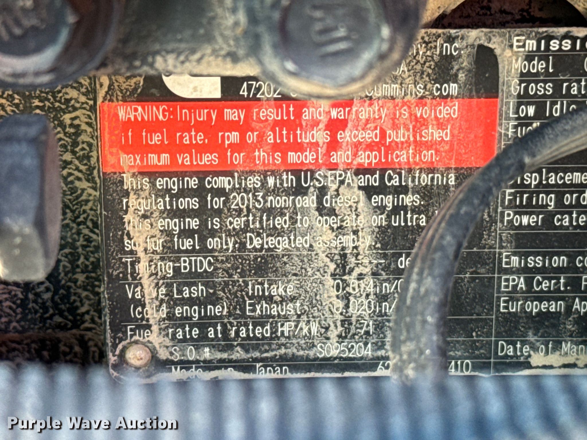2013 JLG Skytrak 8042 telehandler. Hours: 3,255 on meter, Serial: 0160053616. Engine Cummins QSB3.3, Serial: 68606004, Displacement: 3.2L, Cylinders: 4, Fuel type: Diesel. Transmission Powershift, Four wheel drive. Operators station Steering: Crab, Four wheel. Features Maximum lift capacity: 8,000 lbs, Boom stages: 3, Fork length: 48", Auxiliary hydraulics, Quick attach: Manual. Tires Size: 13.00-24/8.50, Solid. Apache, OK 73006