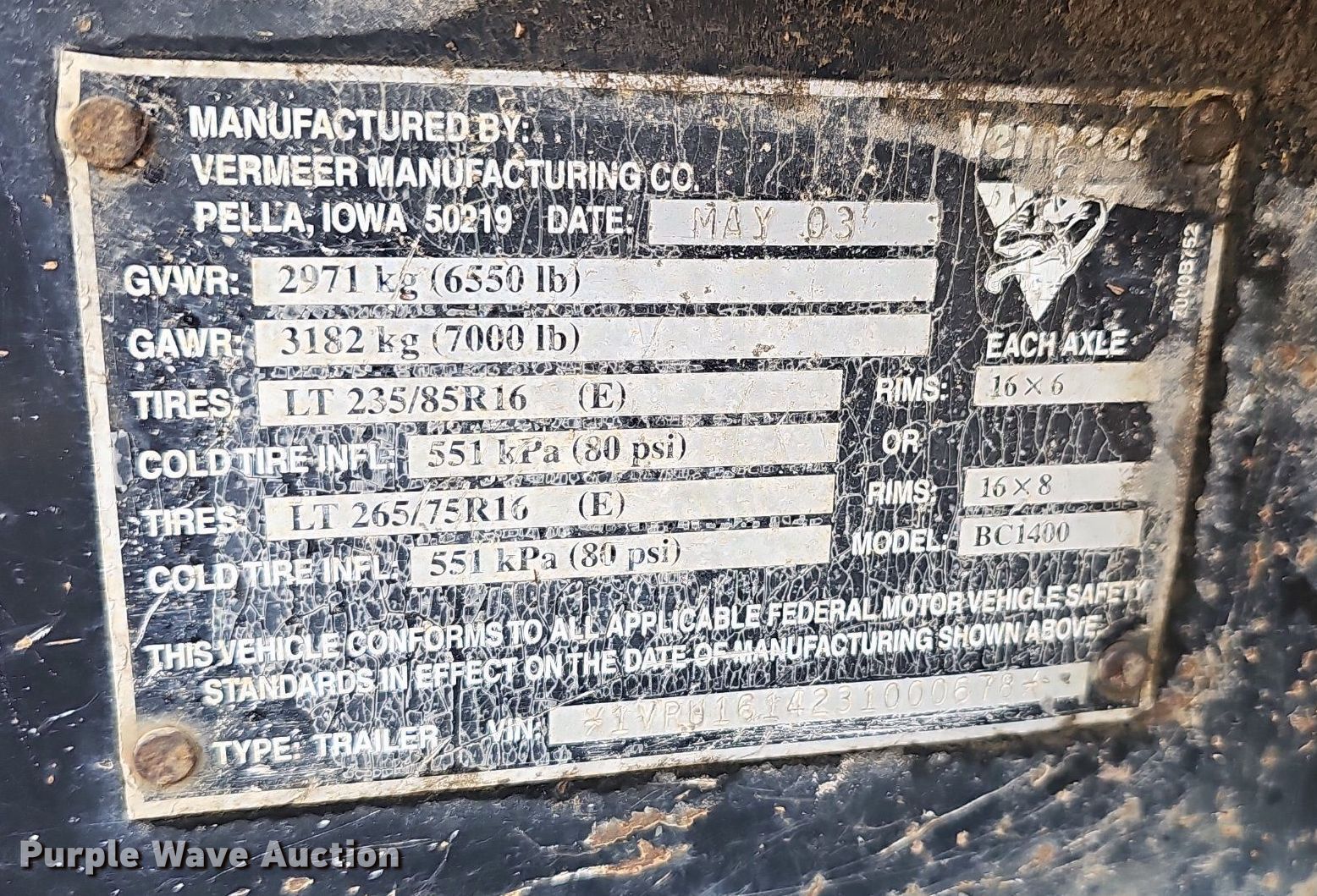 2003 Vermeer BC1400 wood chipper. Hours: 1,870 on meter, Hours: Unknown, VIN: 1VRU1614231000678, Unit #: 16301. Engine Caterpillar, Cylinders: 4, Fuel type: Diesel. Features Throat opening: 34" x 21", Winch. Tires Size: 265/75R16. Trailer 15' L x 84" W, Hitch: Pintle, Brakes: Electric, Axles: Single, GVWR: 6,550 lbs, GAWR: 7,000 lbs. Notes Unknown operating condition of winch. Arkansas title. Title distribution may be delayed up to 14 days from verification of funds. Arkansas Valley Electric Cooperative Corp.. Ozark, AR 72949