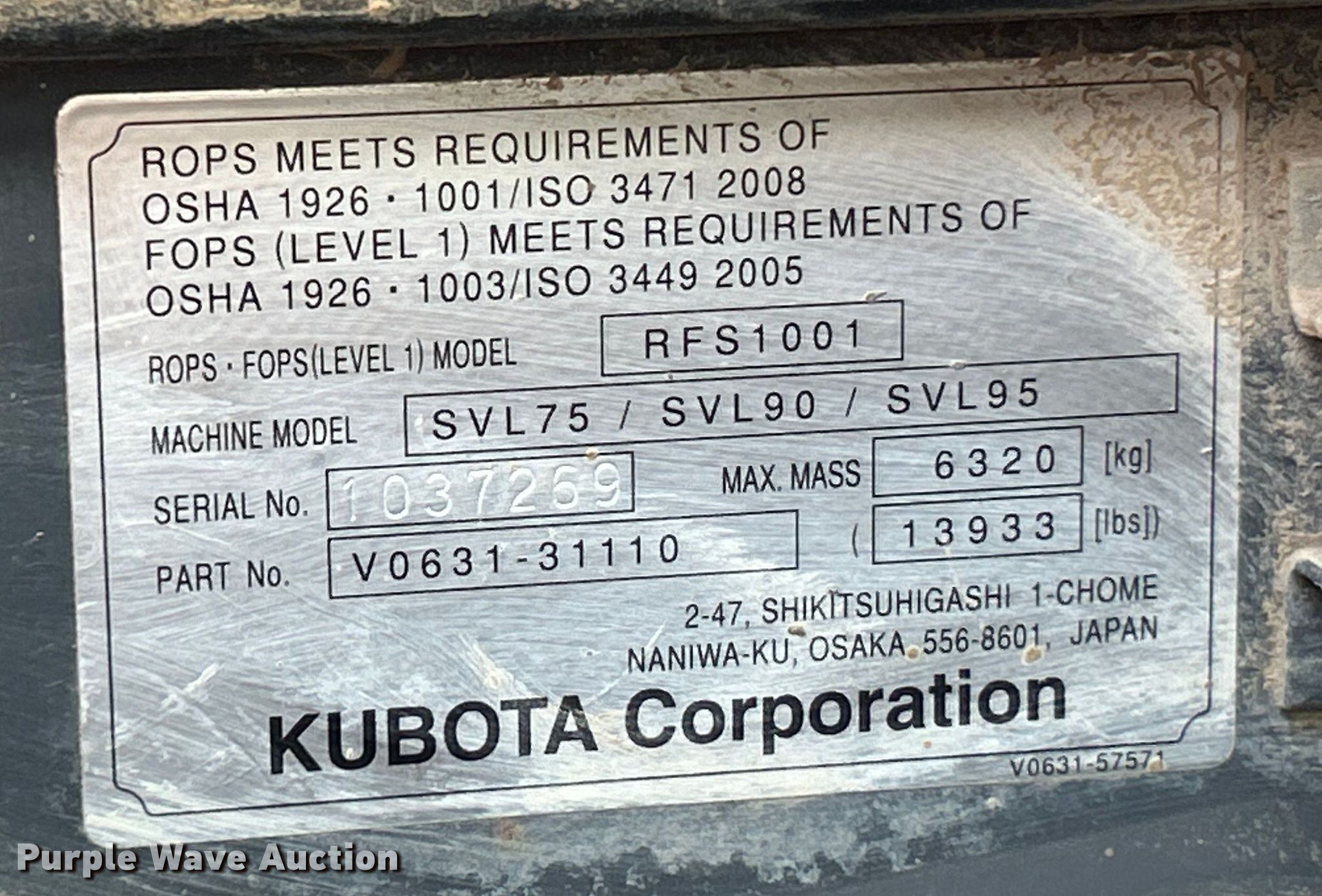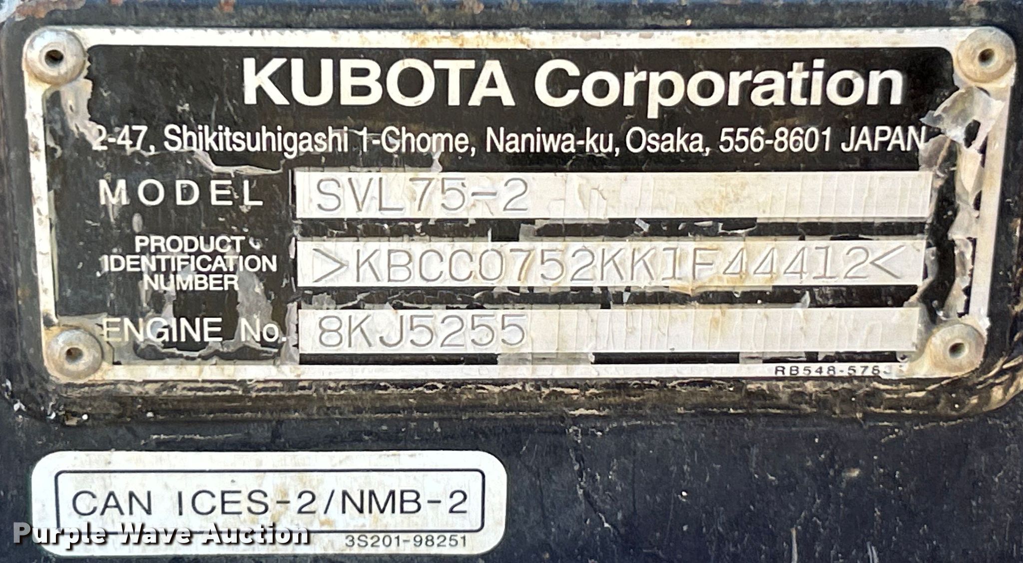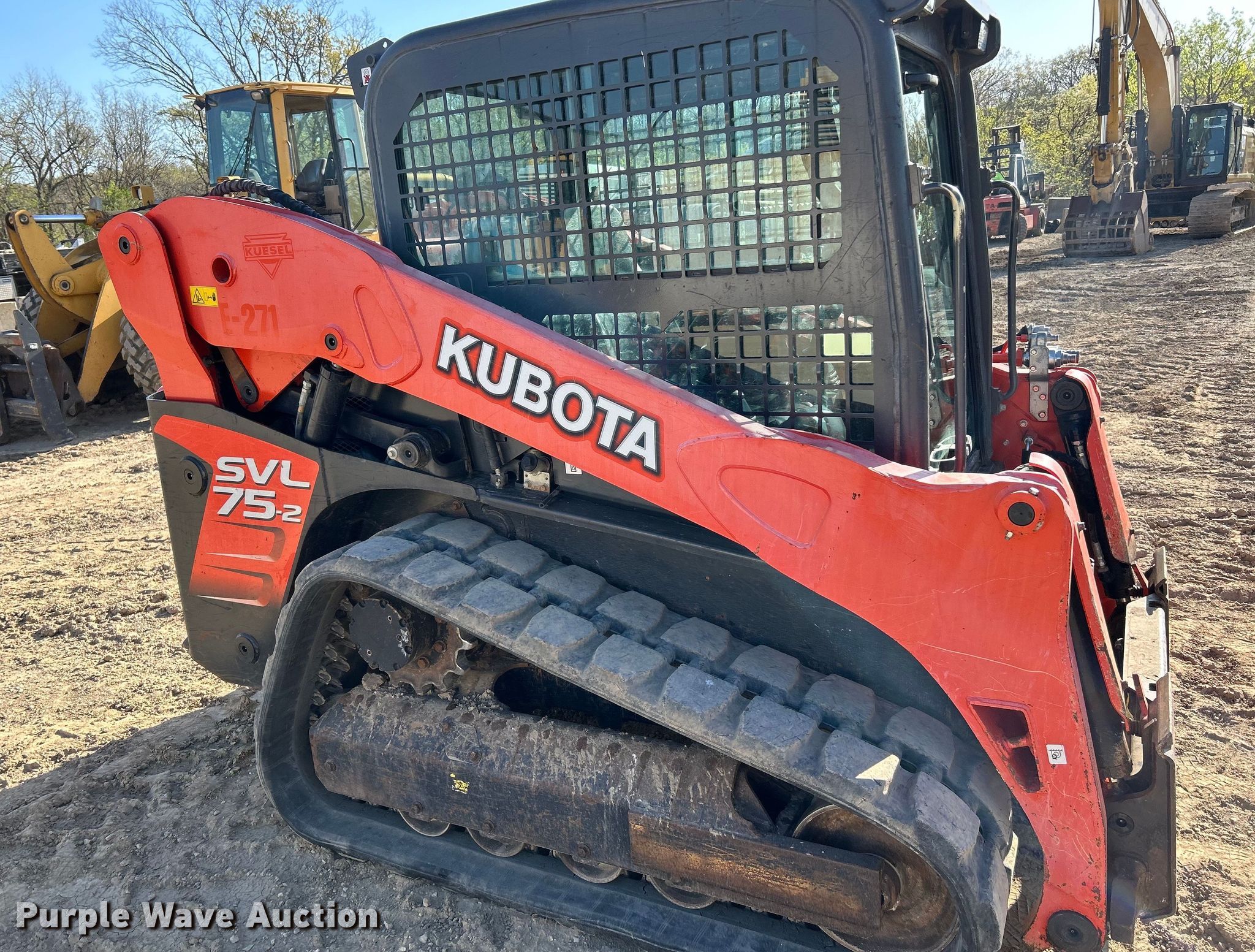 Purple Wave is selling a used Tracked Skid Steer Loader in Missouri. This item is a 2019 Kubota SVL75-2 tracked skid steer loader with the following: Hours: 3,466 on meter, Serial: KBCC0752KK1F44412