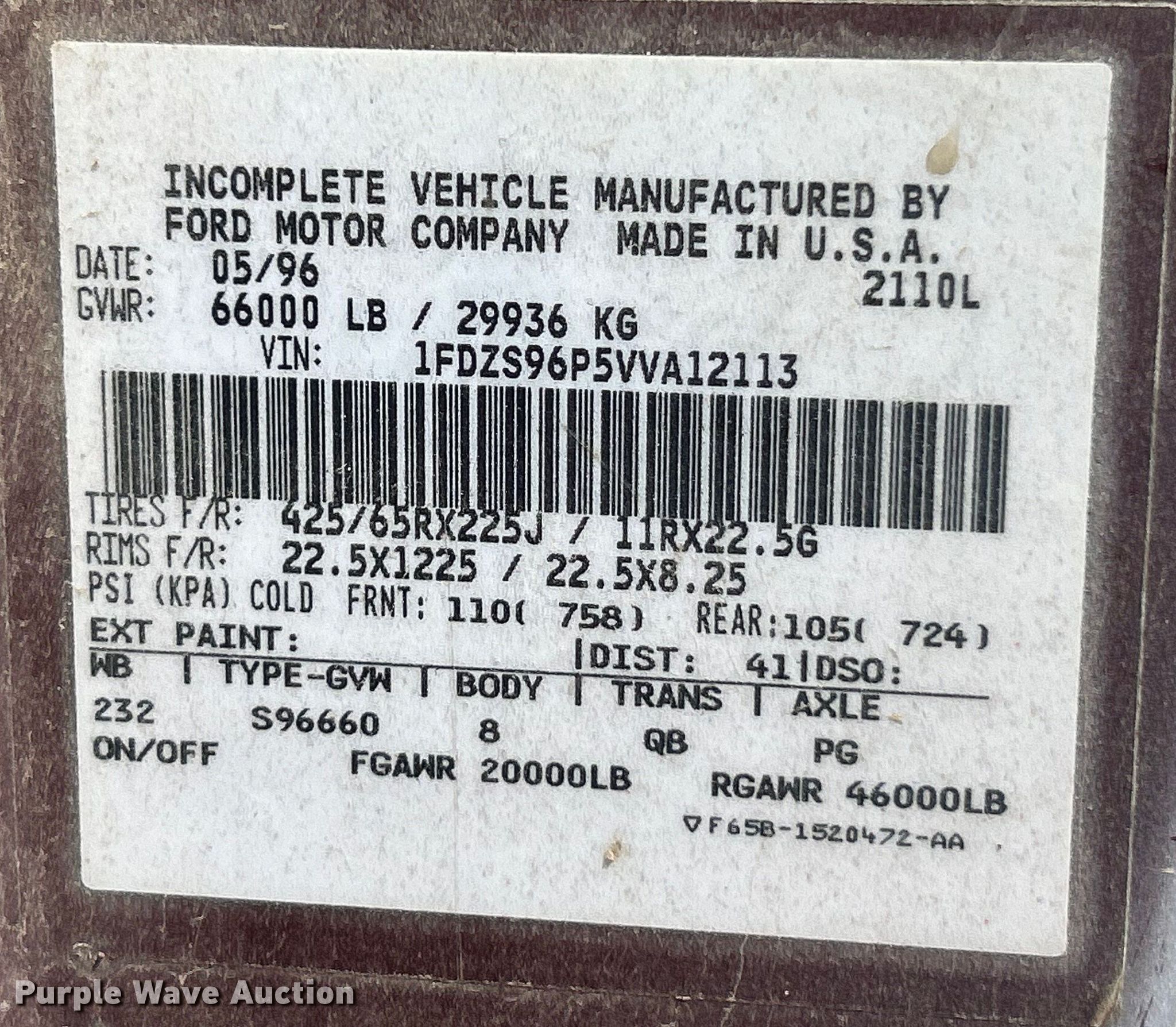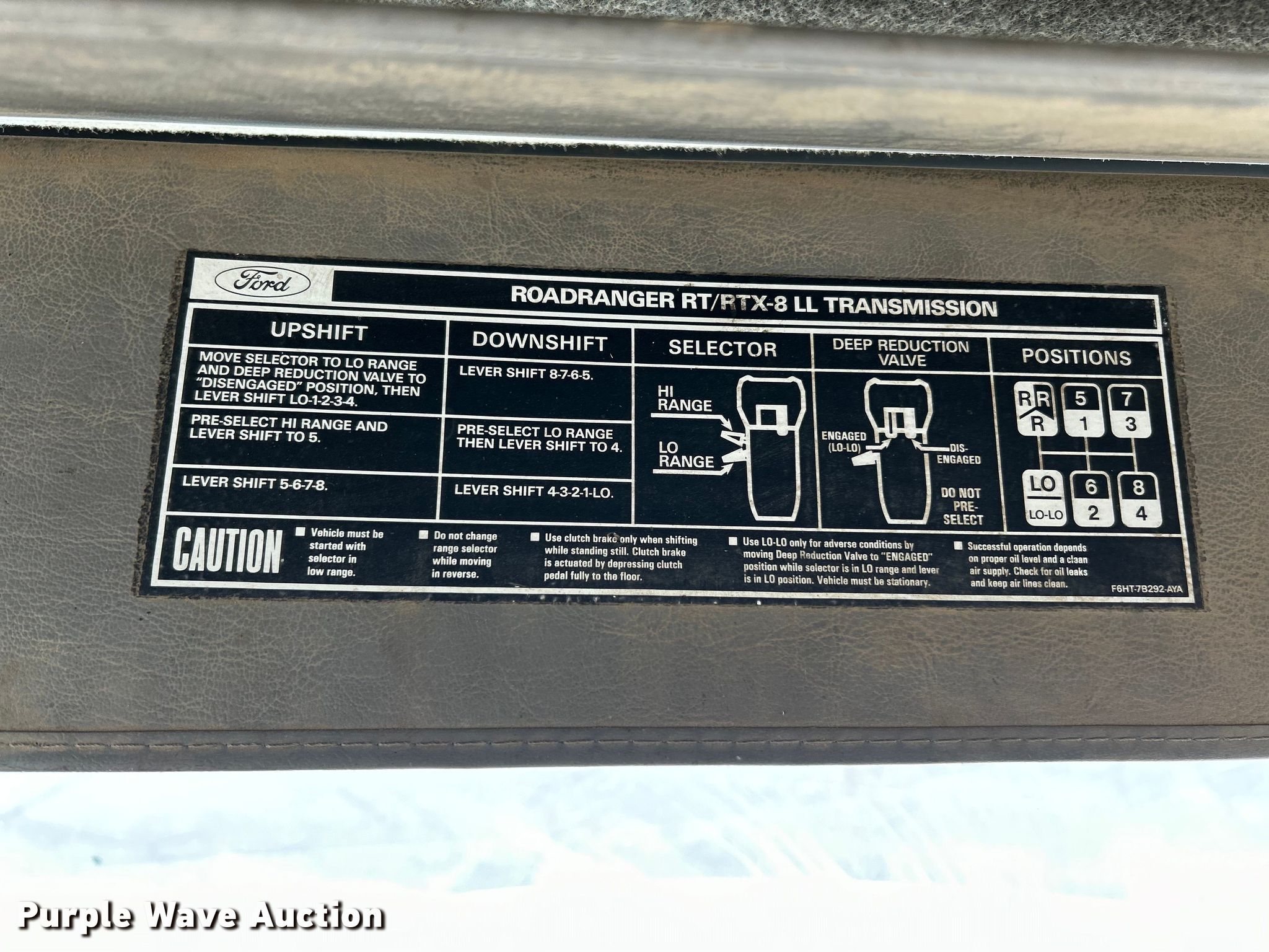 1997 Ford LT9513 dump truck. Miles: 498,217 on odometer, Hours: 18,555 on meter, VIN: 1FDZS96P5VVA12113. Engine Cummins, Displacement: 10.8L, Cylinders: 6, Fuel type: Diesel. Transmission Eaton Fuller RT/RTX-8LL, Manual, Speed: 10. Chassis Axles: Tandem, Pusher axle, Differential lock: Full, Suspension: Spring over walking beam, Brakes: Air, PTO, GVWR: 66,000 lbs FAWR: 20,000 lbs, IAWR: 23,000 lbs, RAWR: 23,000 lbs, Wheelbase: 232". Interior AC, Heat, Heated mirrors, Power windows, Cruise control. Features Dump bed 18' L, Side height: 48", Bed type: Steel, Roll tarp, Ram: Single, End gate: Air operated. Tires Front: 385/65R22.5, Rear: 11R22.5, Lift axle: 295/75R22.5. Notes Ram cylinder leak, Dash warning indicator: Engine Warning, Windshield chipped or cracked. Illinois title. Title distribution may be delayed up to 30 days from verification of funds. Dwaynes Demolition LLC. East St. Louis, IL 62205