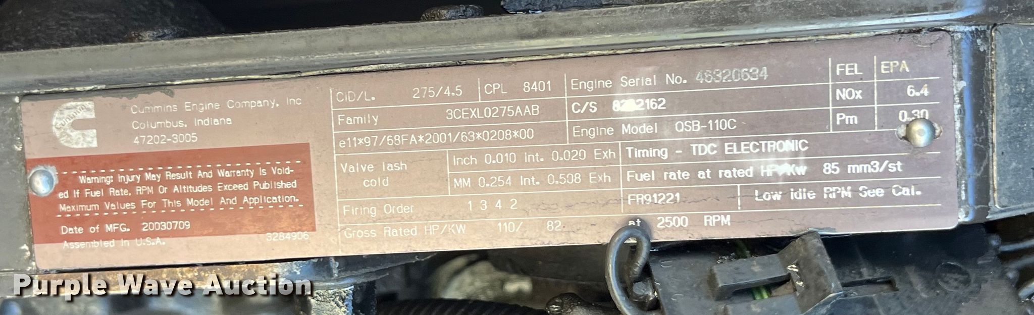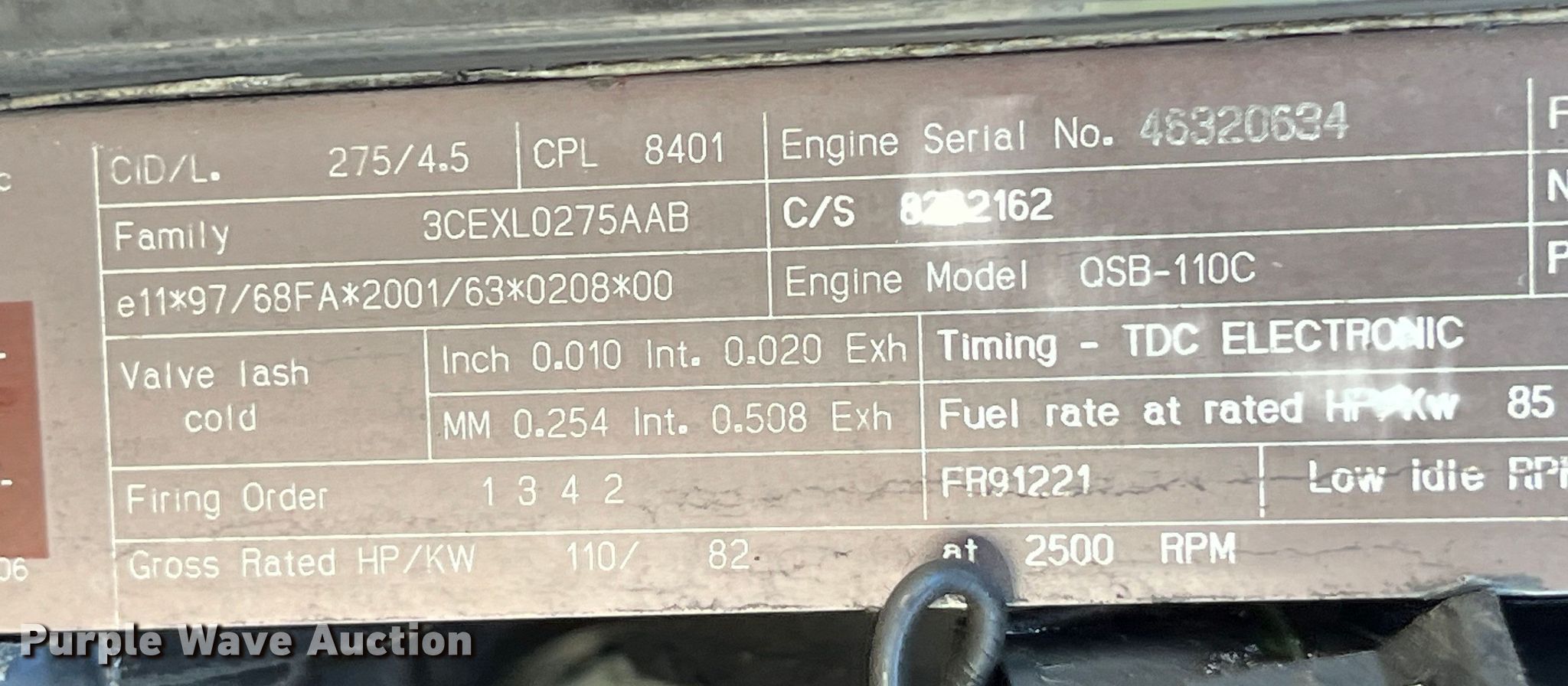 2003 Sky Trak 8042 telehandler. Hours: 614 on meter, Serial: 19833. Engine Cummins QSB-110C, Serial: 46320634, Displacement: 4.5L, Cylinders: 4, Fuel type: Diesel. Transmission Powershift, 4F - 3R, Four wheel drive. Operators station Canopy, Steering: Crab, Four wheel. Features Maximum lift capacity: 8,000 lbs, Boom stages: 3, Fork length: 48", Hydraulic leveling. Tires Size: 13.00-24TG. 61 Rental. New London, MO 63459