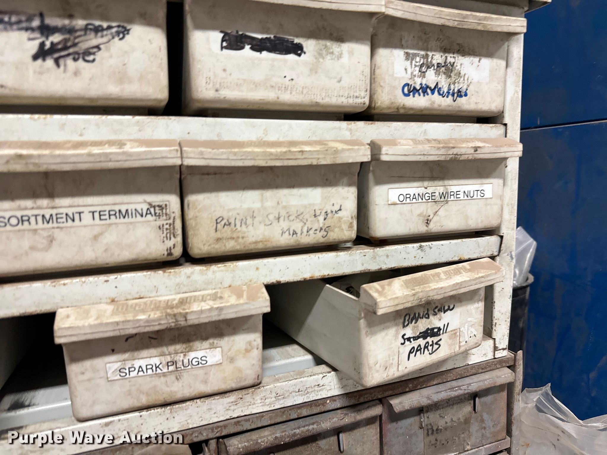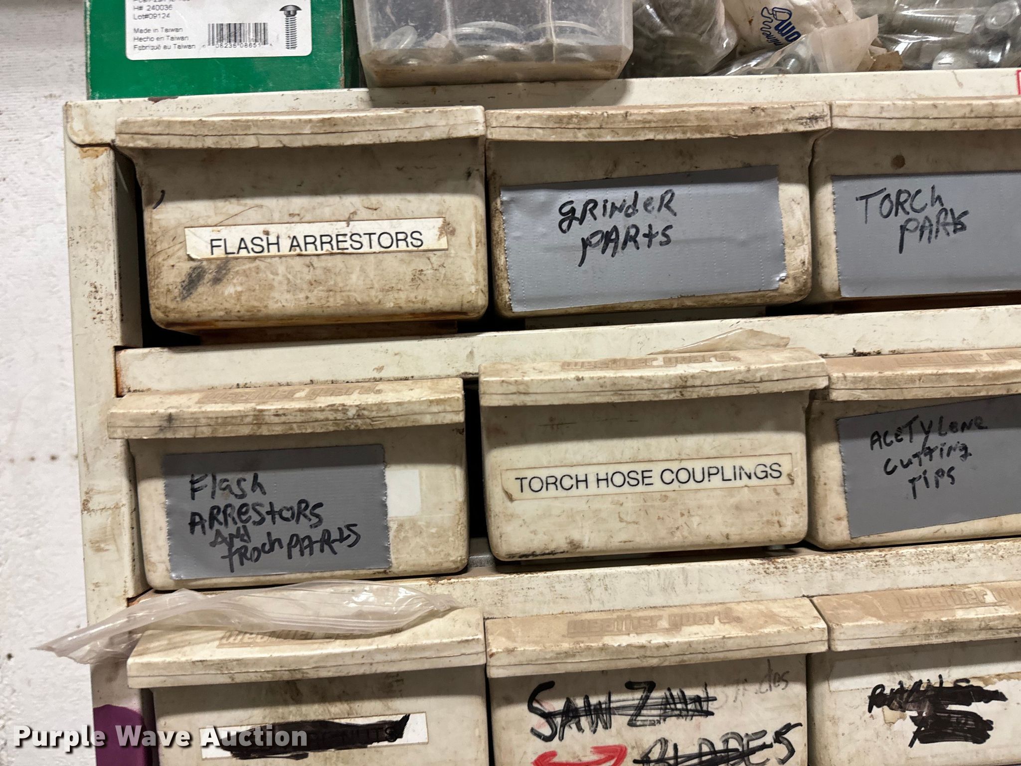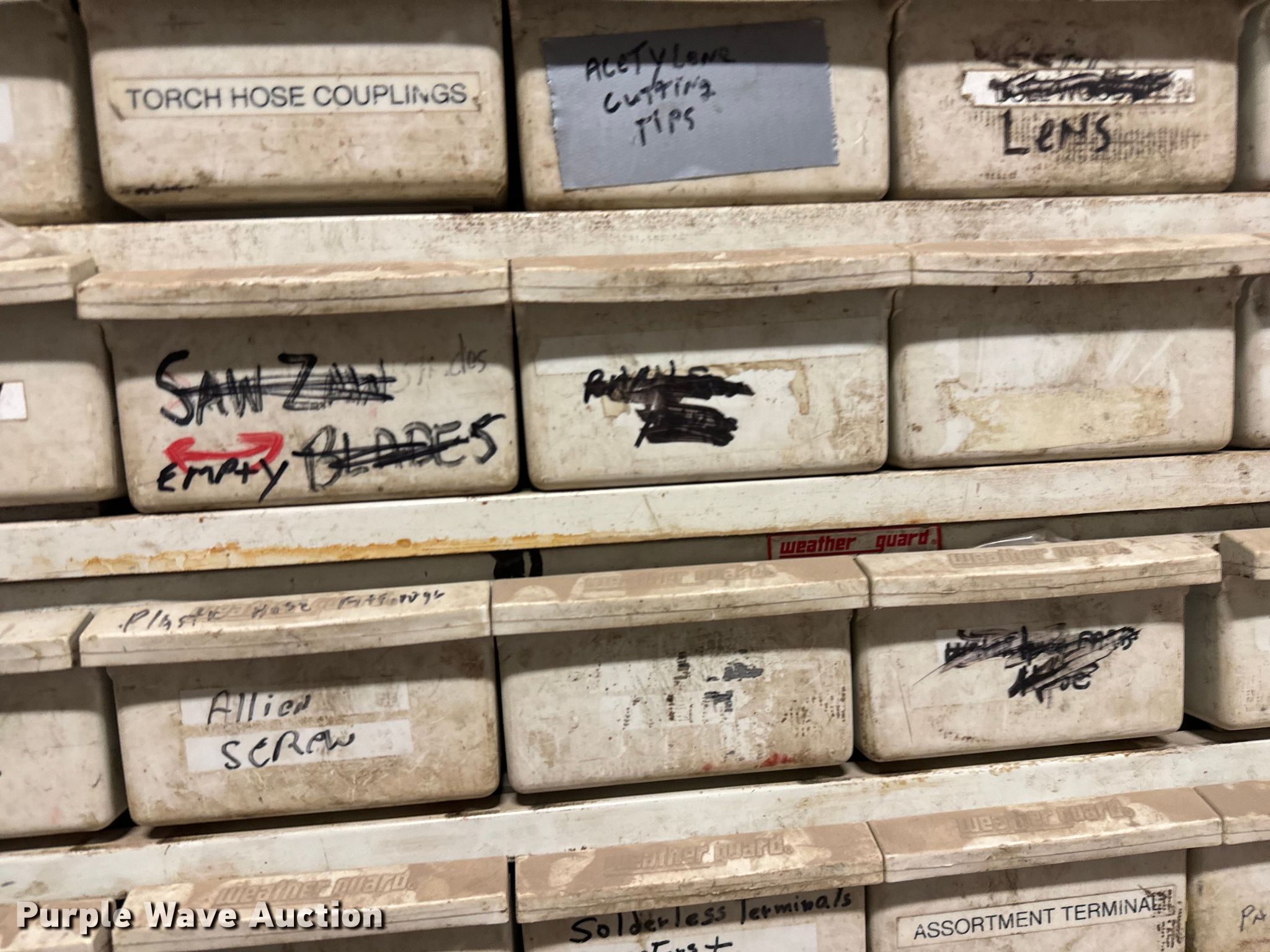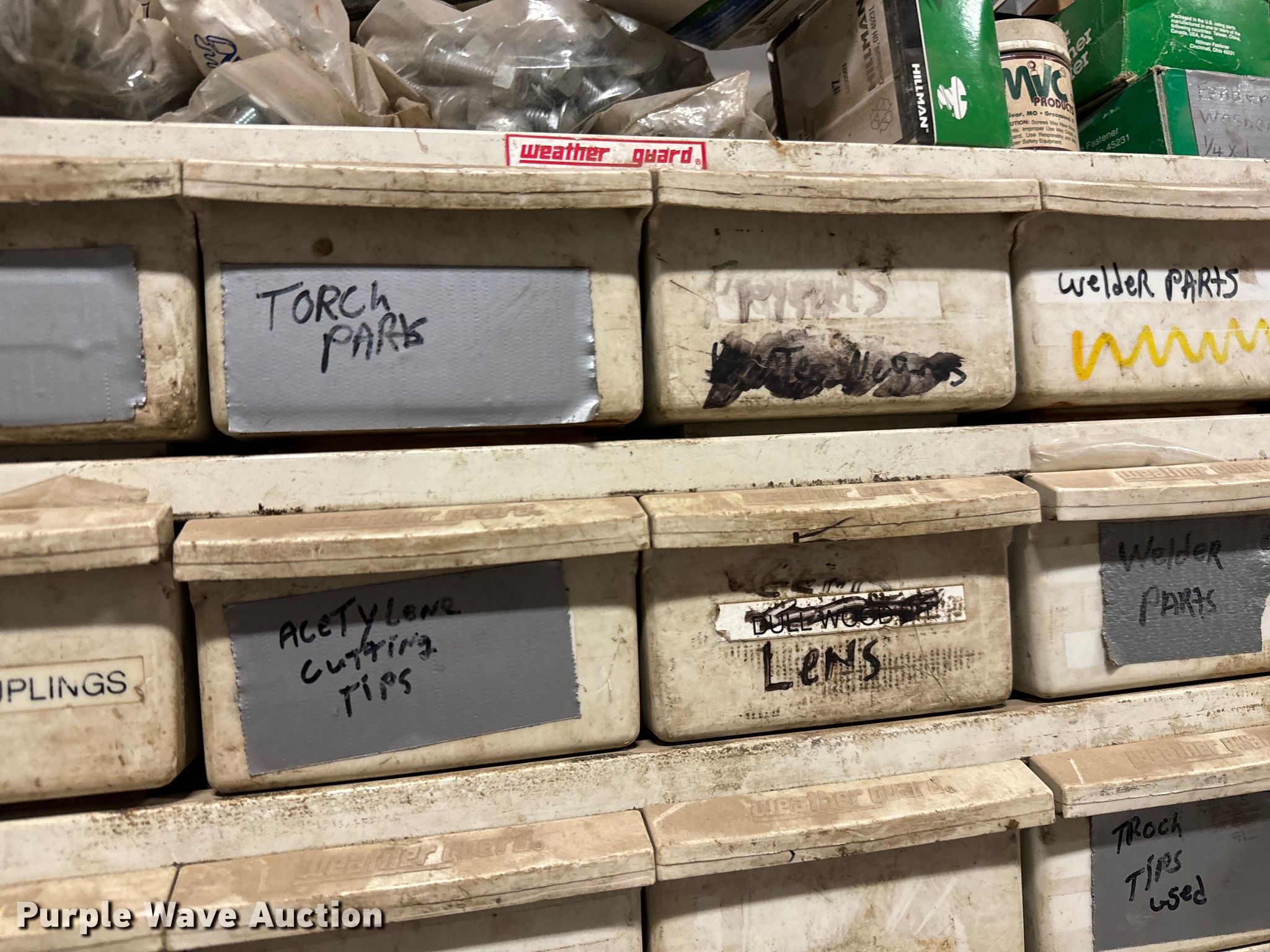 Purple Wave is selling a used Tools in Kansas. This item is a Tools with the following: Hardware, Electrical supplies, Torch supplies, Welding supplies, Shelving, Bins, Workbench and more