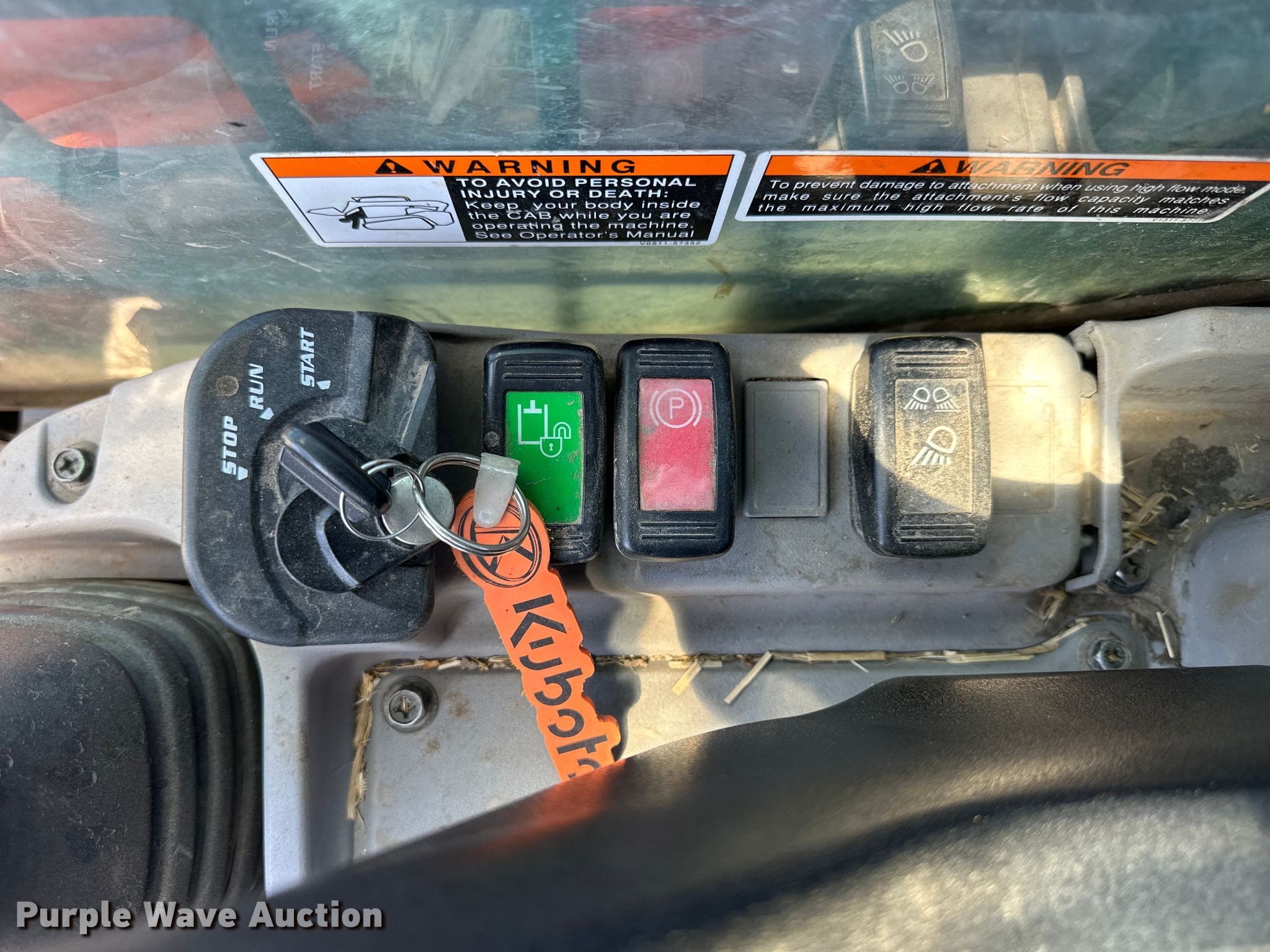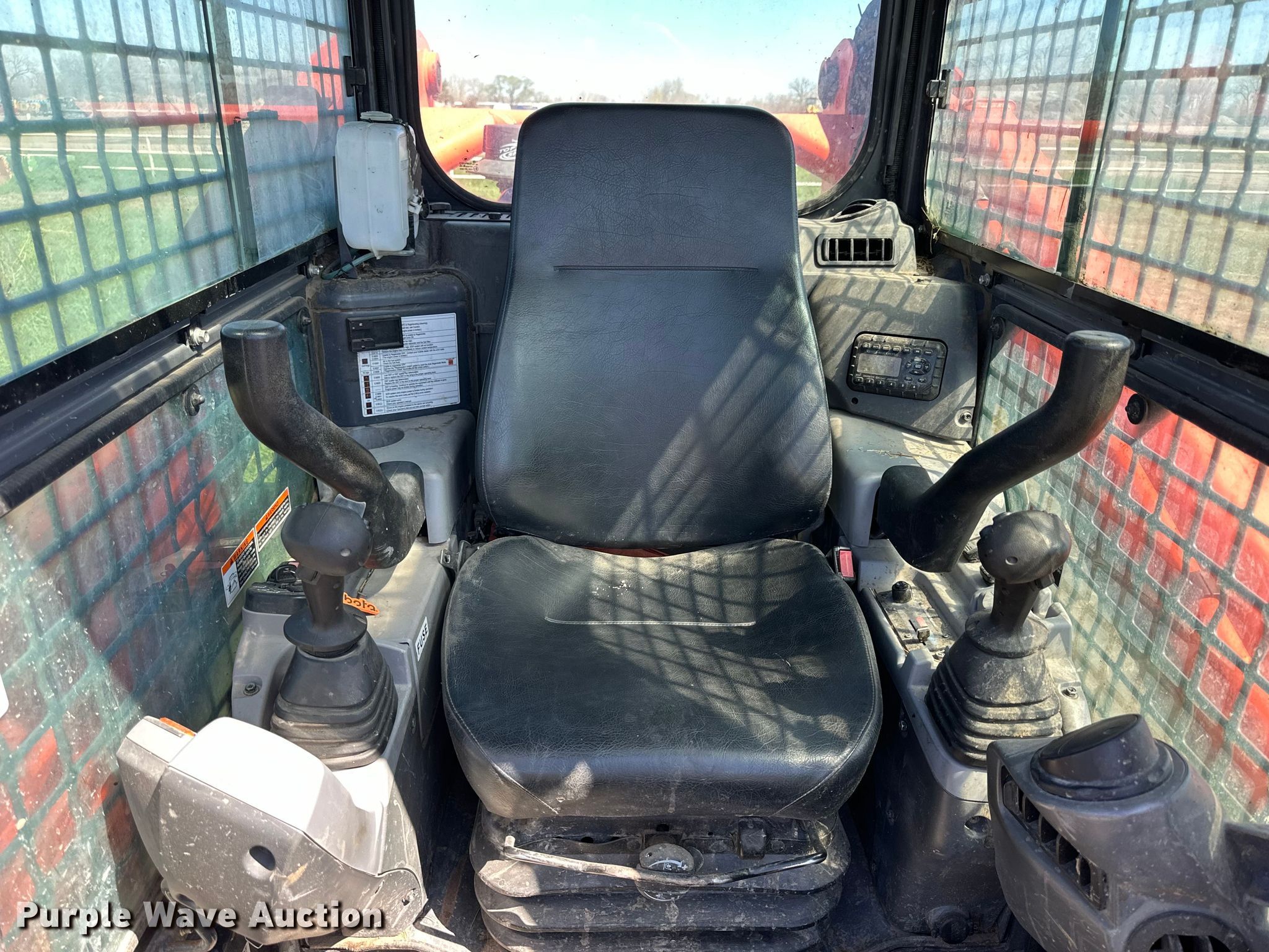2019 Kubota SVL 95-2S tracked skid steer loader. Hours: 1,725 on meter Miles or hours may vary, unit still in use, Serial: KBCC0953KK1E46971. Engine Kubota V3800 -CR-TI-EV13, Serial: SKJ0433, Displacement: 3.8L, Cylinders: 4, Fuel type: Diesel. Transmission Hydrostatic. Operators station Enclosed cab, AC, Heat, Bucket control: Hand, Electronic Monitoring System panel. Features Auxiliary hydraulics, Auxiliary electrical outlet, Quick coupler: Hydraulic. Tracks Width: 17". Notes Bucket missing. North Platte Stockyards. North Platte, NE 69101