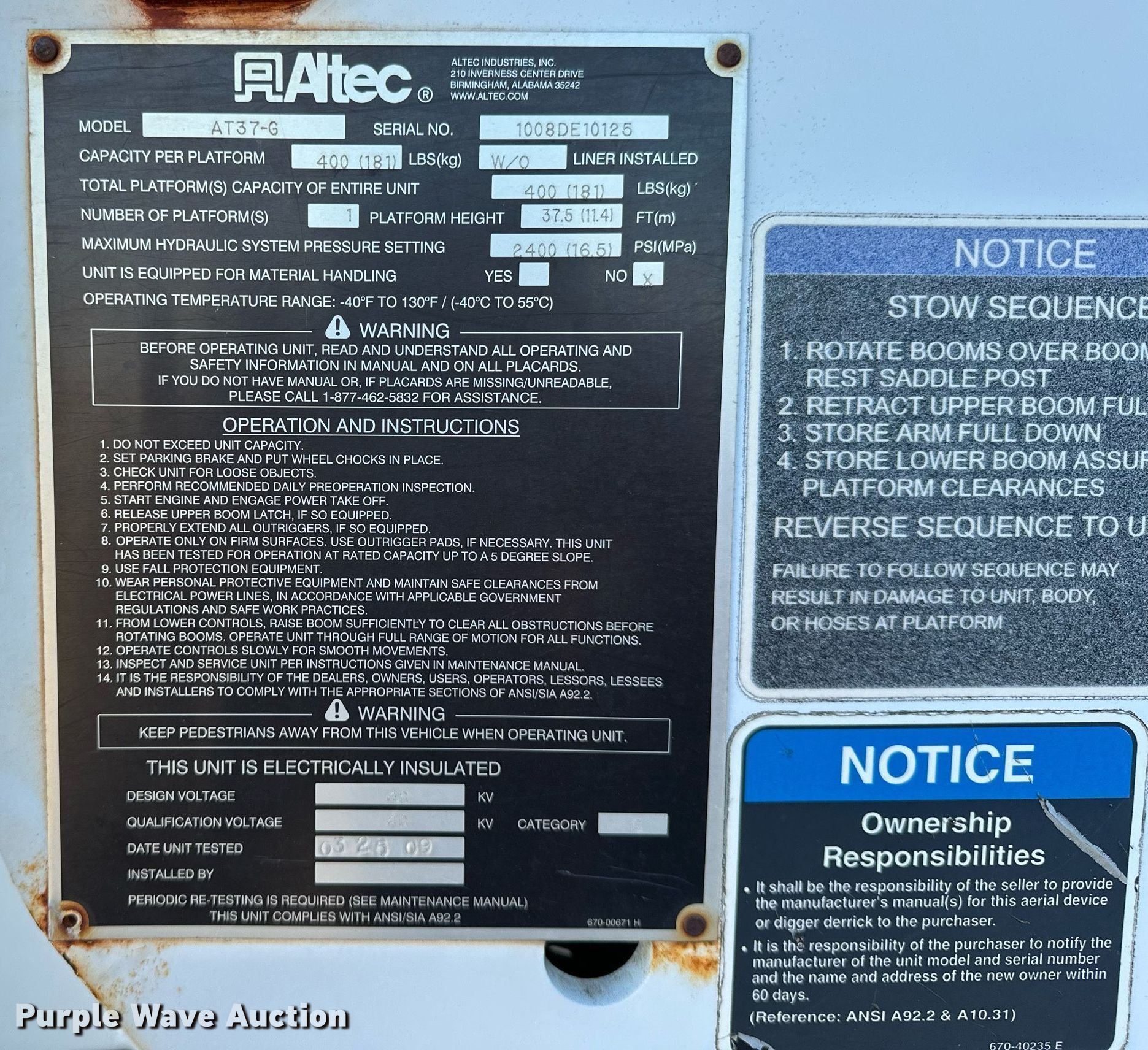 2009 Dodge Ram 5500HD bucket truck. Miles: 213,669 on odometer, VIN: 3D6WD76L69G523647. Engine Cummins, Displacement: 6.7L, Cylinders: 6, Fuel type: Diesel. Transmission Automatic. Chassis Four wheel drive, Axles: Single, Suspension: Spring, Brakes: Hydraulic, PTO, Wet kit, GVWR: 18,750 lbs. Interior AC, Heat, Cruise control, Auxiliary controls, Brake controller. Features Bed Altec, Serial: 47-12150325, 11' 7" L x 94" W, Boom 2009 Altec AT37-G, Serial: 1008DE10125, Boom length: 15', Mast height: 37.5', Maximum lift capacity: 400 lbs, Boom type: Articulating, Insulated, Telescopic, Boom controls Ground, Platform/ basket.. Tires Size: 245/70R19.5. Notes Dash warning indicator: Brake, Service 4WD, Hail damage, Parking brake latch missing, Passenger mirror missing, AC issues, needs recharged, Fuel cap missing, Bed doors issues, difficult to open, Unknown operating condition of lift. Illinois title. Benton Technical Services. 6200 North Harrison Street. Shawnee, OK 74804