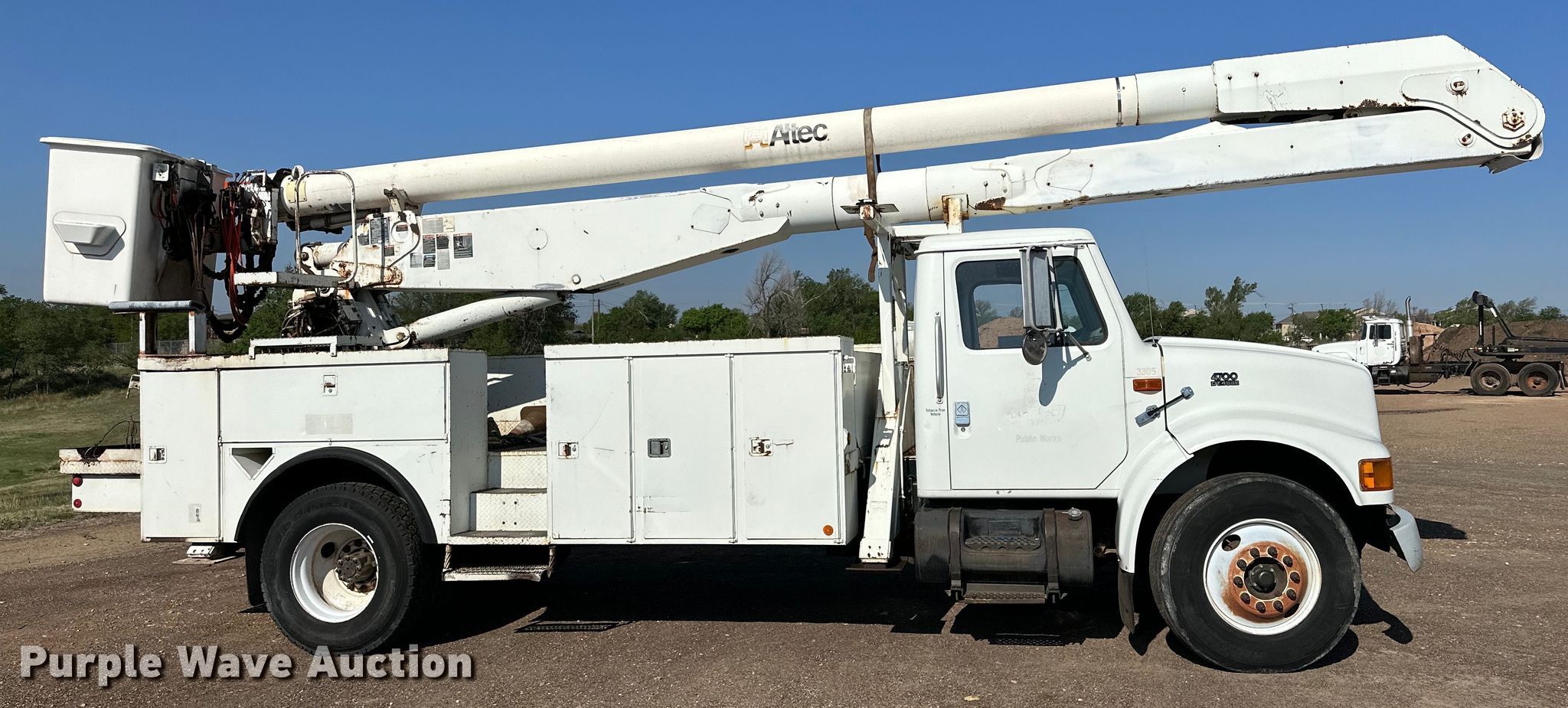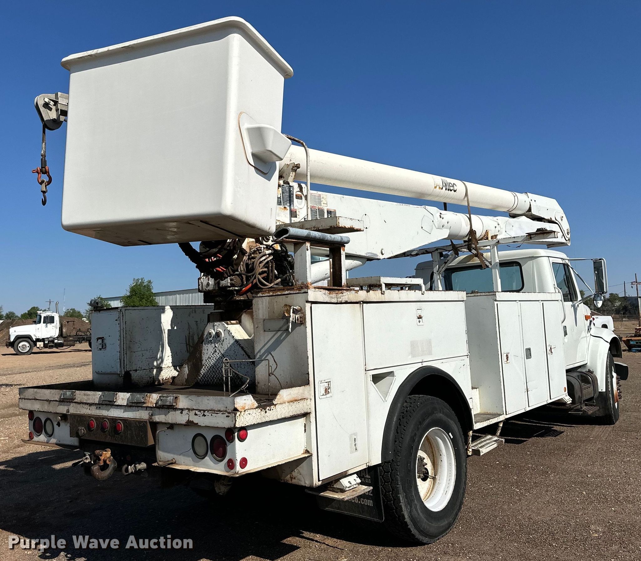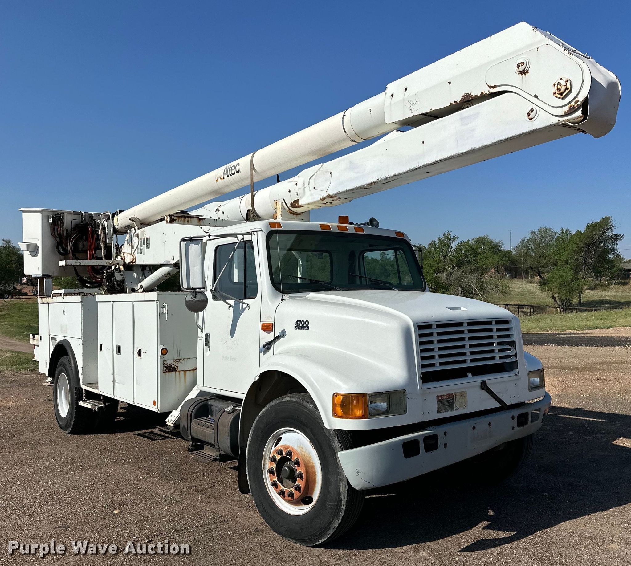 1999 International 4700 bucket truck. Miles: 56,382 on odometer, Hours: 4,812 on meter, VIN: 1HTSCAAN1XH678156. Engine Displacement: 7.6L, Cylinders: 6, Fuel type: Diesel. Transmission Automatic. Chassis Axles: Single, Suspension: Spring, Brakes: Air, PTO. Interior AC, Heat, Cruise control, Brake controller. Features Bed Altec, 17' L x 96" W, Boom Altec, Mast height: 55', Maximum lift capacity: 700lbs, Boom type: Articulating, Insulated, Man basket, Boom controls Ground, Platform/ basket, Material handler. Tires Size: 11R22.5. Notes Non-operational basket controls. Texas title. City of Borger, TX. Borger, TX 79007