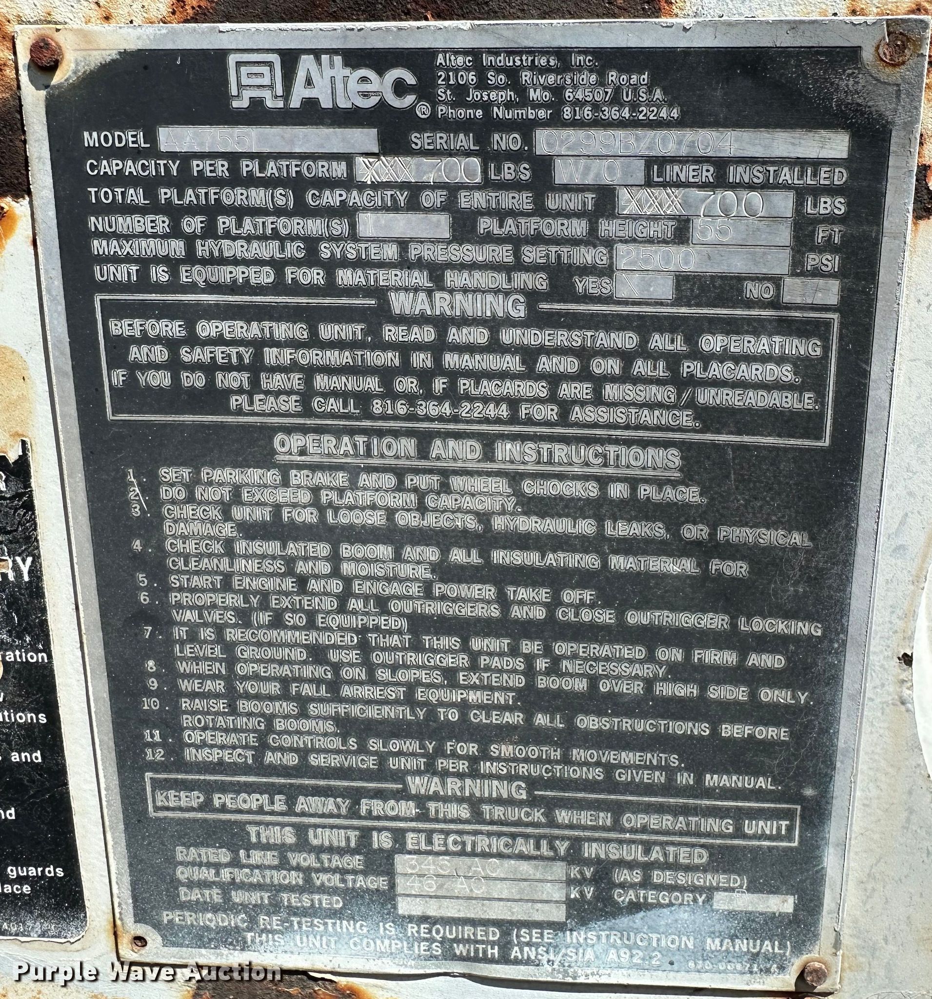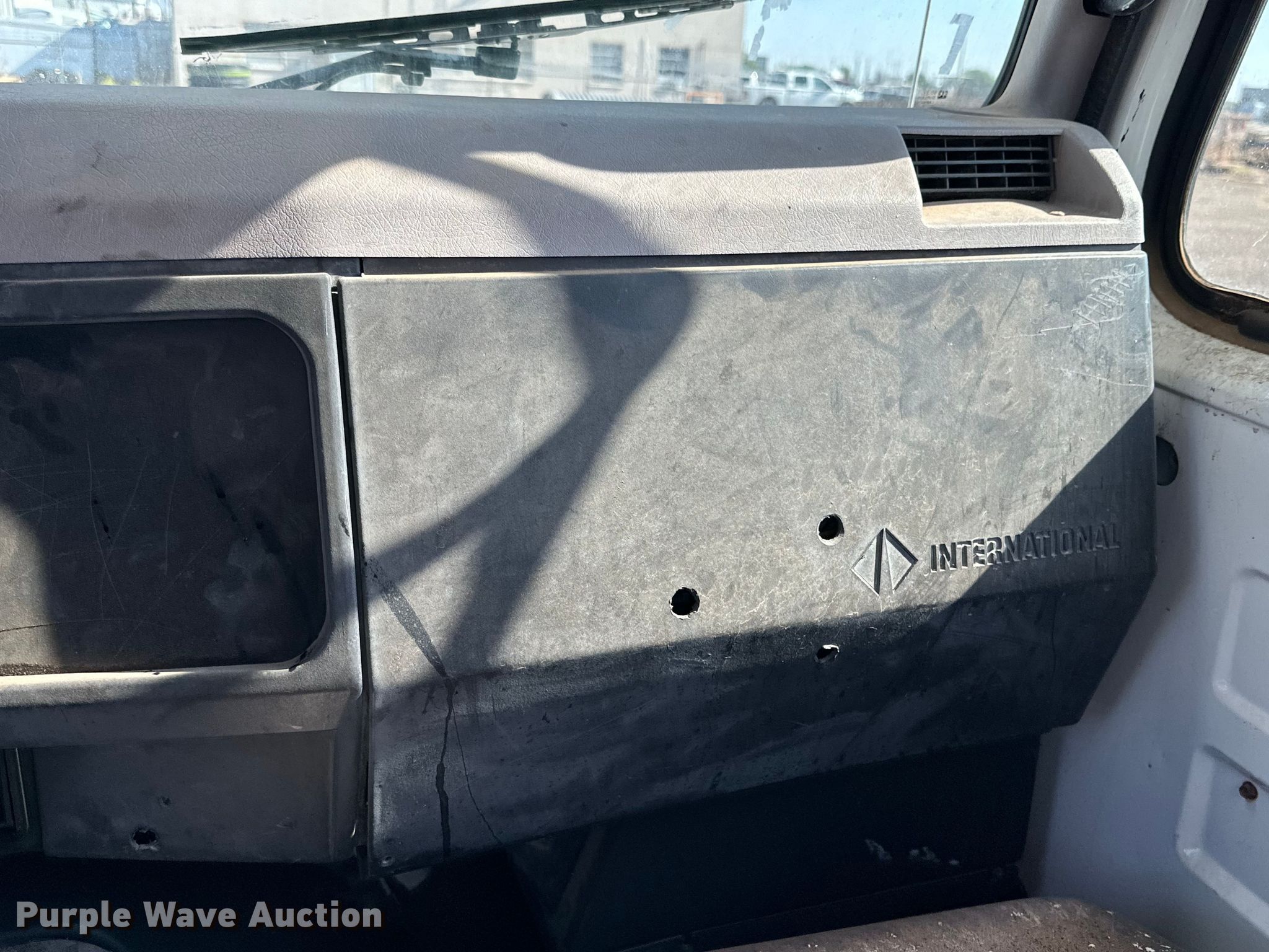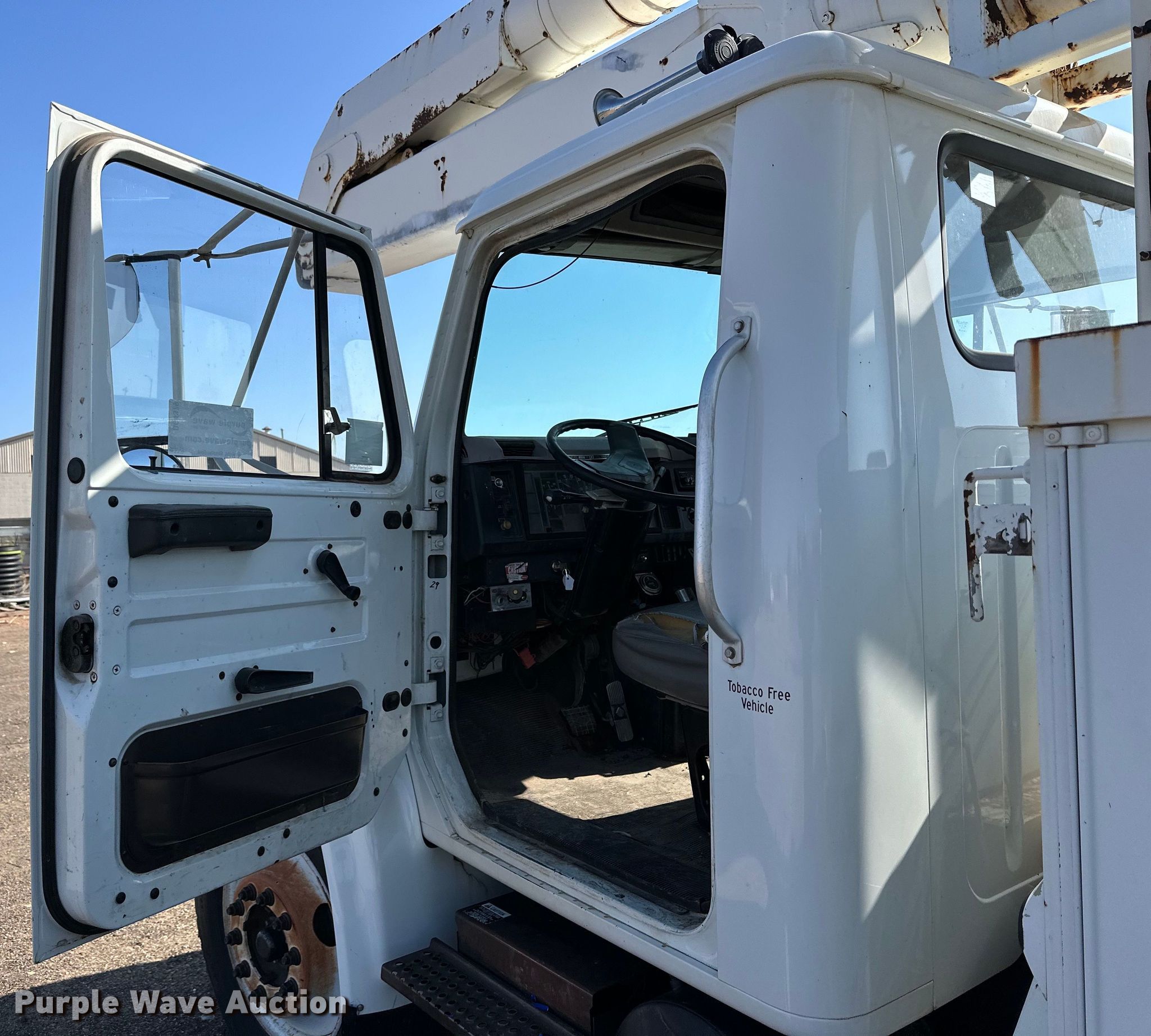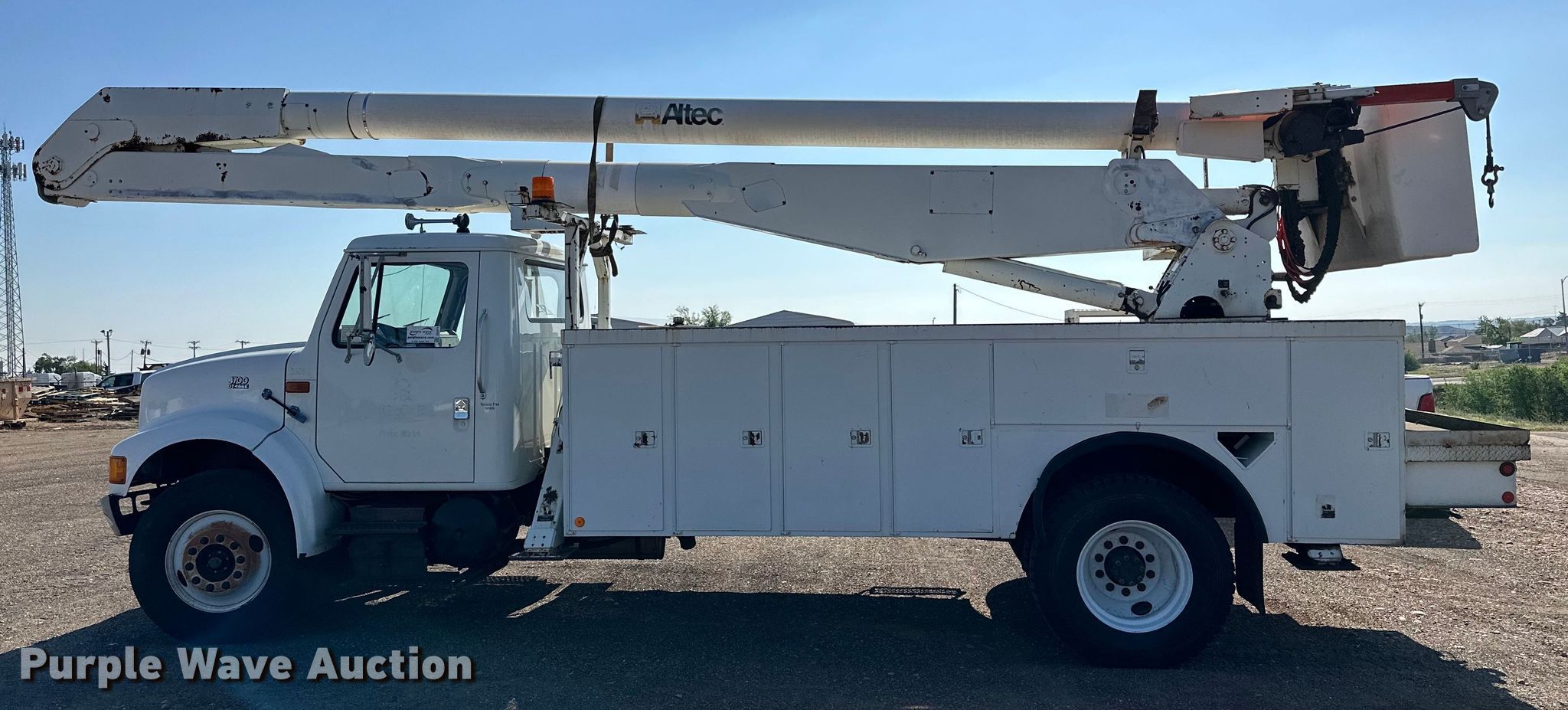 1999 International 4700 bucket truck. Miles: 56,382 on odometer, Hours: 4,812 on meter, VIN: 1HTSCAAN1XH678156. Engine Displacement: 7.6L, Cylinders: 6, Fuel type: Diesel. Transmission Automatic. Chassis Axles: Single, Suspension: Spring, Brakes: Air, PTO. Interior AC, Heat, Cruise control, Brake controller. Features Bed Altec, 17' L x 96" W, Boom Altec, Mast height: 55', Maximum lift capacity: 700lbs, Boom type: Articulating, Insulated, Man basket, Boom controls Ground, Platform/ basket, Material handler. Tires Size: 11R22.5. Notes Non-operational basket controls. Texas title. City of Borger, TX. Borger, TX 79007