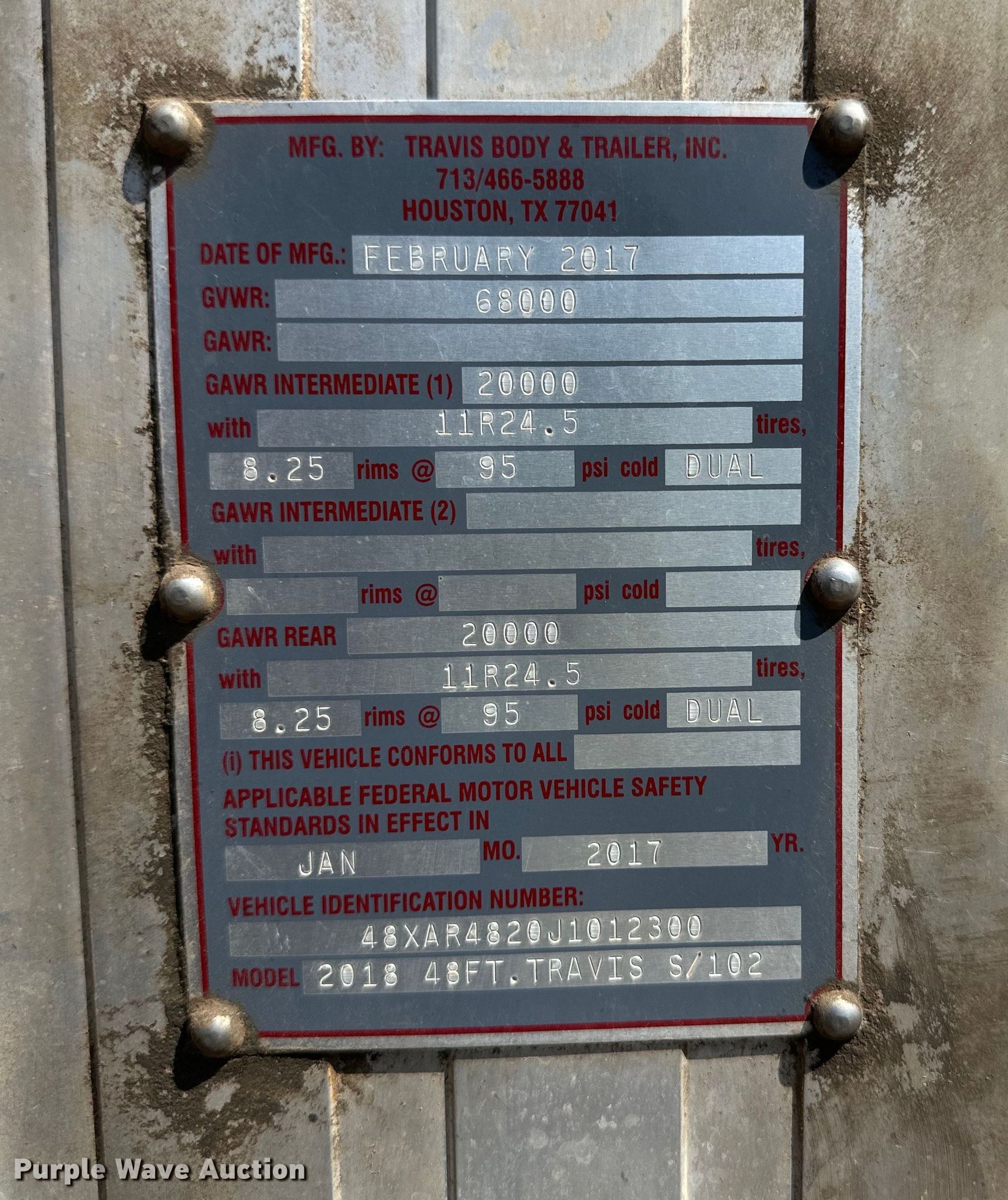 Purple Wave is selling a used Grain or Commodity Trailer in Texas. This item is a 2018 Travis Body & Trailer walking floor trailer with the following: VIN: 48XAR4820J1012300