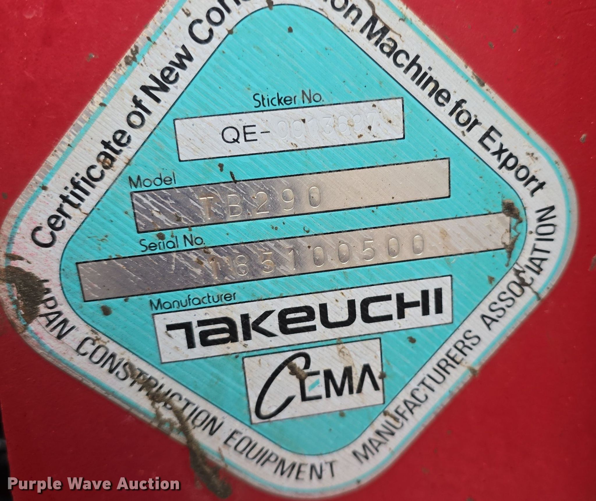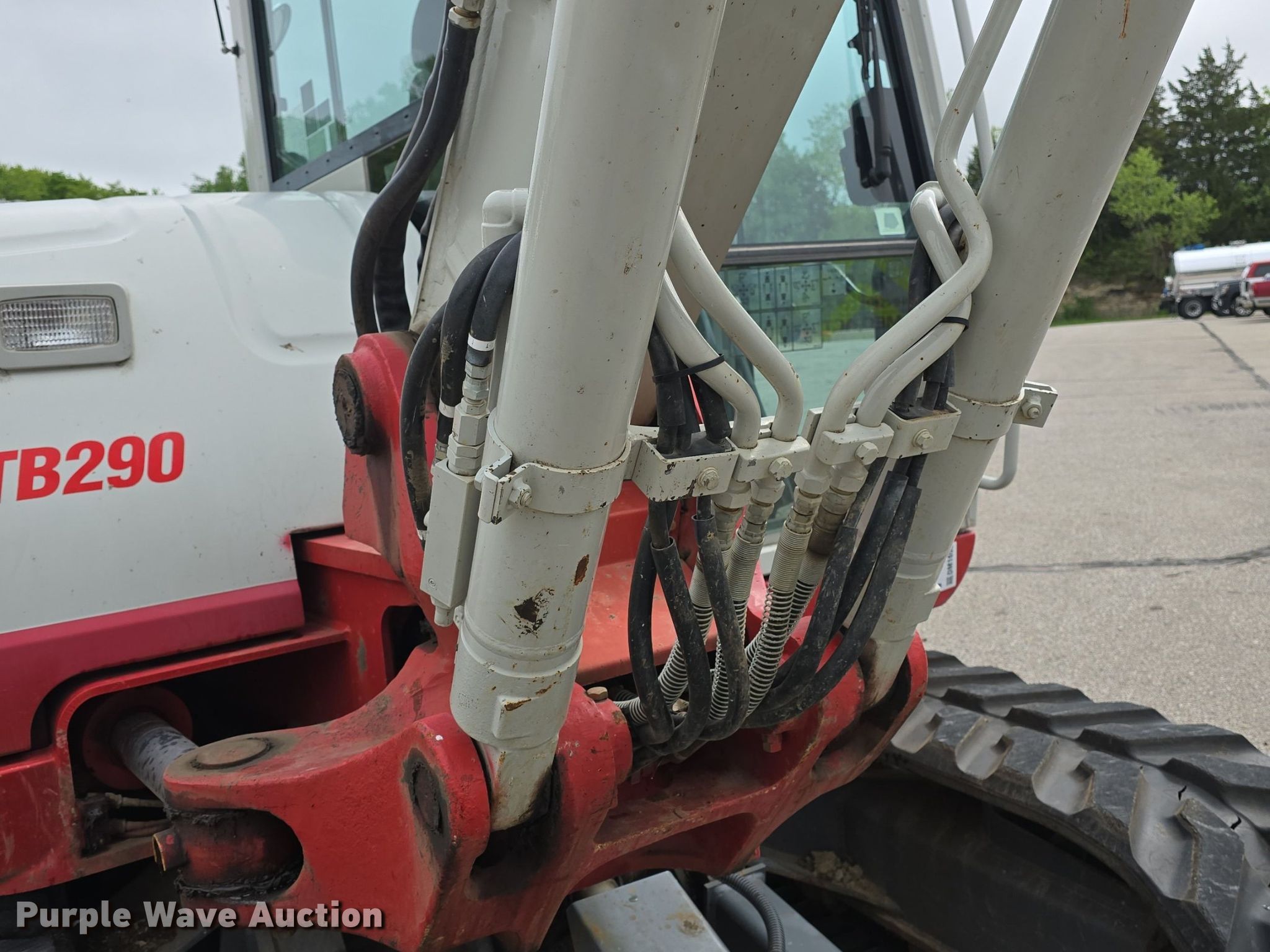 2014 Takeuchi TB290 mini excavator. Hours: 1,961 on meter, Serial: 185100500, Unit #: JCWLM590. Engine Yanmar, Cylinders: 4, Fuel type: Diesel, kW: 49.6. Transmission Hydrostatic, Two speed travel. Operators station Enclosed cab, AC, Heat, Pattern changer. Features Auxiliary hydraulics, Backfill blade Width: 90", Boom Standard, Stick Stick length: 85", Quick coupler: Mechanical TAG, Thumb: Hydraulic Model: TAG, Bucket GP, Width: 24", Cutting edge: Weld-on, Teeth: 5, (2) GP buckets 16" W, 18" W Teeth Weld-on, Teeth: 4.. Tracks Width: 18", Rubber. Johnson County, KS. Olathe, KS 66061