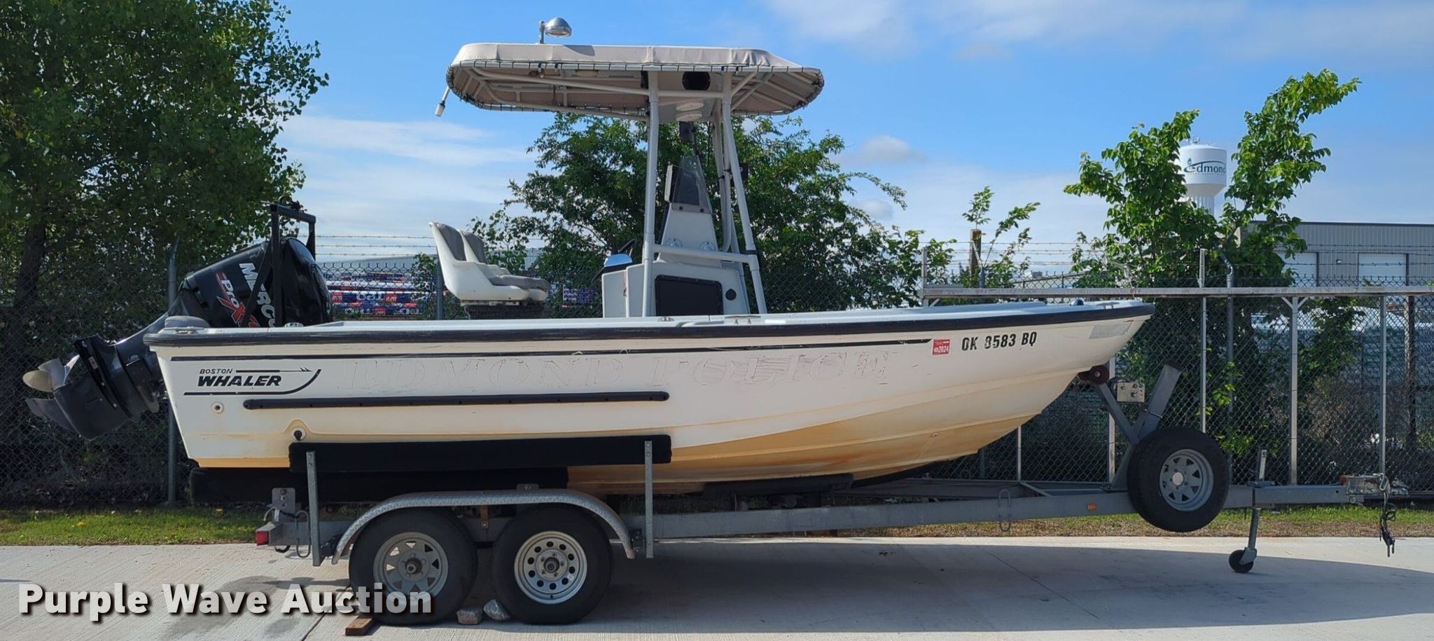 Purple Wave is selling a used Boat in Oklahoma. This item is a 2003 Boston Whaler boat with the following: Hours: 142 on meter, Actual hours unknown, Length: 19' 8", Hull ID: WCG00229F303, Unit #: 2034355