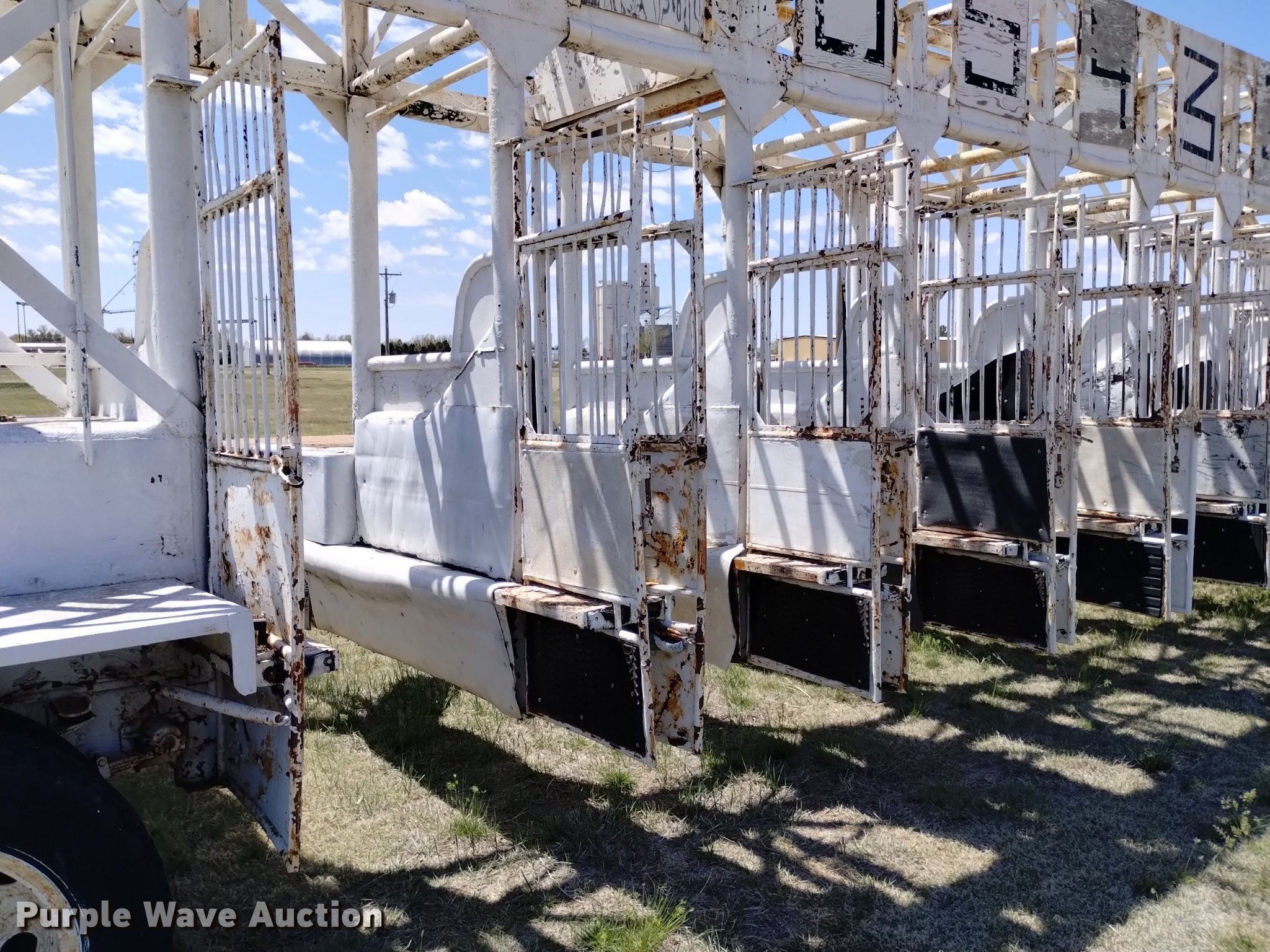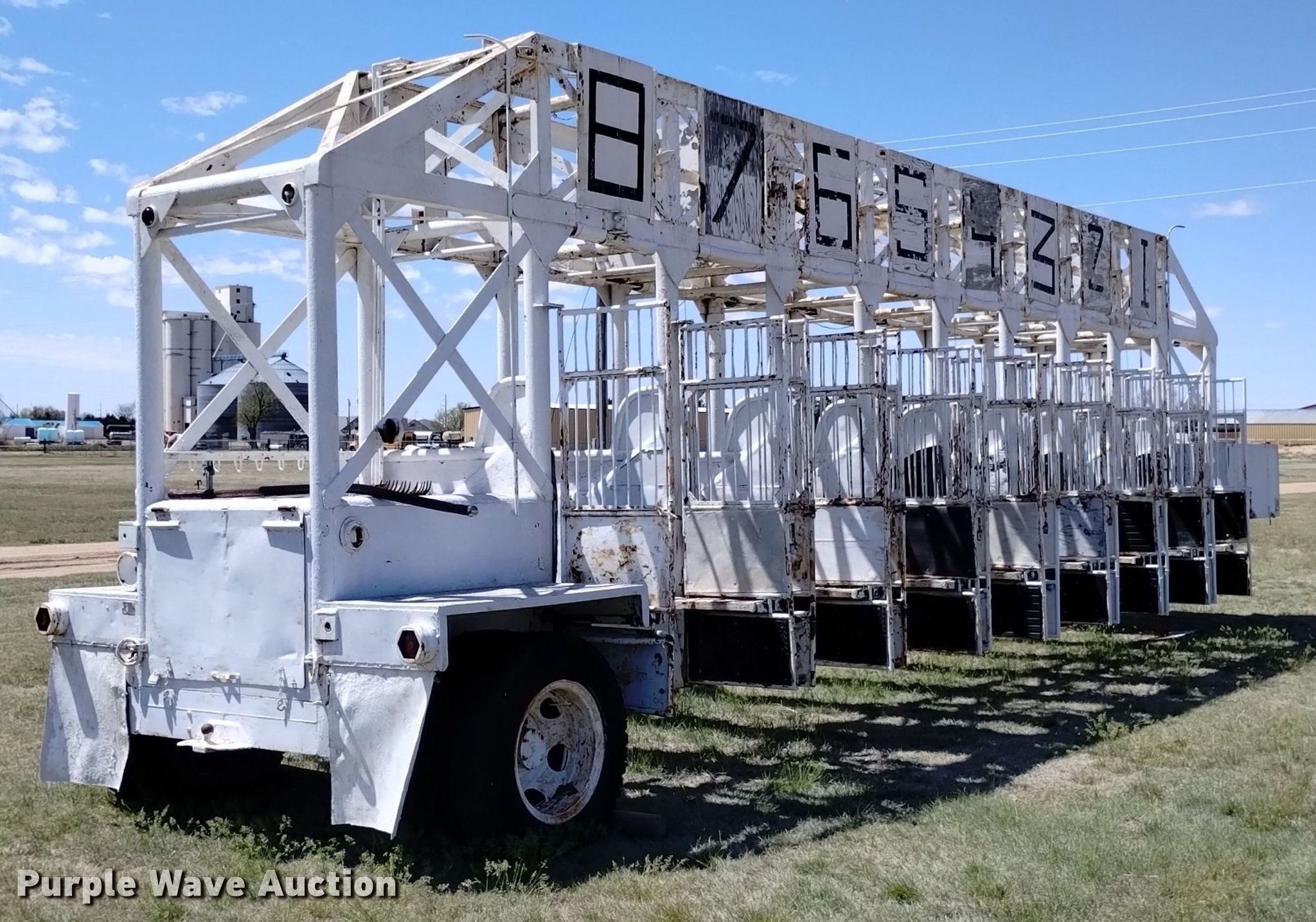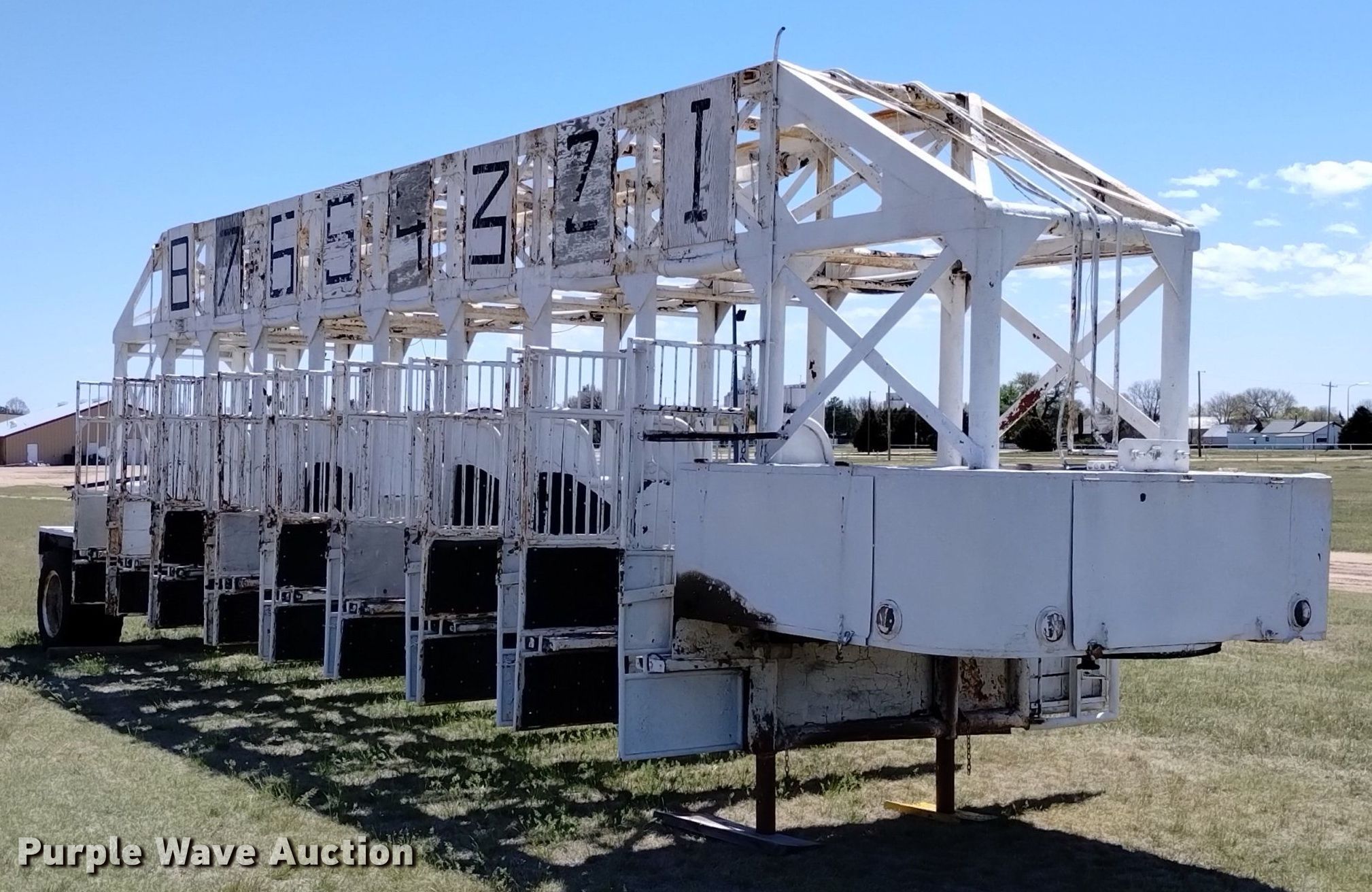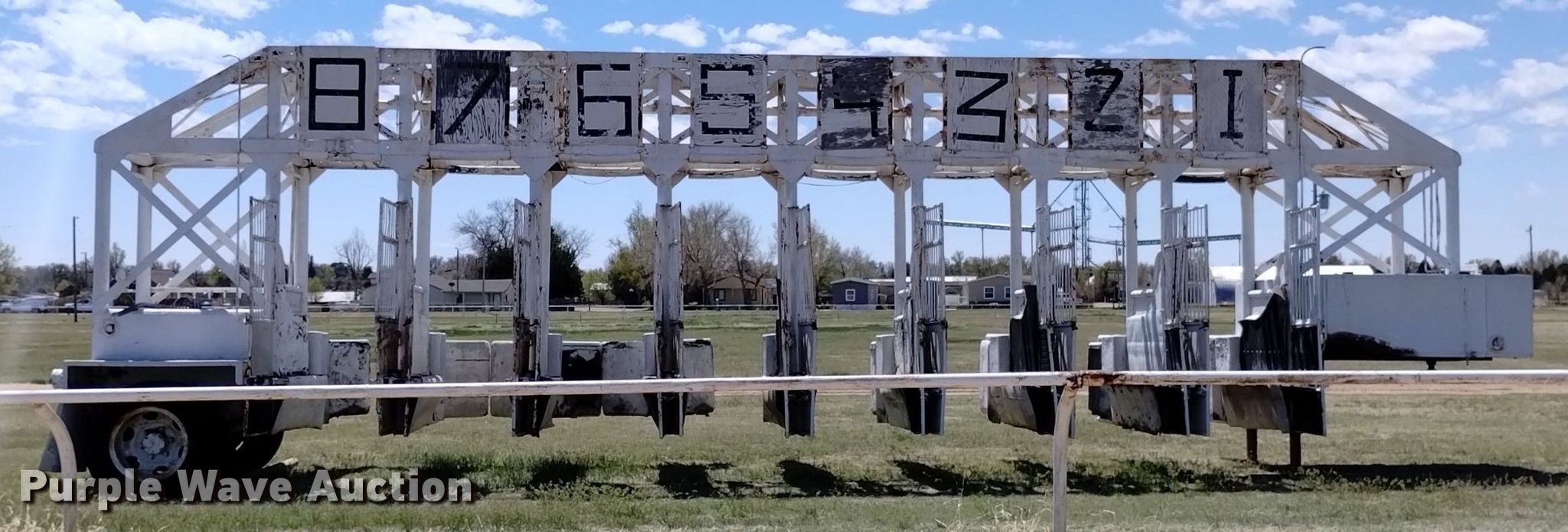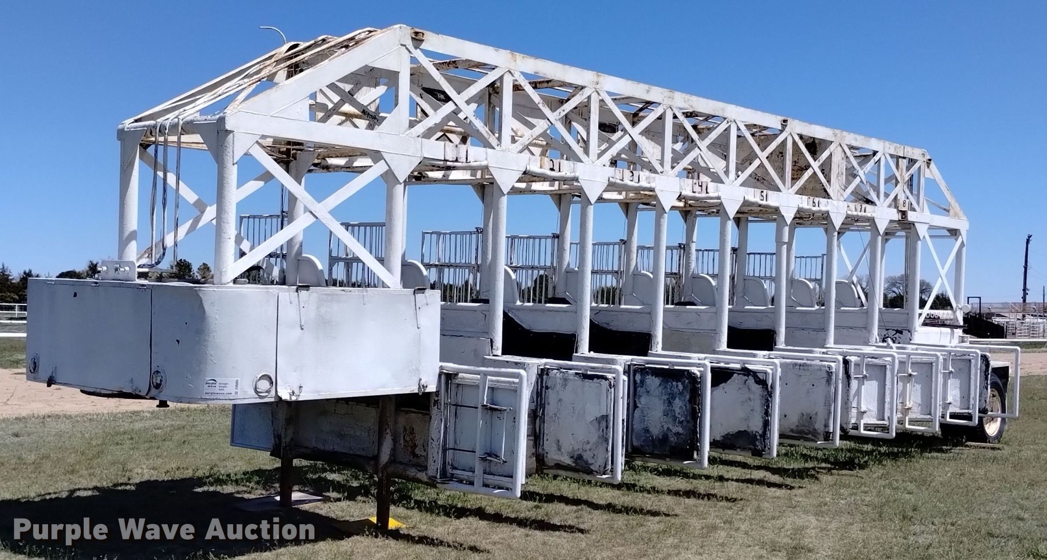 Keiser 1955 starting gate. Serial: 5355. Dimensions 38' L x 96" W. Features (8) gates Electric, Manual override. Chassis Landing gear: Dual, Suspension: Spring, Brakes: Hydraulic. Tires Size: 8.25-20. Notes Non-operational electric gate feature. Colorado title. Title distribution may be delayed up to 14 days from verification of funds. Yuma County Fairgrounds. Yuma, CO 80759