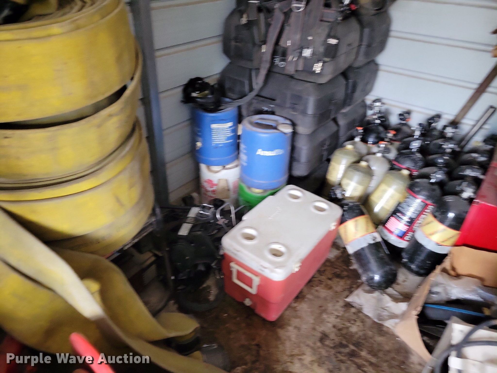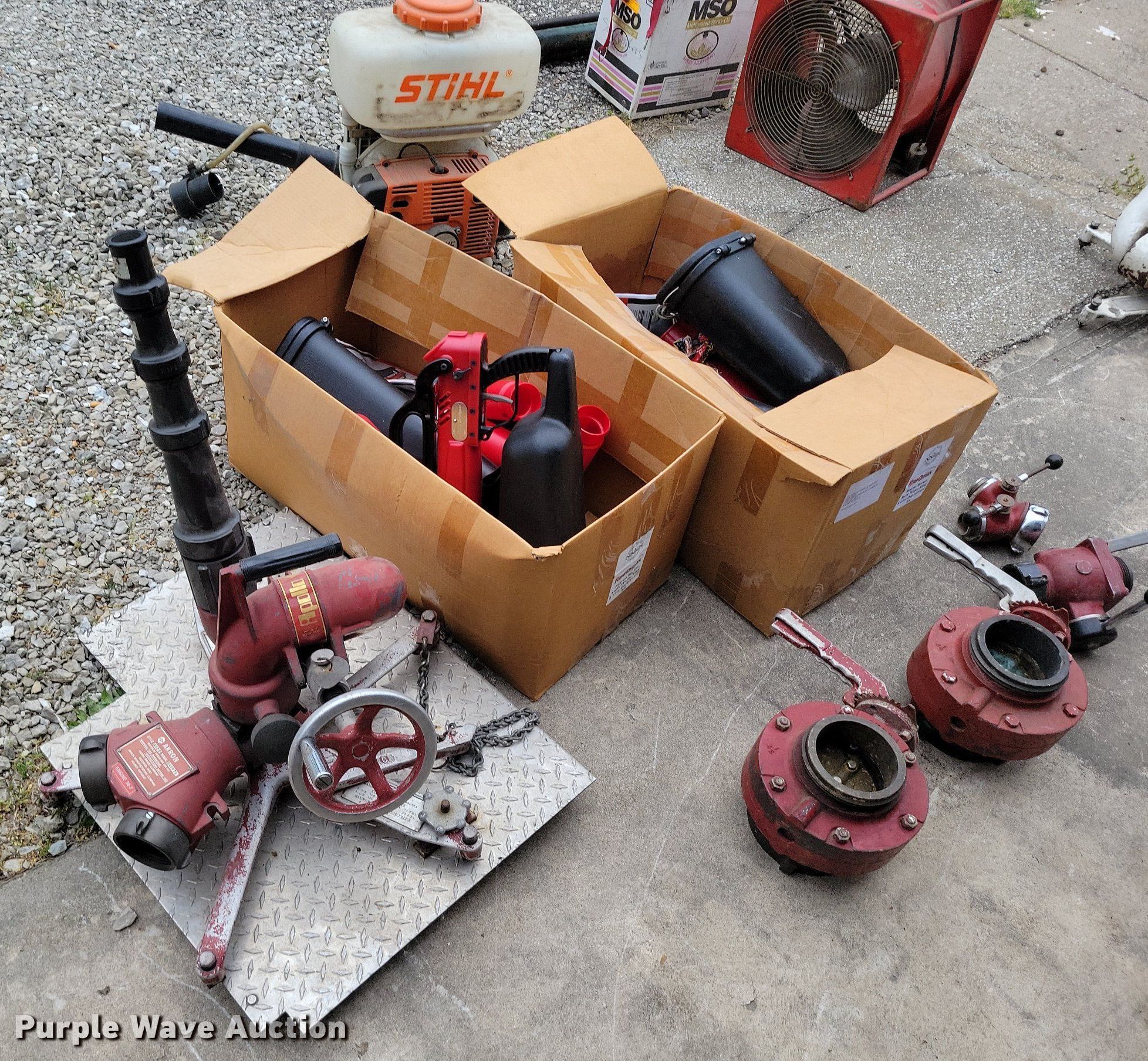 Purple Wave is selling a used Tools in Missouri. This item is a Fire rescue equipment with the following: (12) air packs, Backpacks, Leaf blower, Fan, Water valves, Water safety device, Spray turret, Powermate generator, Hydraulic powerpack kit, Briggs and Stratton Quantum engine, Fuel type: Gas, HP: 4