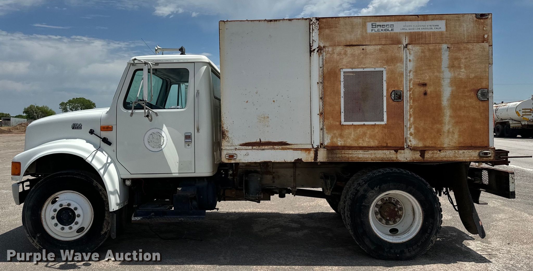 Purple Wave is selling a used Vacuum Truck in Oklahoma. This item is a 2002 International 4700 sewer jetter truck with the following: Miles: 83,944 on odometer, VIN: 1HTSCABN92H504939, Unit #: 806