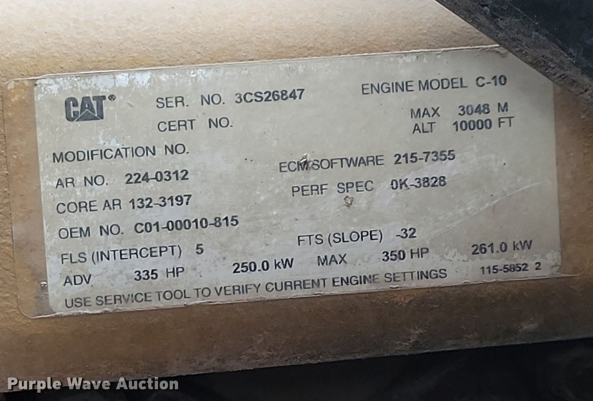 2003 Sterling LT9500 dump truck. Miles: 356,472 on odometer, VIN: 2FZHAZAN23AL09284. Engine Caterpillar C10, Serial: 3CS26847, Displacement: 10.3L, Cylinders: 6, Fuel type: Diesel, HP: 335, kW: 250, Engine brake. Transmission Eaton Fuller Smart Shift, Automated manual. Chassis Axles: Tandem, Differential lock: Full, Suspension: Spring over walking beam, Brakes: Air, PTO, Front mount PTO. Interior AC, Heat, Heated mirrors, Power windows, Cruise control. Features Dump bed 15' L x 96" W, Side height: 34", Side board height: 8", Bed type: Steel, Ram: Single, End gate: Air operated, Mid-mount plow Width: 120". Tires Front: 385/65R22.5, Rear: 11R22.5. Notes Bed lift cylinder leak, Dash warning indicator: ABS. Iowa title. Seller is a government entity who will be assigning and distributing the title. Please contact the seller for distribution questions. Cerro Gordo County. Mason City, IA 50401