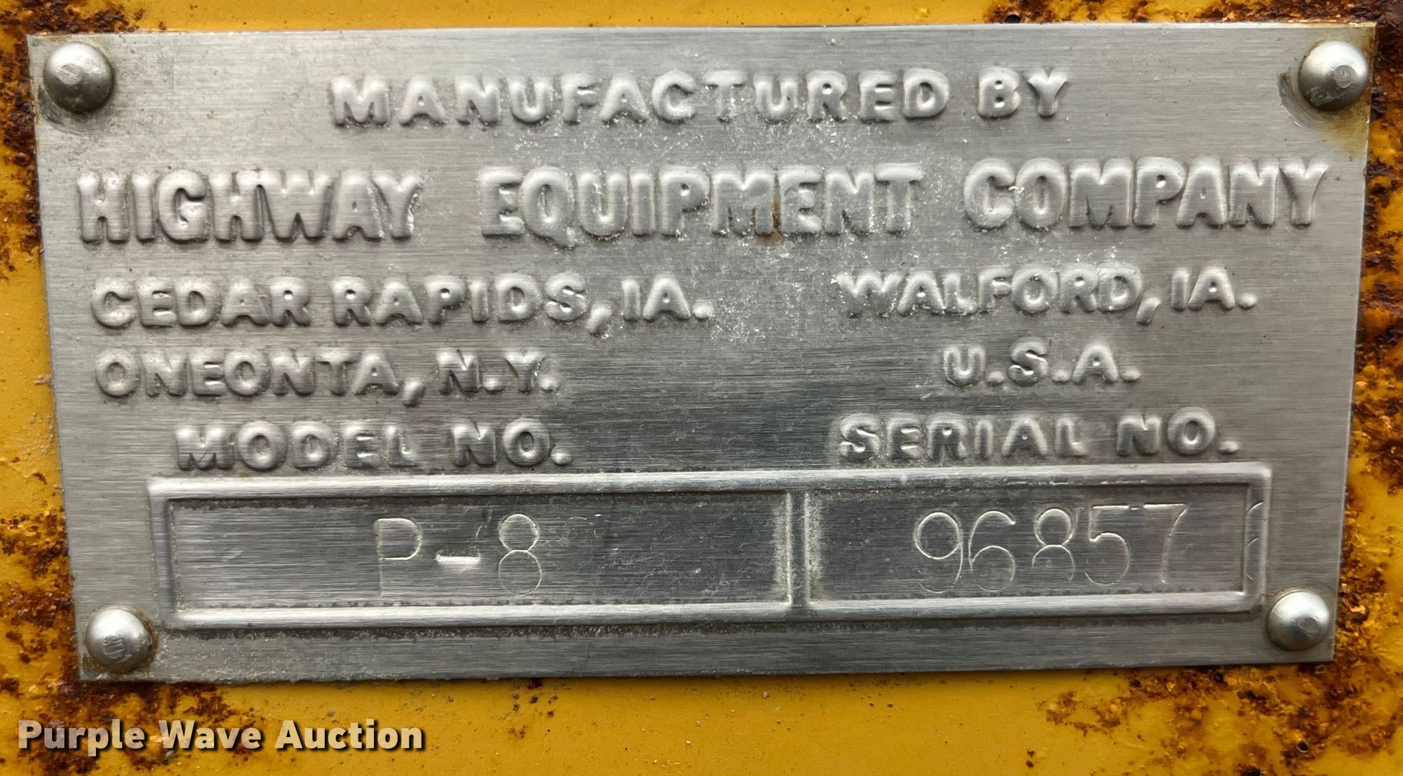 Purple Wave is selling a used Automotive Parts or Acces. in Missouri. This item is a Highway Equipment Company P-8 spreader with the following: Serial: 96857