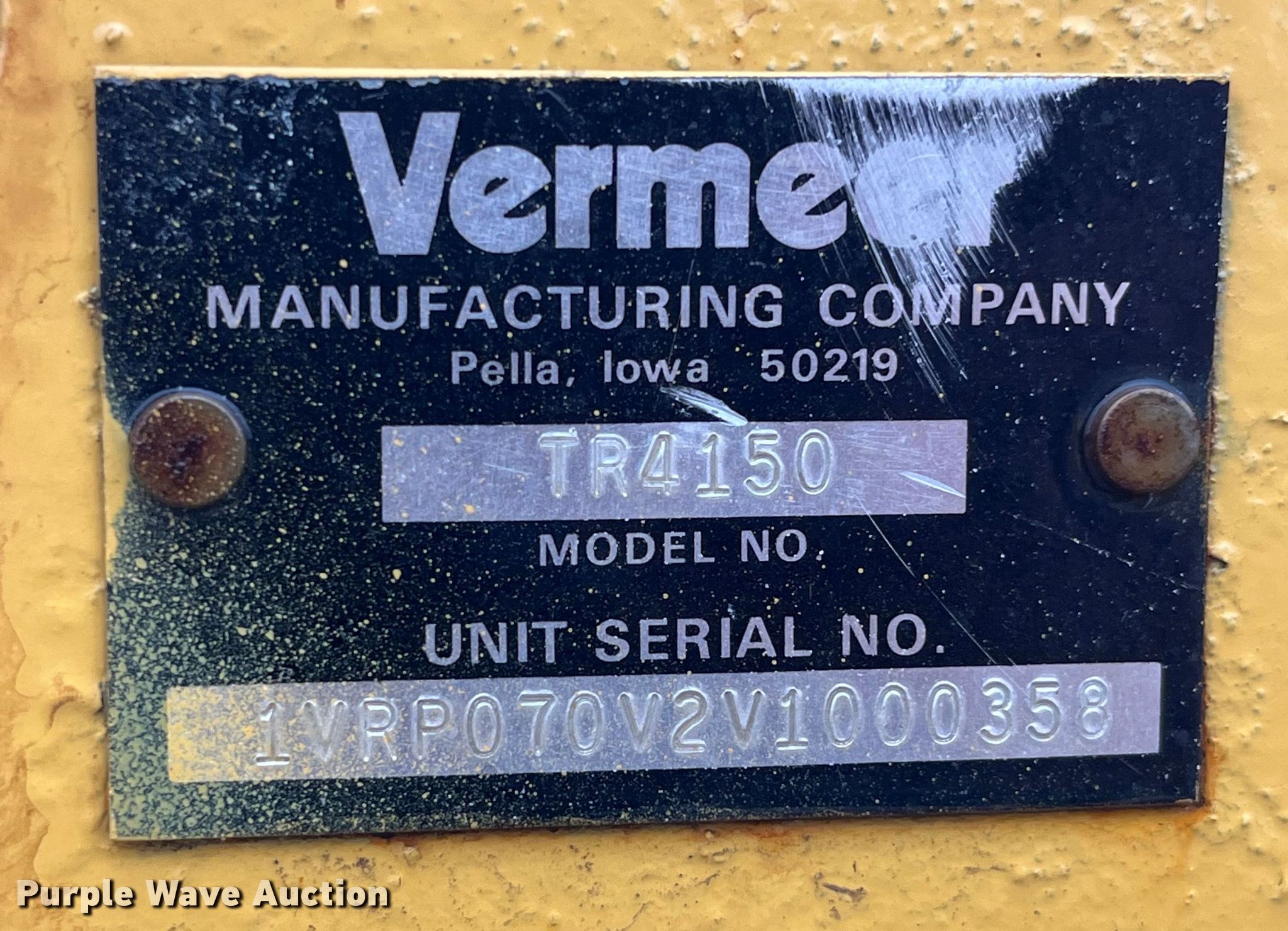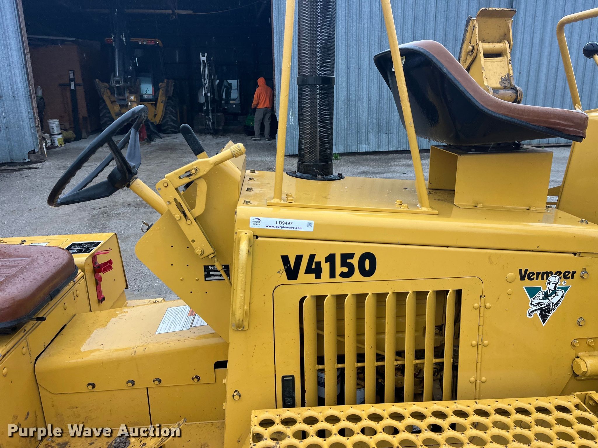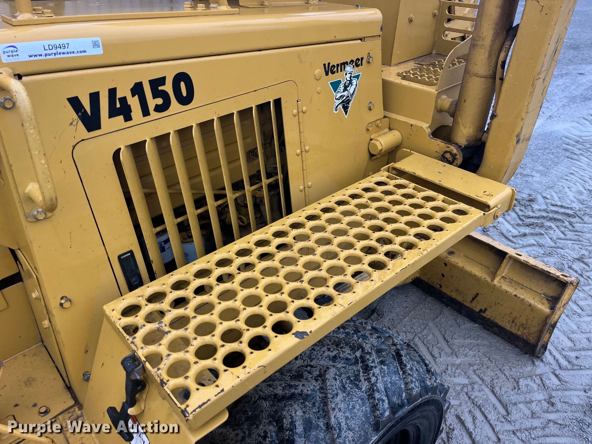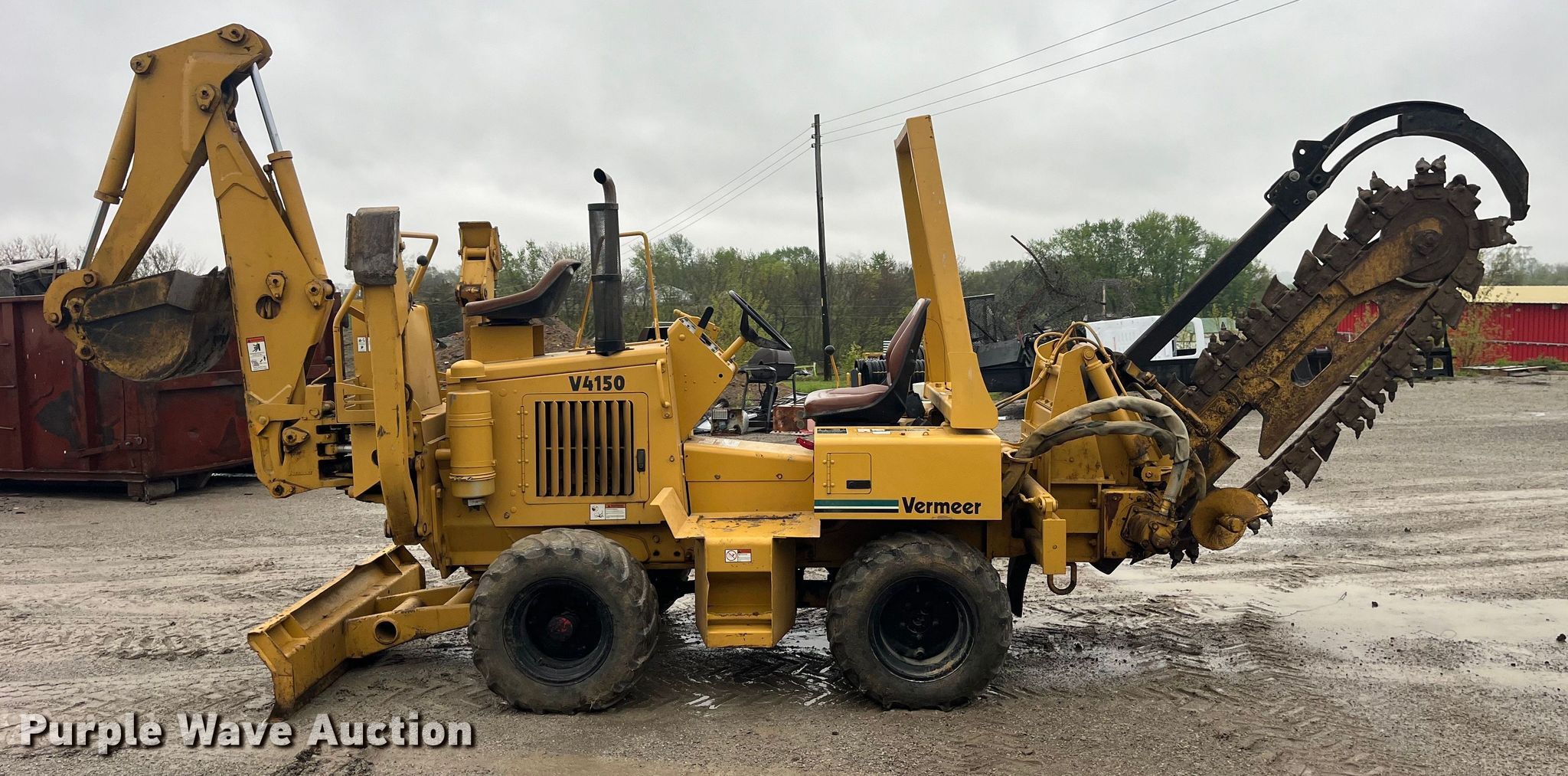 1997 Vermeer V4150A trencher. Hours: 1,306 on meter, Serial: 1VRP082R1V1000423. Engine Deutz F3L 1011F, Serial: 00165032, Cylinders: 3, Fuel type: Diesel. Transmission Hydrostatic, Four wheel drive. Features Trencher Model: TR4150, Serial: 1VRP070V2V1000358, Estimated dig depth: 72", Cutting width: 6", Side shift, Teeth: Rock, Dirt, Crumber, Backhoe Model: B600, Serial: 1VRP080B3V1000381, Bucket width: 18", Backfill blade Width: 64", Manuals included. Tires Size: 29x12.50-15. Grant City Missouri. Grant City, MO 64456