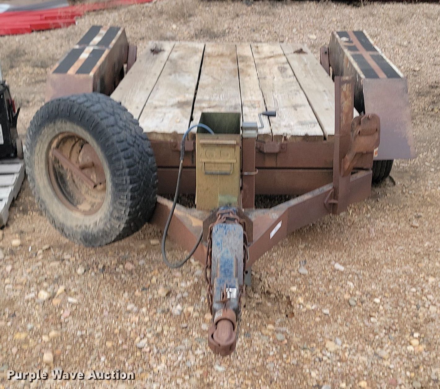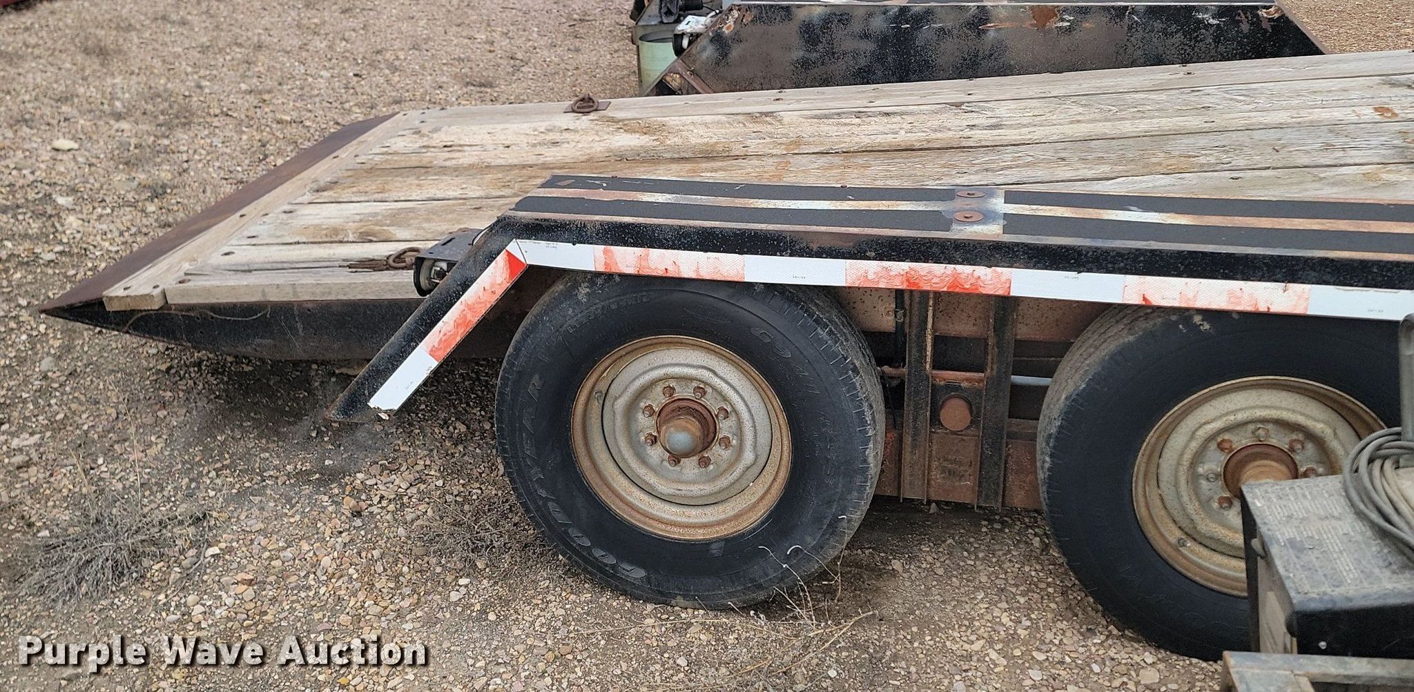 1993 Shop built tilt deck equipment trailer. Dimensions. Overall: 19' 6" L x 96" W, Deck: 13' 2" L x 65" W. Features Deck type: Wood. Chassis Ball hitch: 2 5/16", Landing gear: Single, Suspension: Spring, Brakes: Electric, Axles: Tandem. Tires Steel wheels, Size: LT235/85R16. Notes Frame cracked, Non-operational unit. South Dakota title. Meade County. 20623 Fort Meade Way. Sturgis, SD 57785