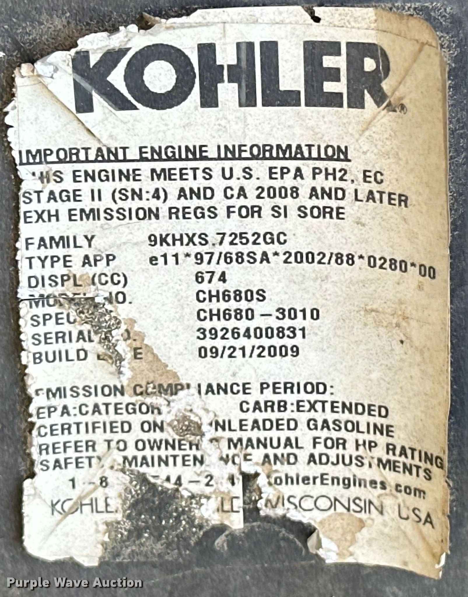 2010 Grasshopper 223 ZTR lawn mower. Hours: 2,681 on meter, Cutting width: 48", Serial: 6012438. Engine Kohler Command Pro 23, Serial: 3926400831, Displacement: 674 cc, Cylinders: 2, Fuel type: Gas, HP: 23. Transmission Hydrostatic. Operators station OROPS. Tires Front: 13x6.50-6, Rear: 23x10.50-12. Notes Dead battery, Carburetor issues, Flat tires, Unknown operating condition. Stilwell, OK 74960