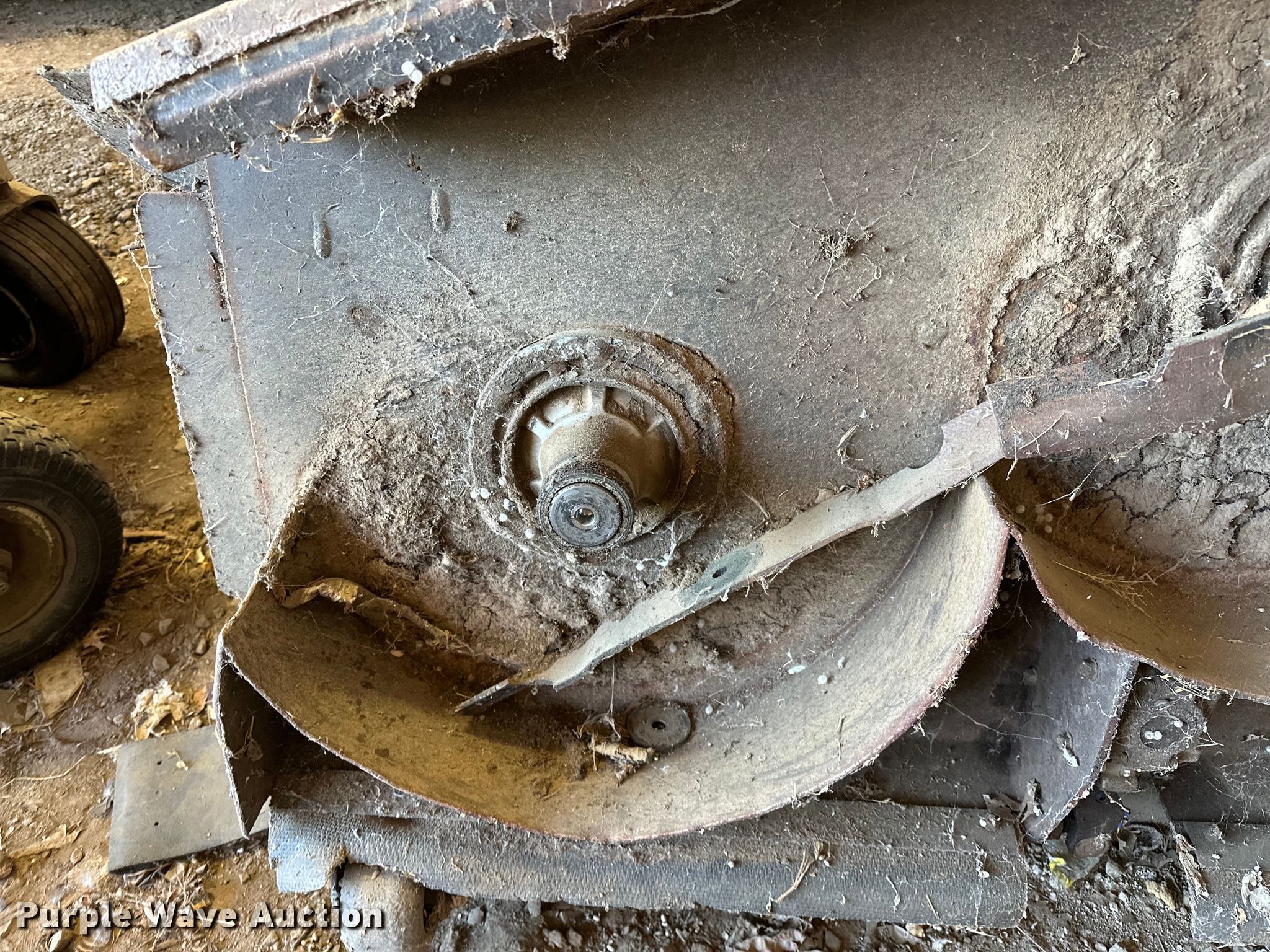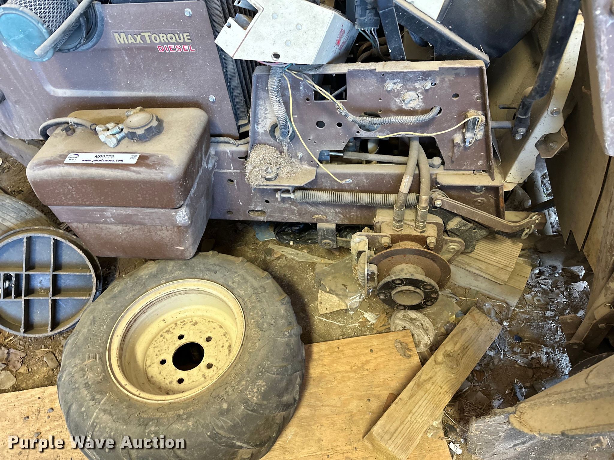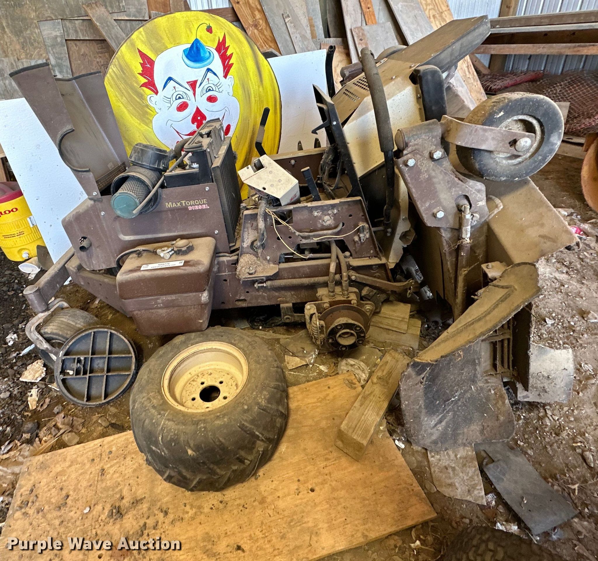 Grasshopper 722D ZTR lawn mower. Hours: 858 on meter, Cutting width: 61". Engine Kubota D902-E, Displacement: 0.898L, Cylinders: 3, Fuel type: Diesel. Transmission Hydrostatic. Features Flip up front deck. Tires Front: 22x11.00-10, Rear: 13x6.50-6. Notes Dead battery, Flat tires, Tire removed, Parts may be missing, Non-operational unit. Stilwell, OK 74960