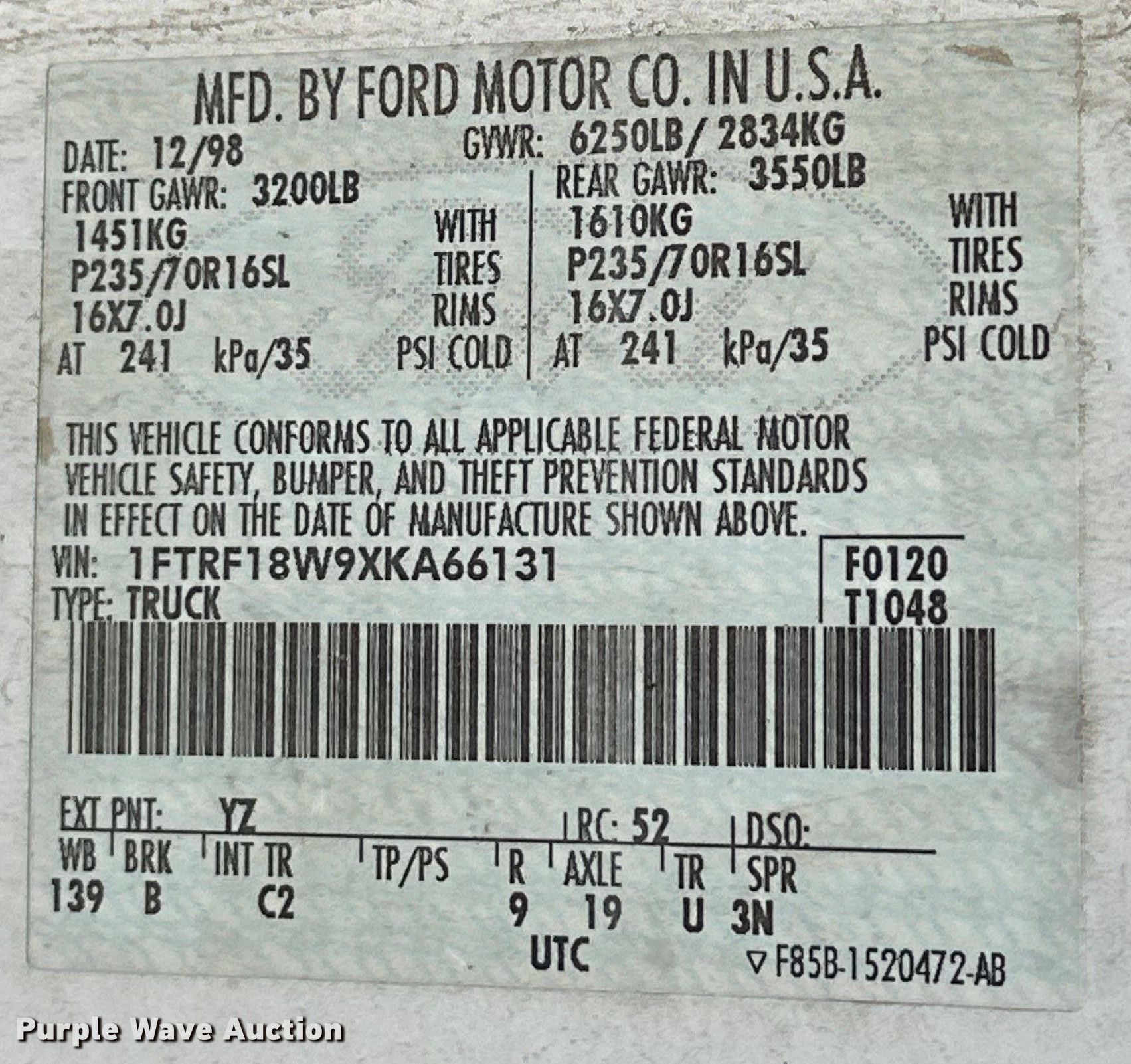Purple Wave is selling a used 1/2 Ton Pickup or Van in Oklahoma. This item is a 1999 Ford F150 pickup truck with the following: Miles: Unknown, VIN: 1FTRF18W9XKA66131