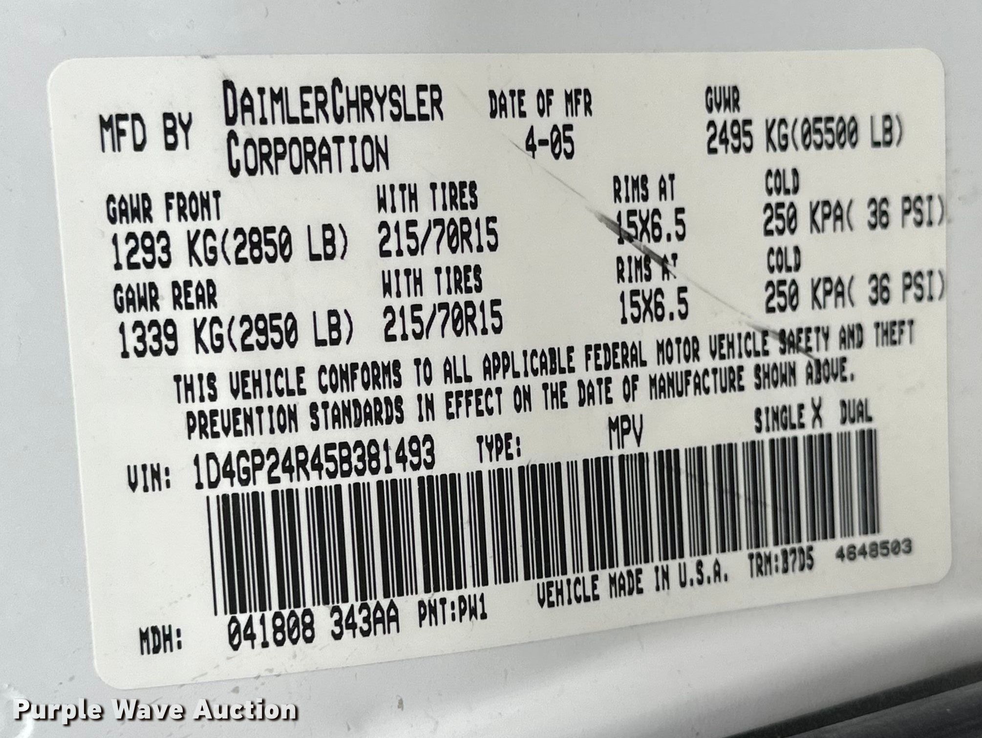 Purple Wave is selling a used Passenger Vehicle in Kansas. This item is a 2005 Dodge Grand Caravan van with the following: Miles: 196,088 on odometer, VIN: 1D4GP24R45B381493