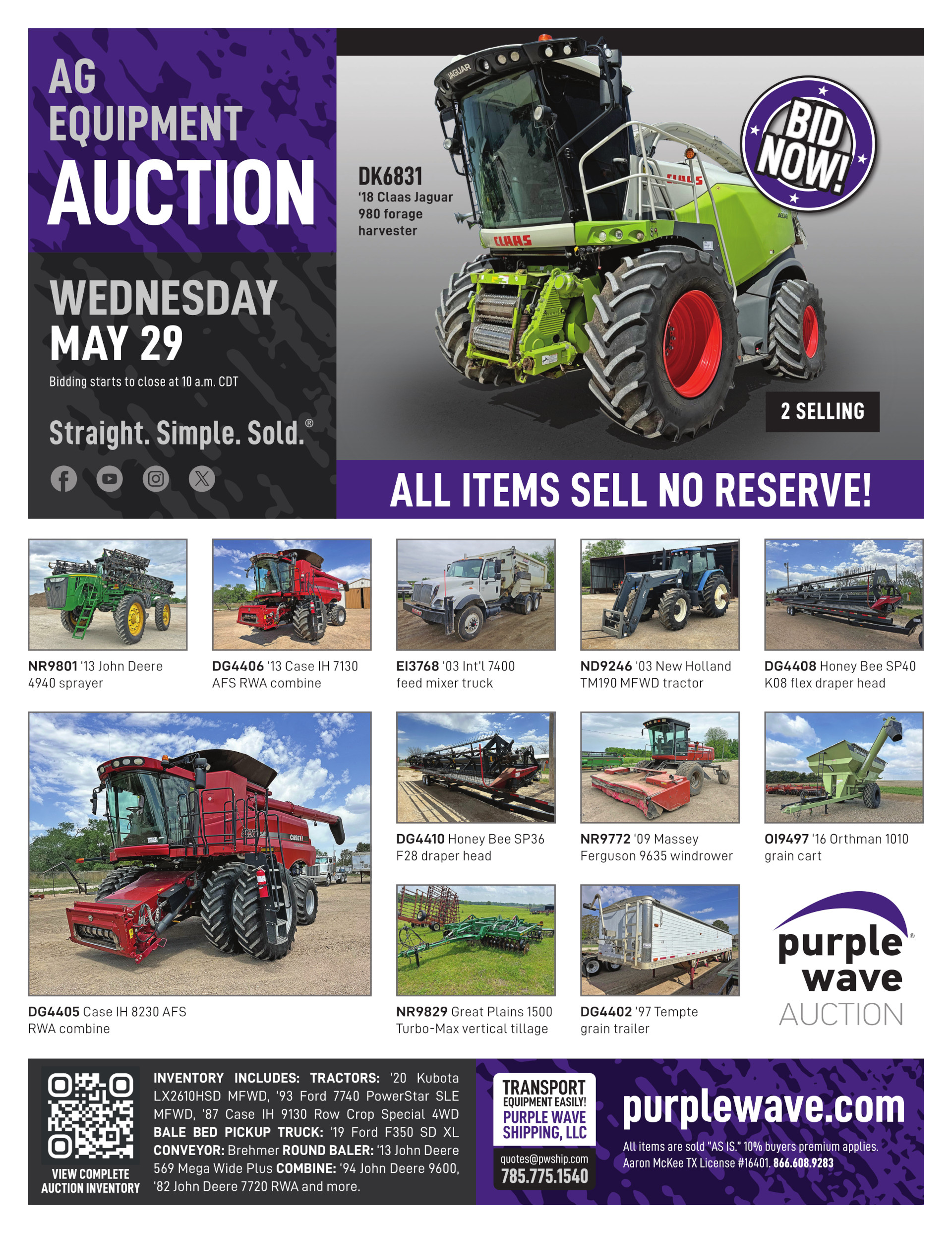 This auction is conducted by Purple Wave, Inc., whose home office is 825 Levee Drive, Manhattan, Kansas. Aaron McKee, Texas auctioneer license # 16401, operates Purple Wave, Inc. Complaints against us may be directed to the Texas Department of Licensing and Regulation, P.O. Box 12157, Austin, Texas 78711, (512) 463-6599. For additional required information, see the attached document.