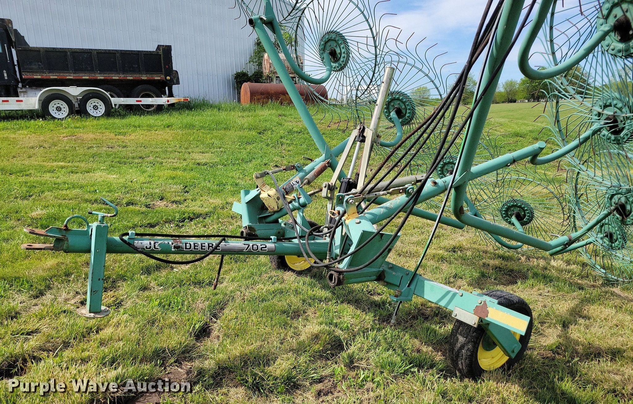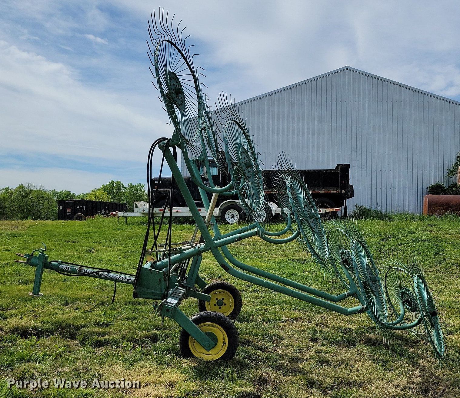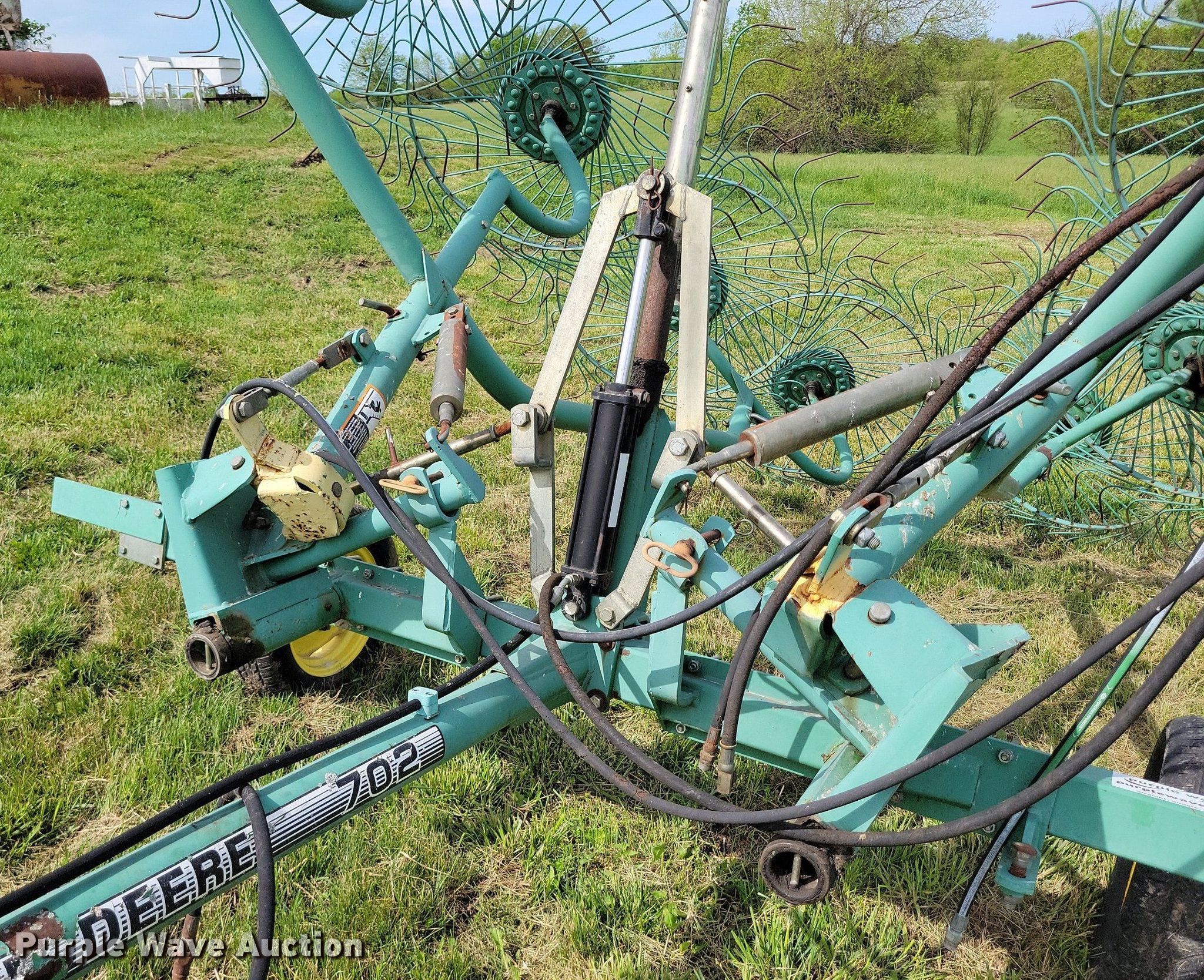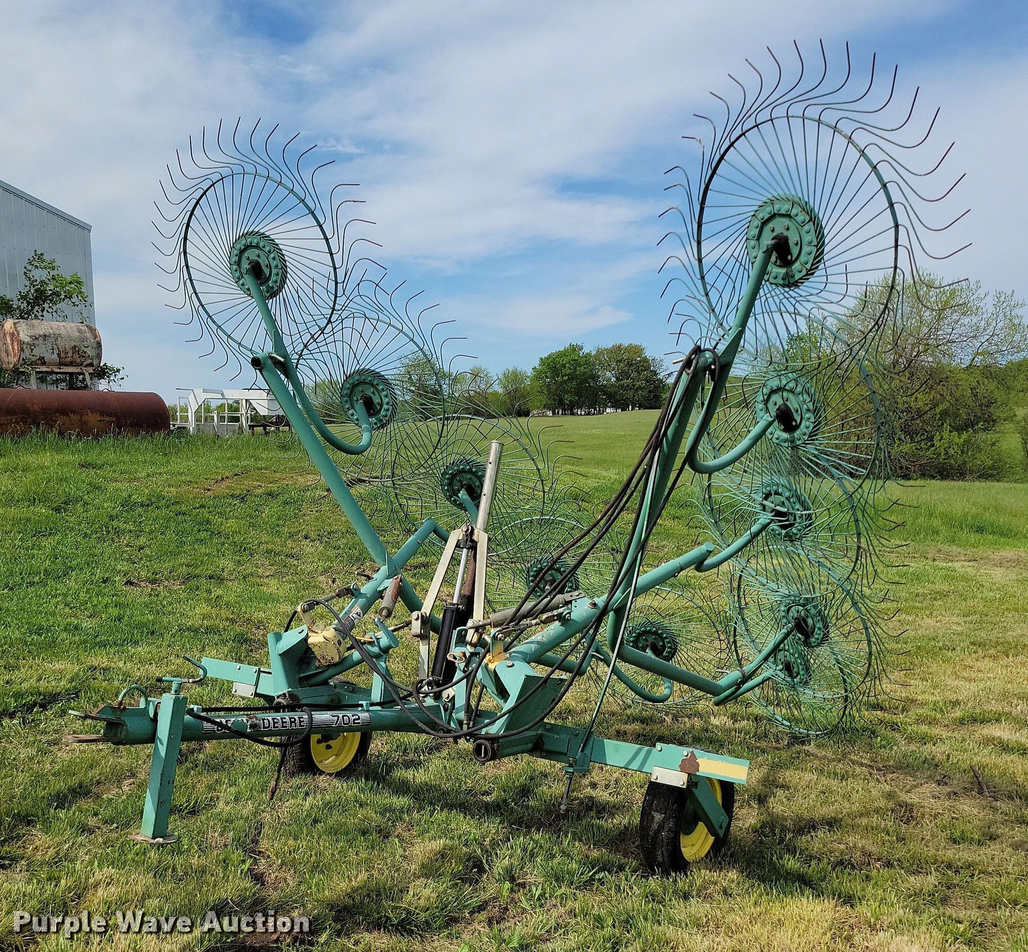 Purple Wave is selling a used Hay Rake in Missouri. This item is a John Deere 702 hay rake with the following: Wheels: 10, Diameter: 54", Hydraulic fold, Ground driven