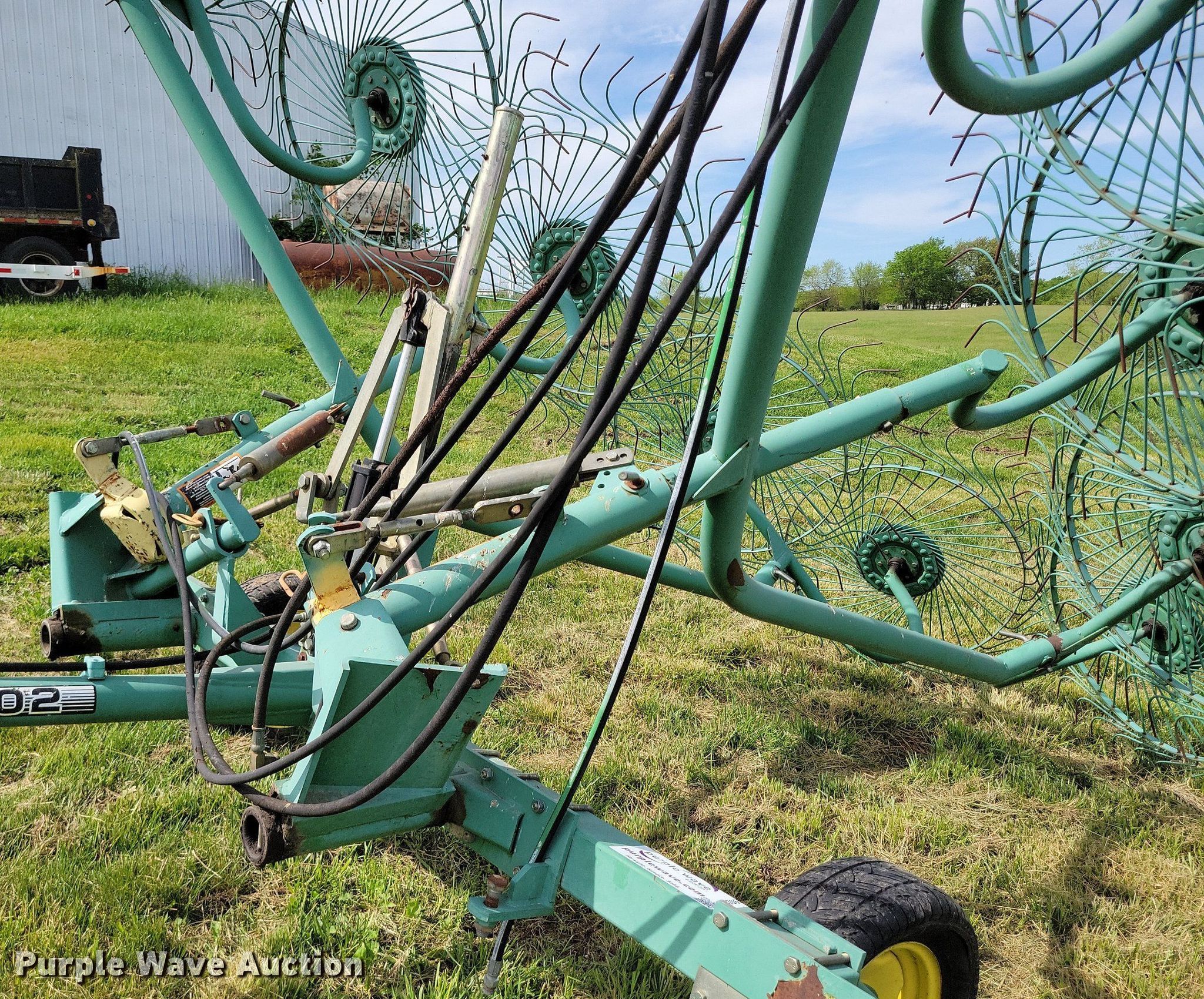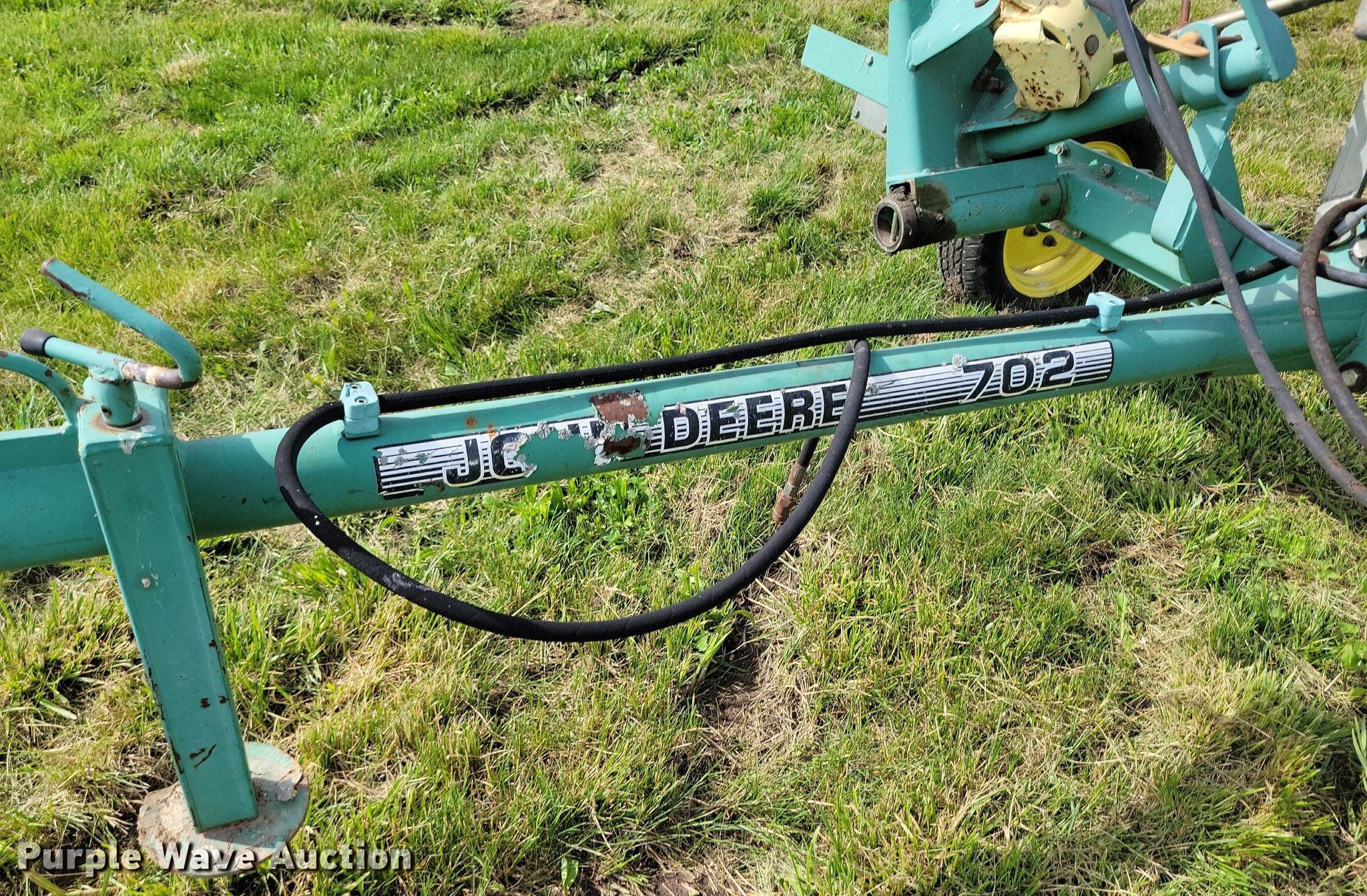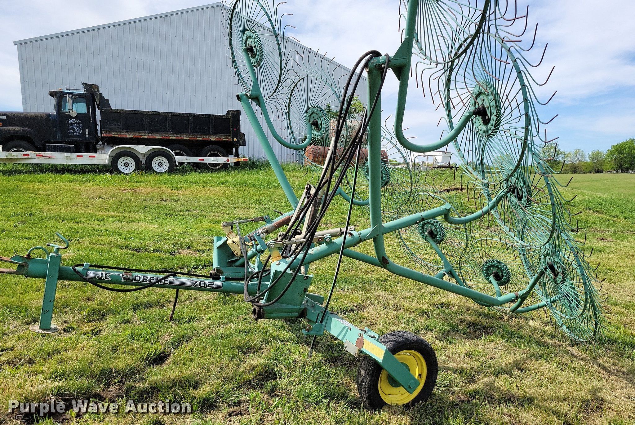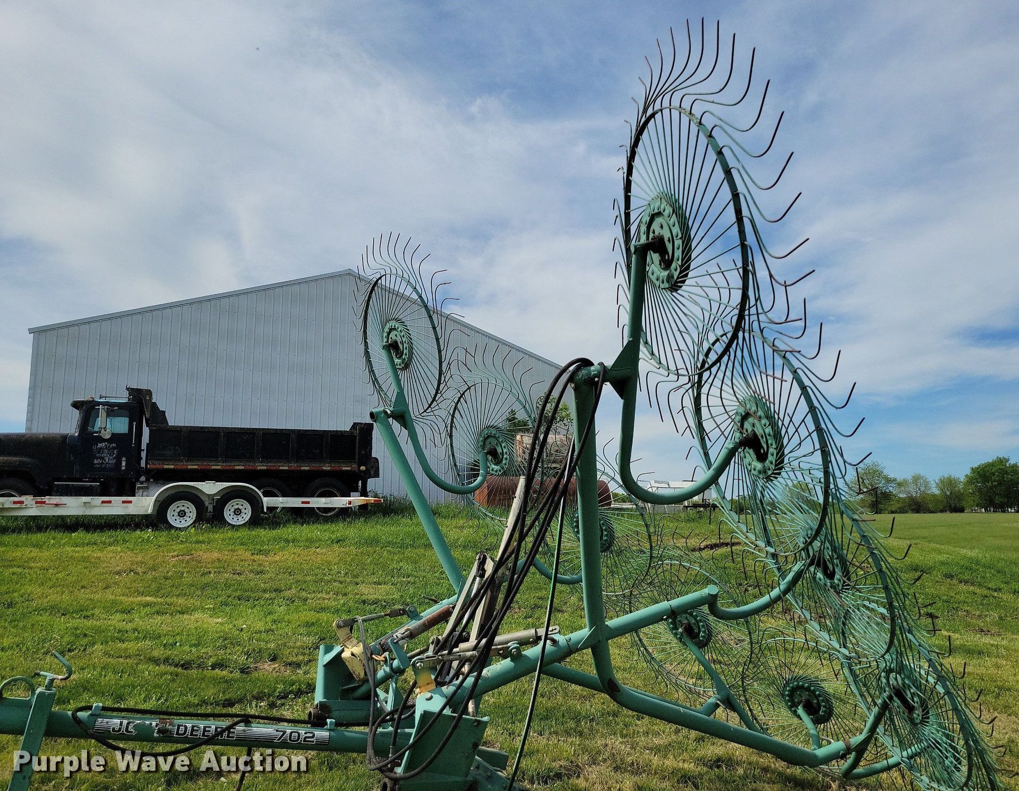 Purple Wave is selling a used Hay Rake in Missouri. This item is a John Deere 702 hay rake with the following: Wheels: 10, Diameter: 54", Hydraulic fold, Ground driven