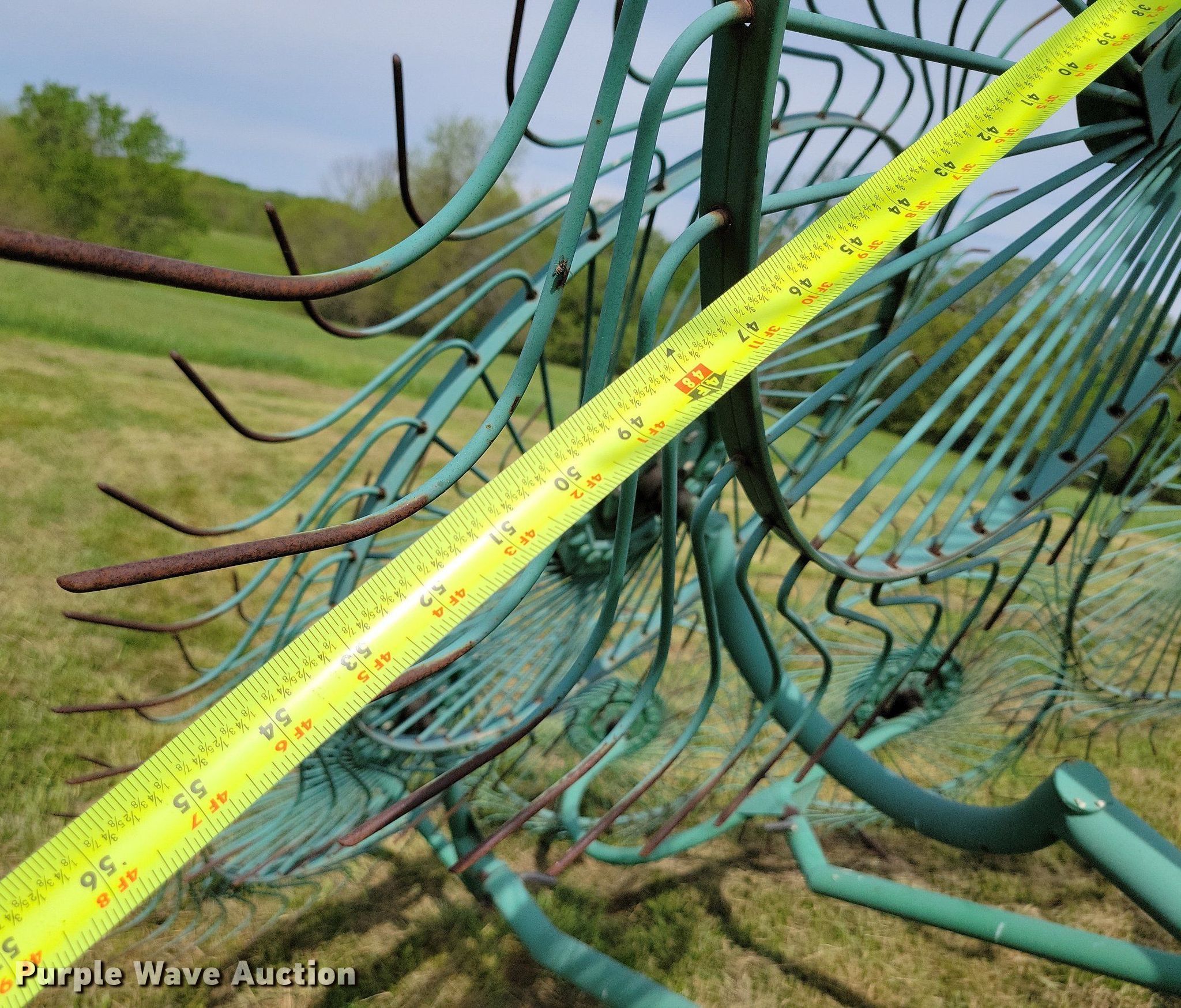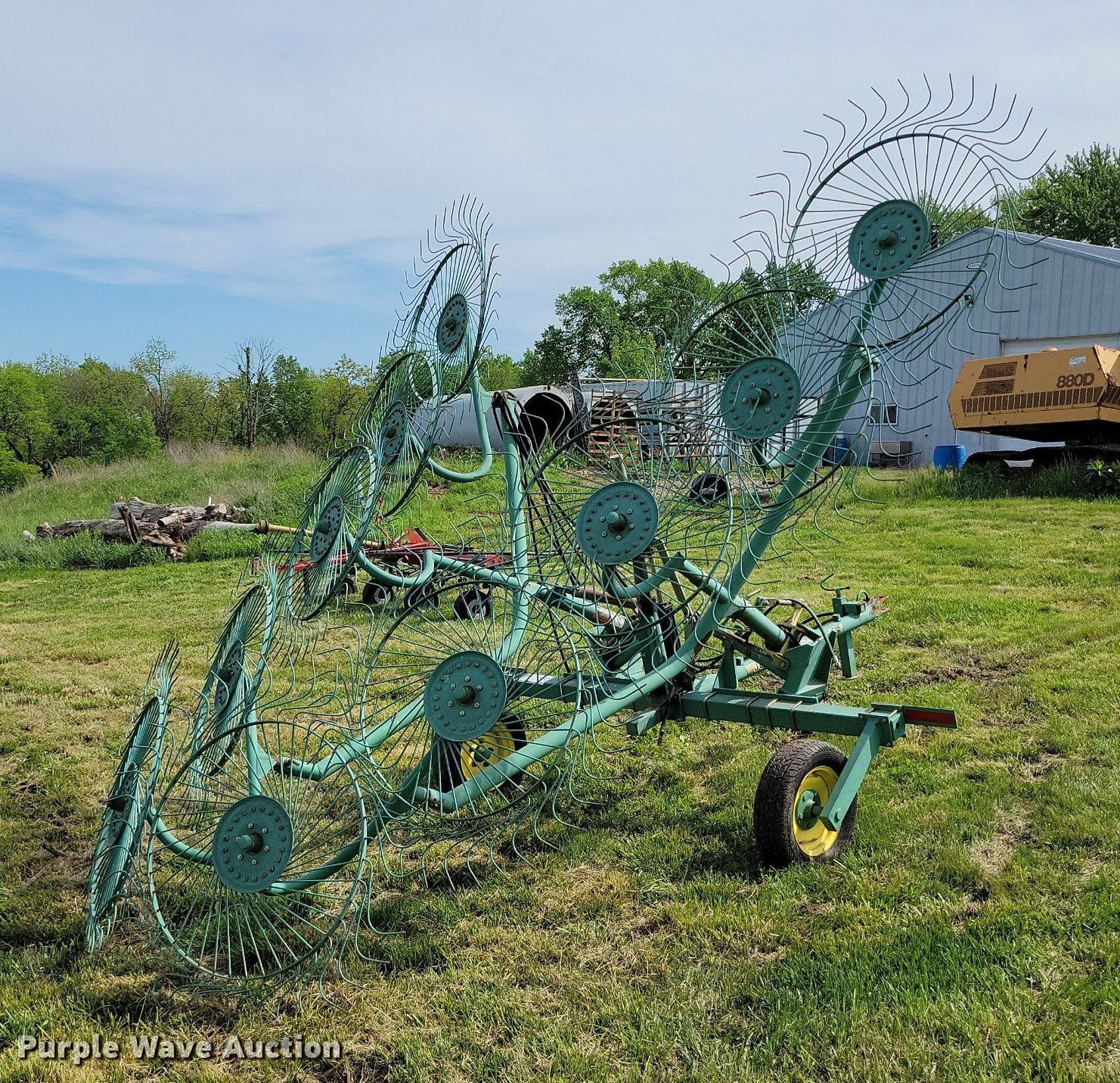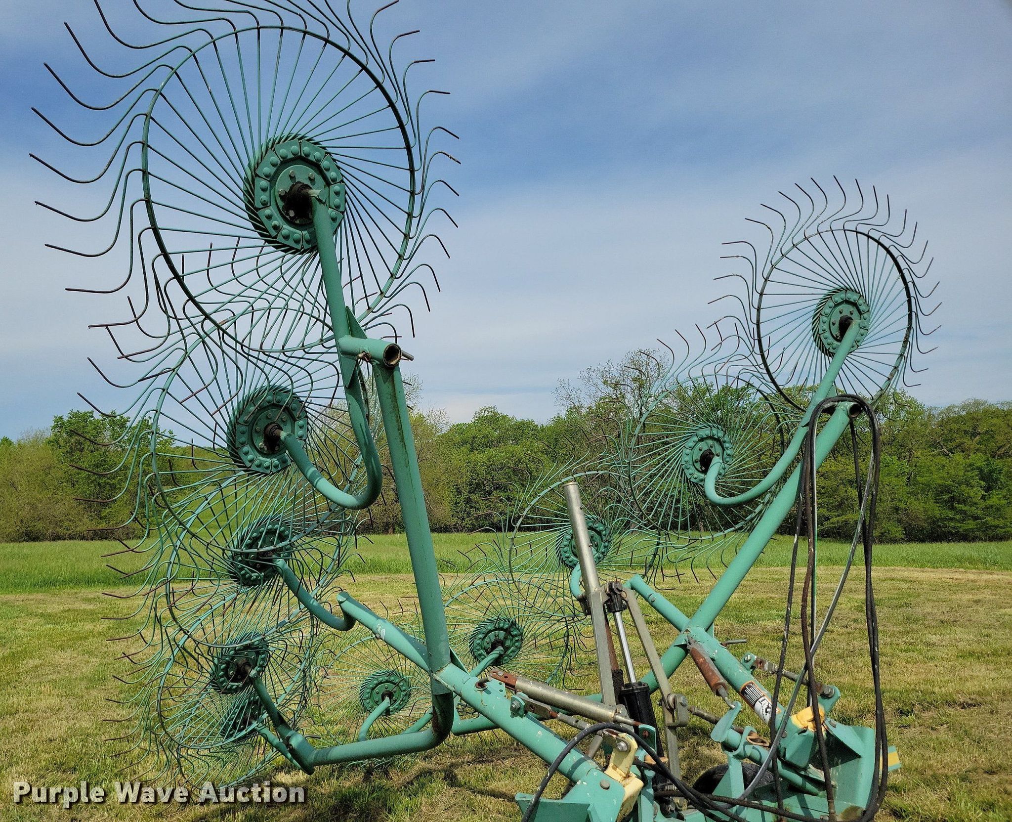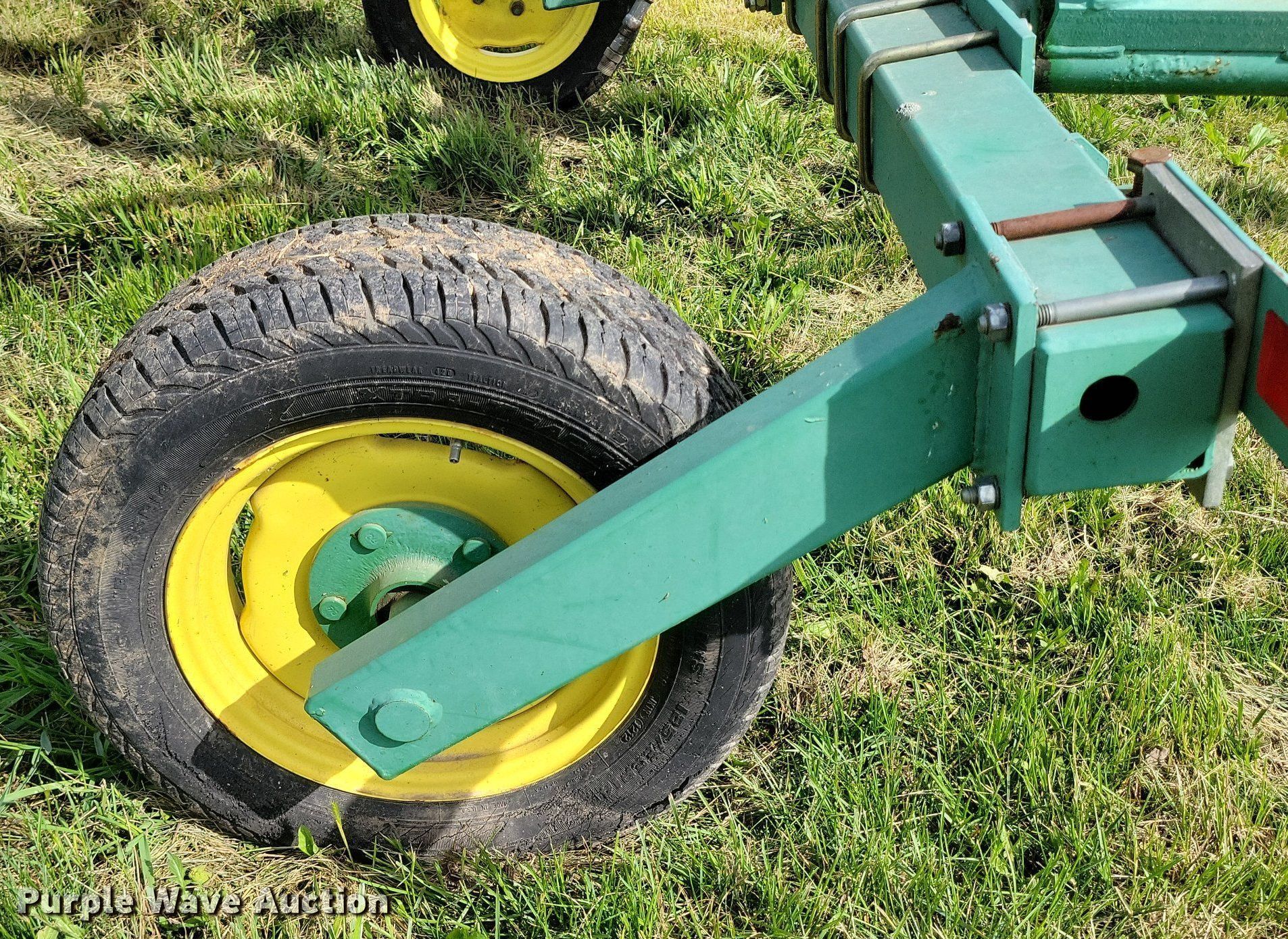Purple Wave is selling a used Hay Rake in Missouri. This item is a John Deere 702 hay rake with the following: Wheels: 10, Diameter: 54", Hydraulic fold, Ground driven