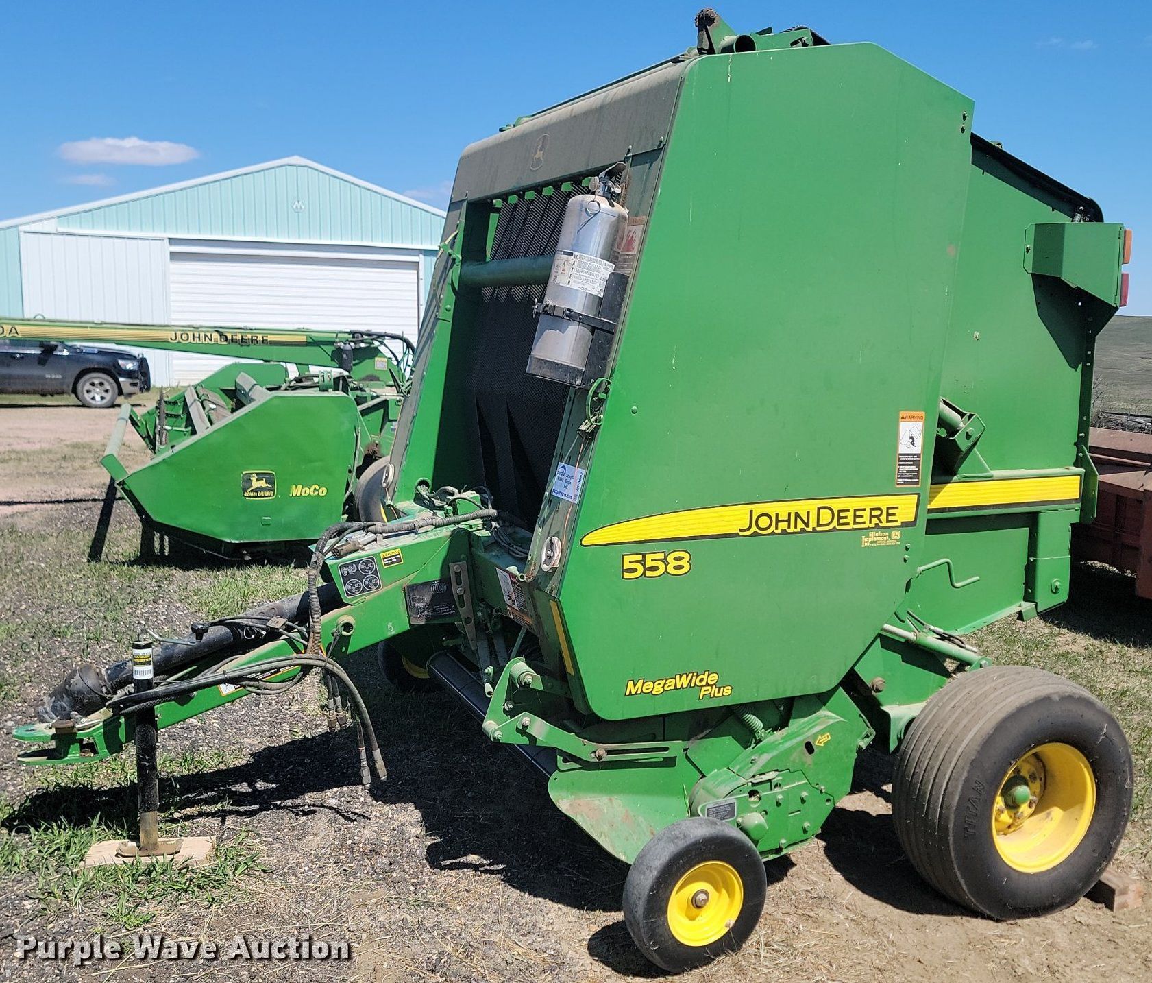 Purple Wave is selling a used Round Baler in South Dakota. This item is a 2007 John Deere 558 MegaWide Plus round baler with the following: Bale count: 11,242, Serial: E00558X334199
