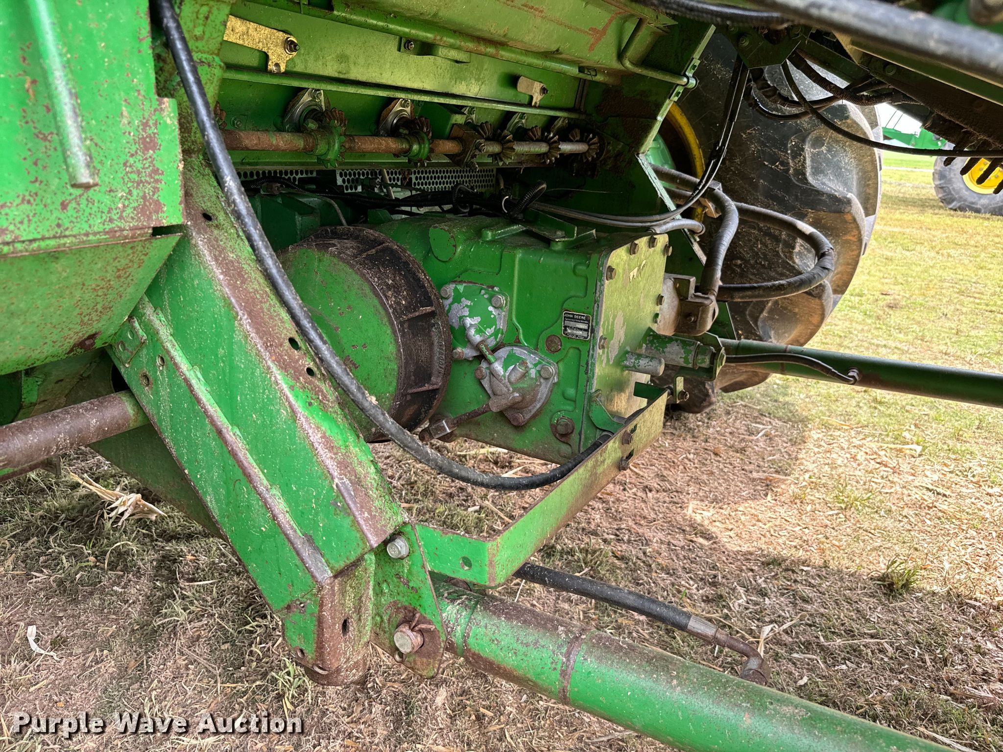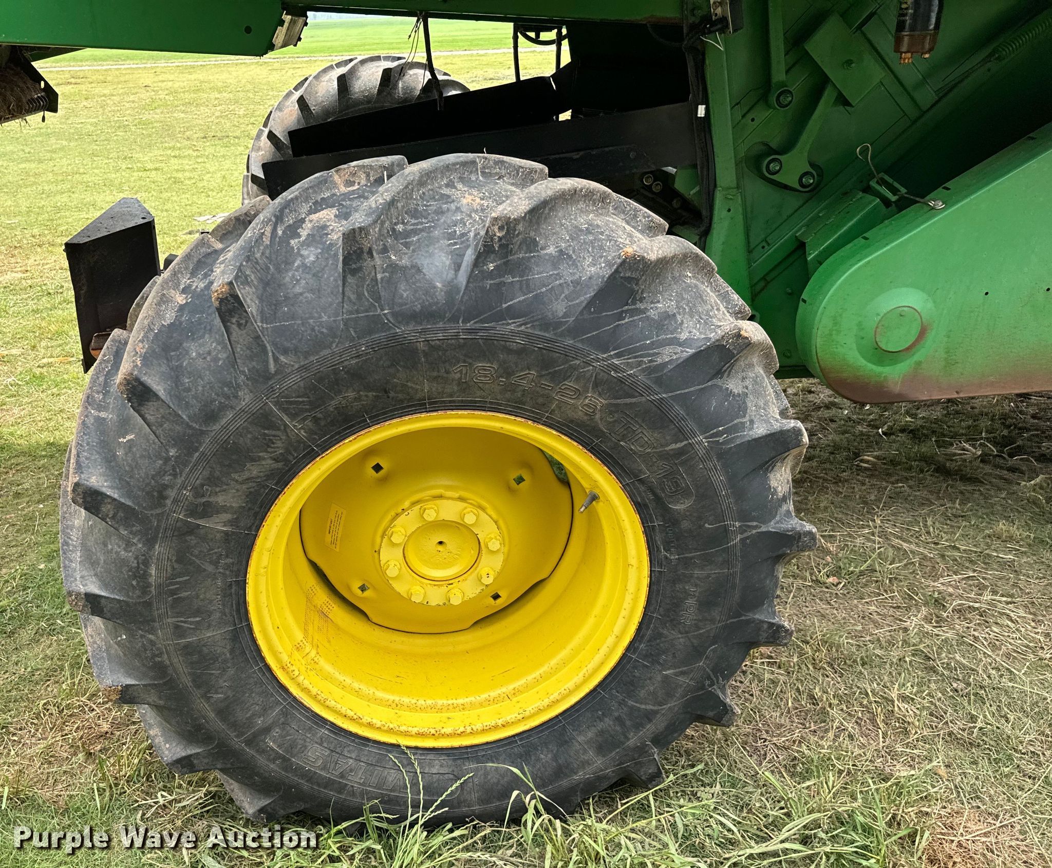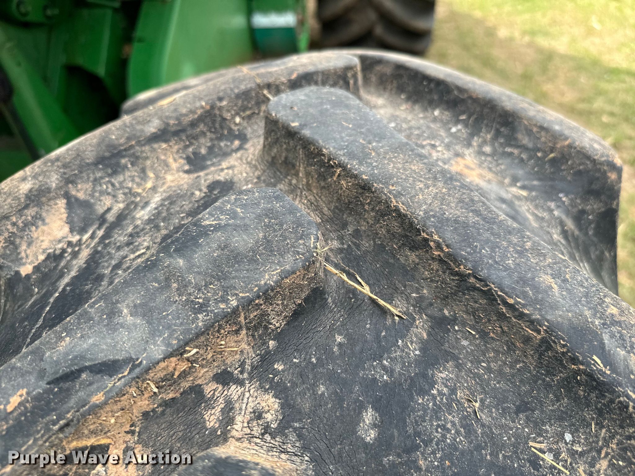 1997 John Deere 9500 RWA combine. Engine hours: 4,672 on meter, Serial: H09500X671735. Engine John Deere, Cylinders: 6, Fuel type: Diesel. Transmission Hydrostatic. Interior AC, Heat. Features Feederhouse: Reverser, Chaff spreader, Bin: Extensions. Tires Front: 800-65R32, Rear: 18.4-26. JKT Farms. 1138 Hyde Lake Road. Bennington, OK 74723